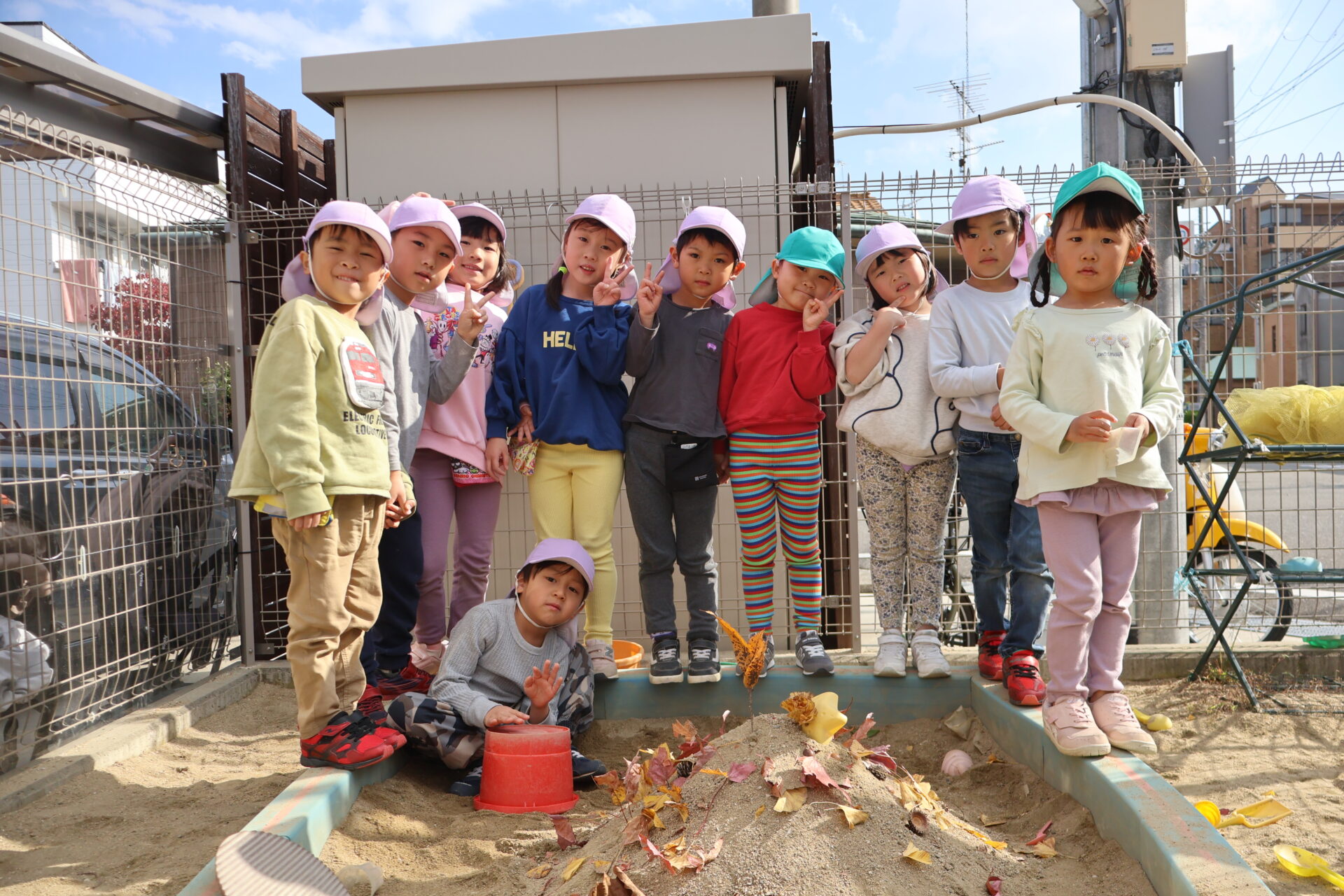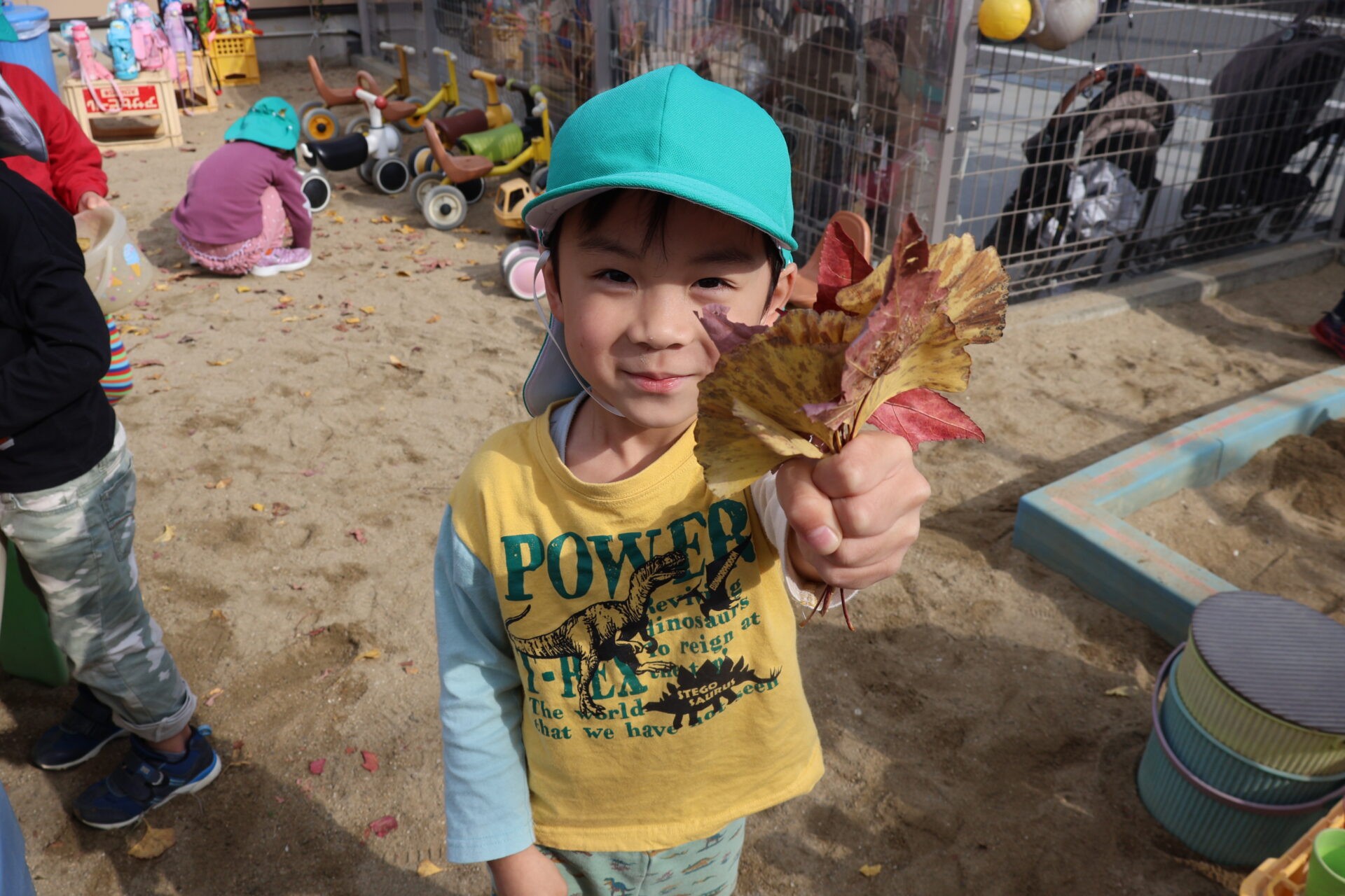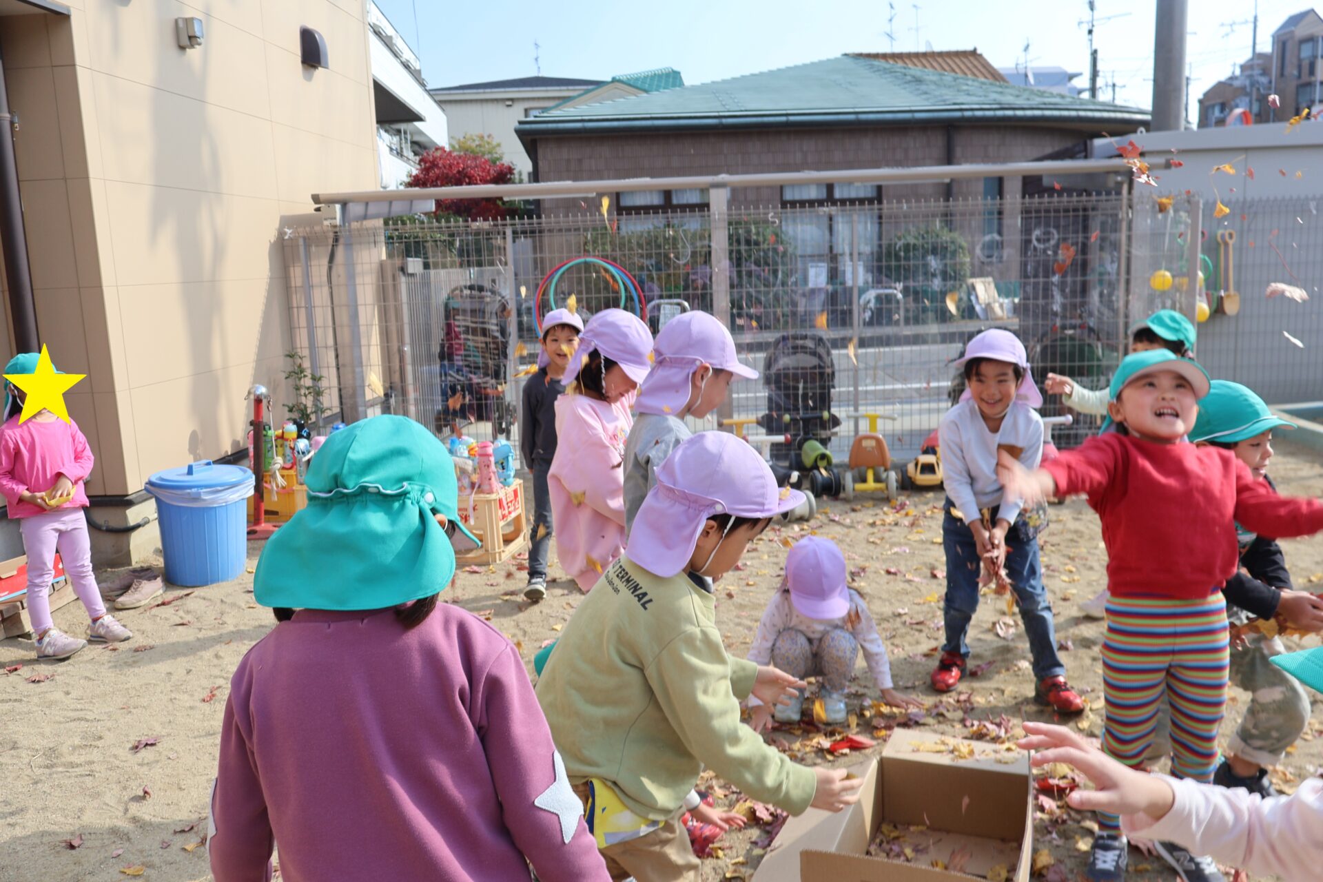 段ボールから落ち葉をすくいあげると、「見てみて!!葉っぱのシャワー!!」と言って、落ち葉が降り注ぐ様子を楽しんでいました🍂
