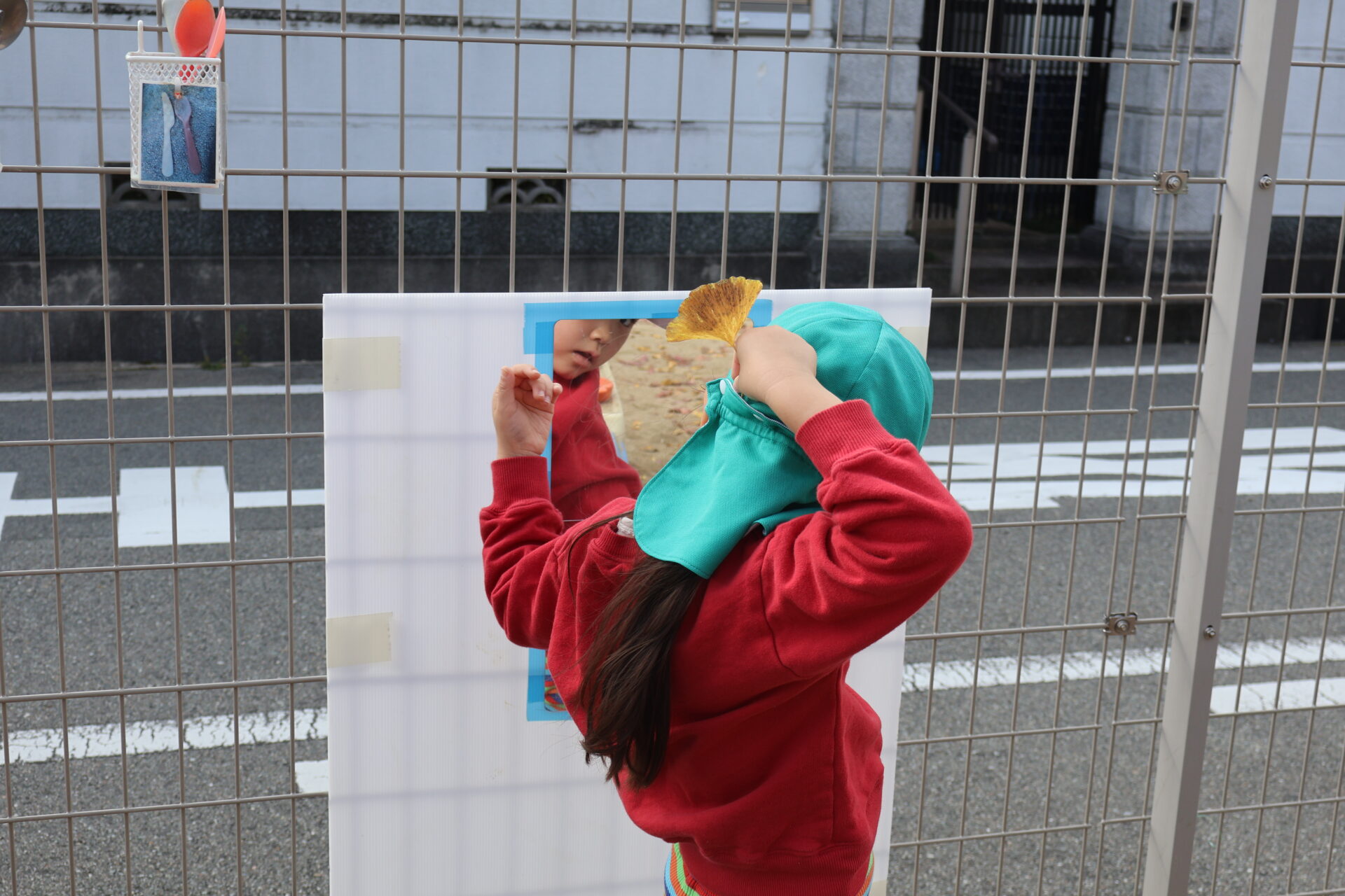 お友だちがつけているのを見て、「私もつけて欲しい!」とイチョウの葉を持ってきて、付け合いっこがスタート!ヘアメイク屋さんに変身していました。
