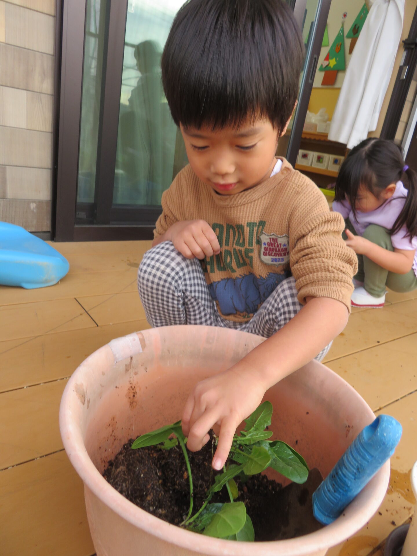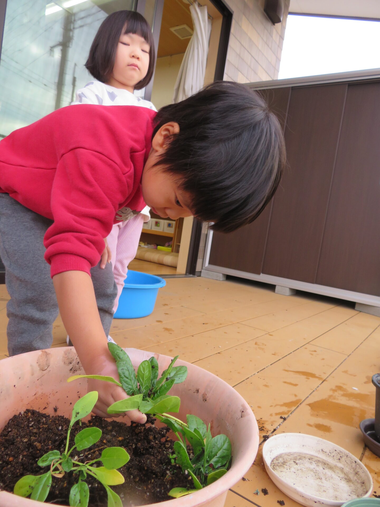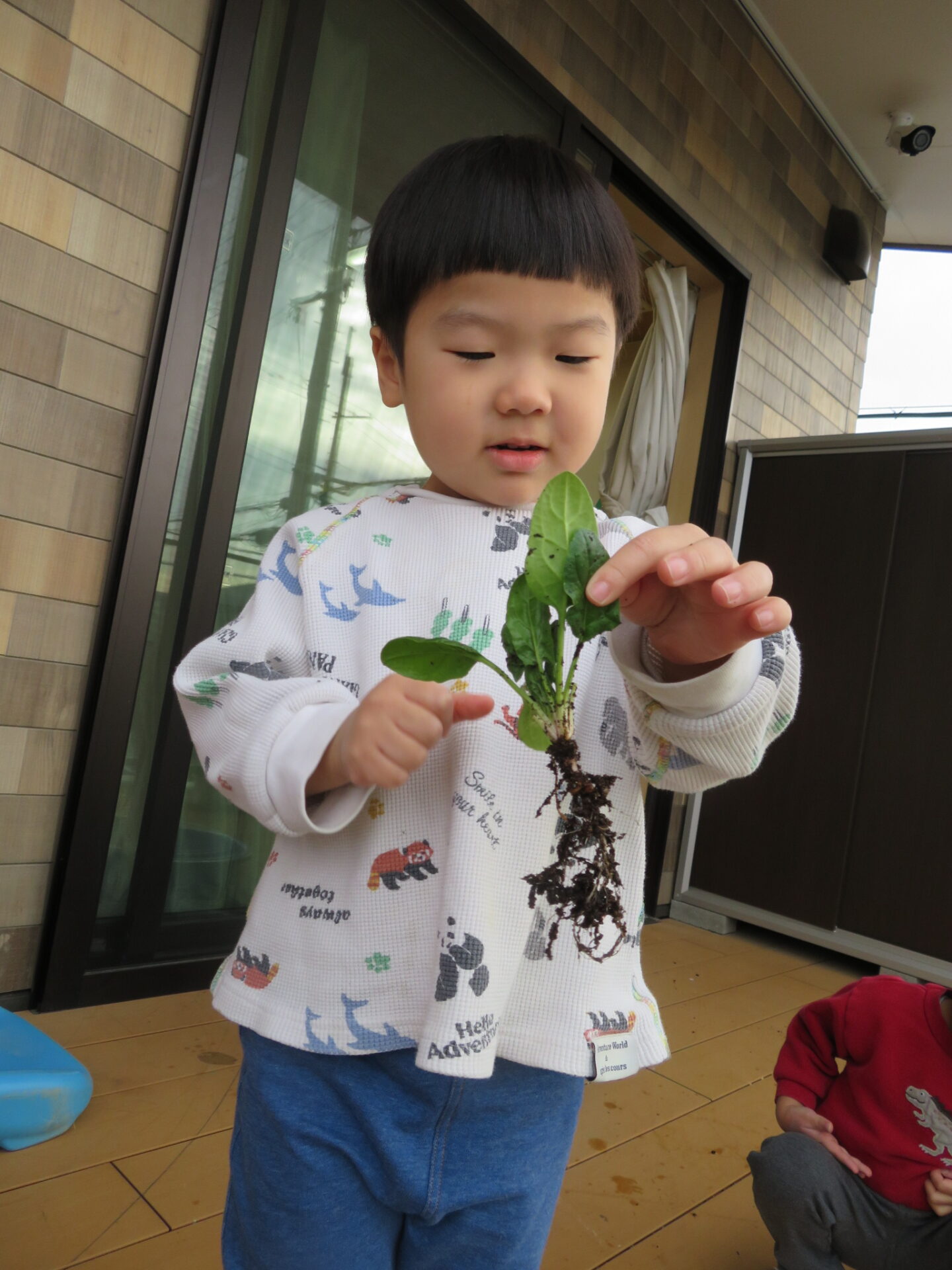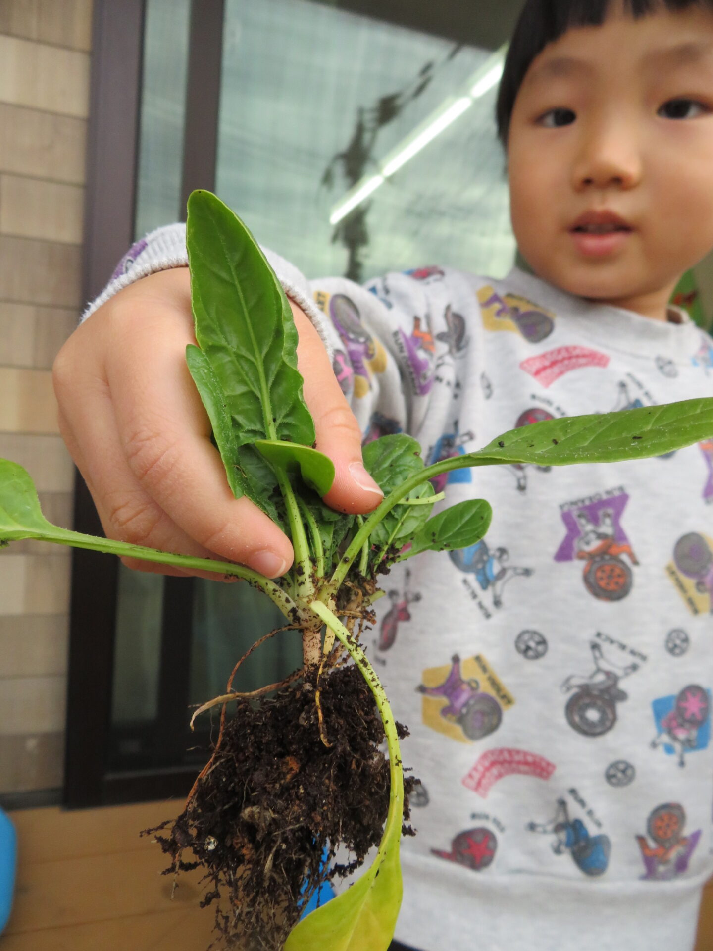 3歳児クラスの子ども達が育てたほうれん草は、スーパーに売られているものよりもサイズは小さいですが、プランターの中に強く根を張り、逞しく育ちました。