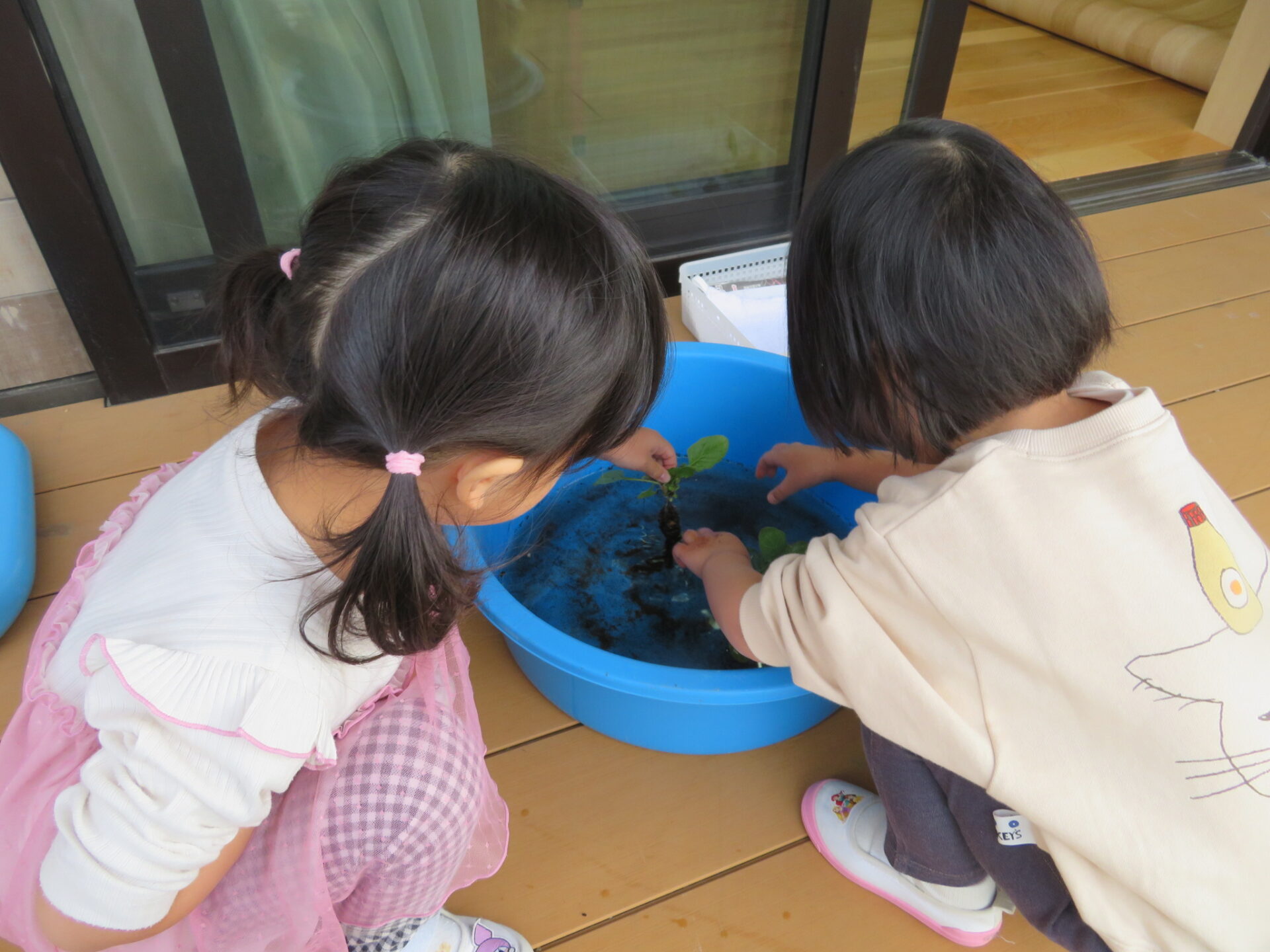 「なんか、面白い形してる。冷たい」と葉っぱの感触や、根っこの形に興味を持ち観察していました。