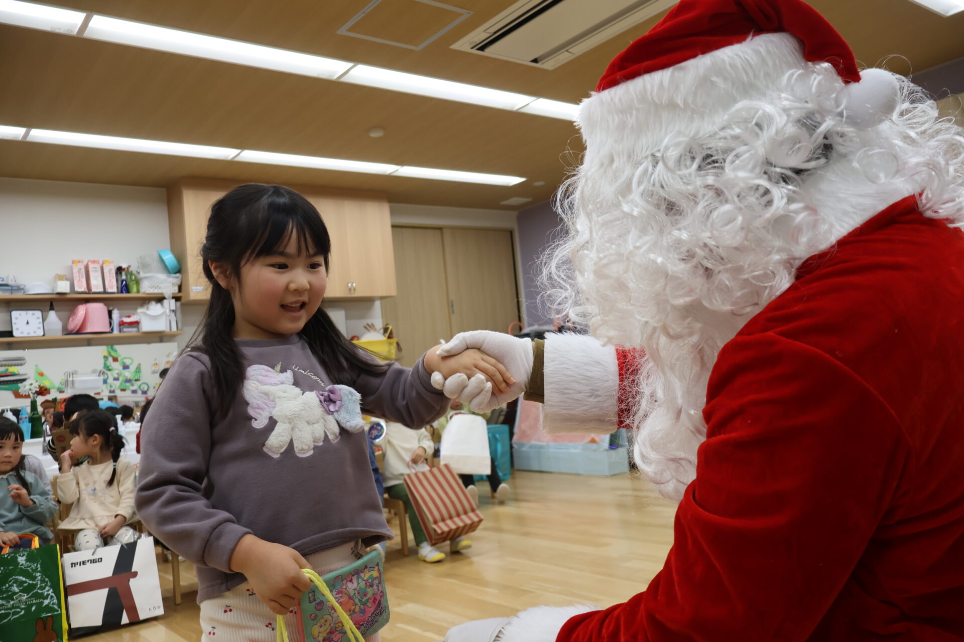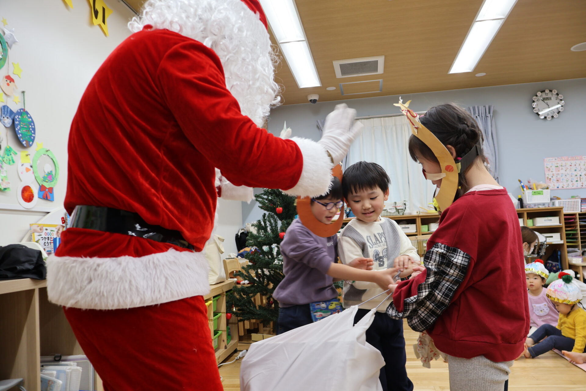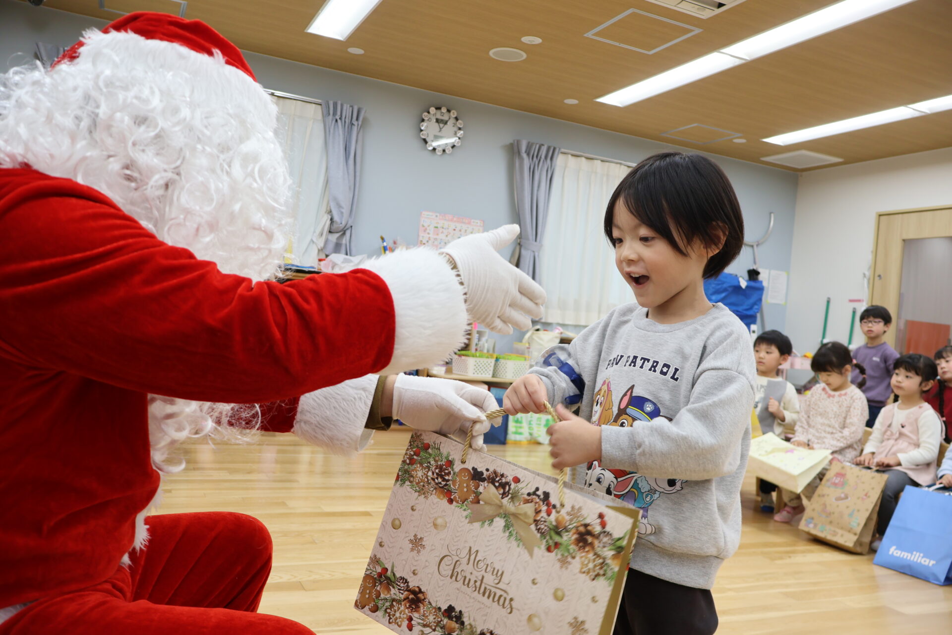 くじら組(5歳児)さんまで、クラスの代表がサンタさんから直接プレゼントをもらいました。