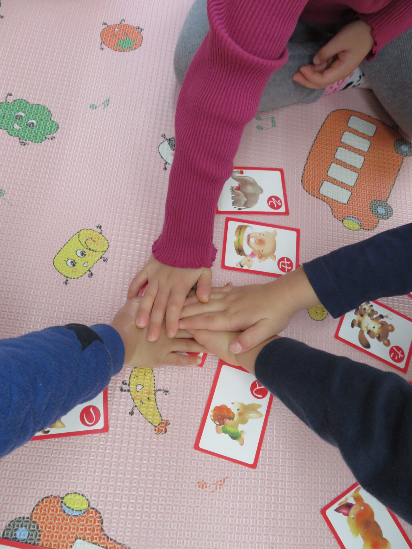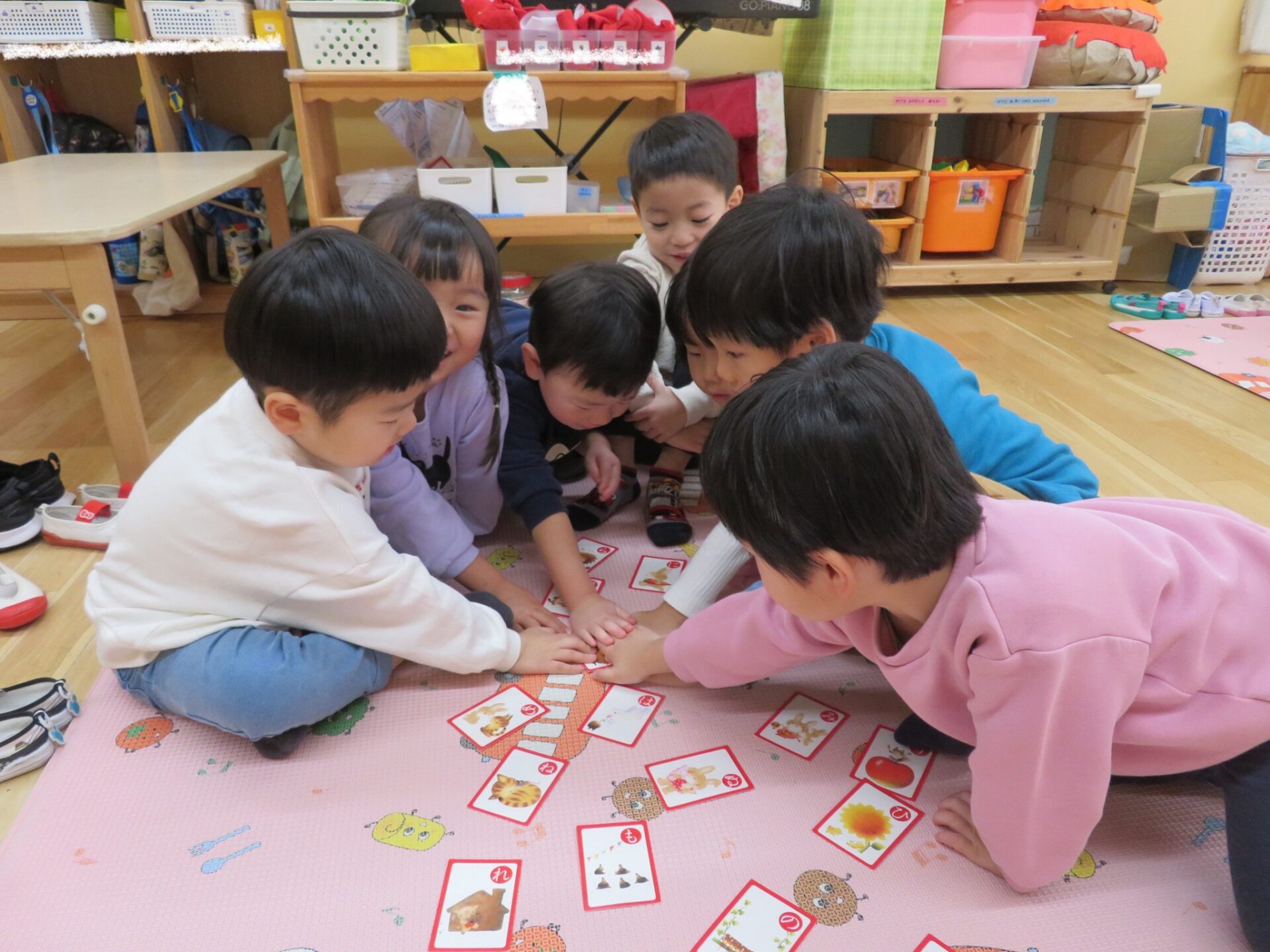 このように手が重なってしまう場面はたくさんありましたが、『手が重なった時は、取り札に一番最初に手を置いた人の勝ち』というルールを伝えていた為、「〇〇君が一番下だね」と子ども同士で声を掛けていました。