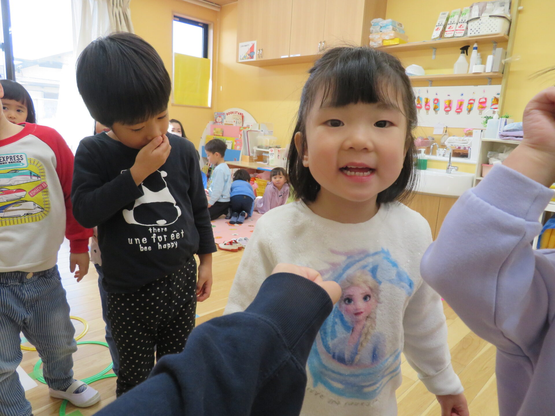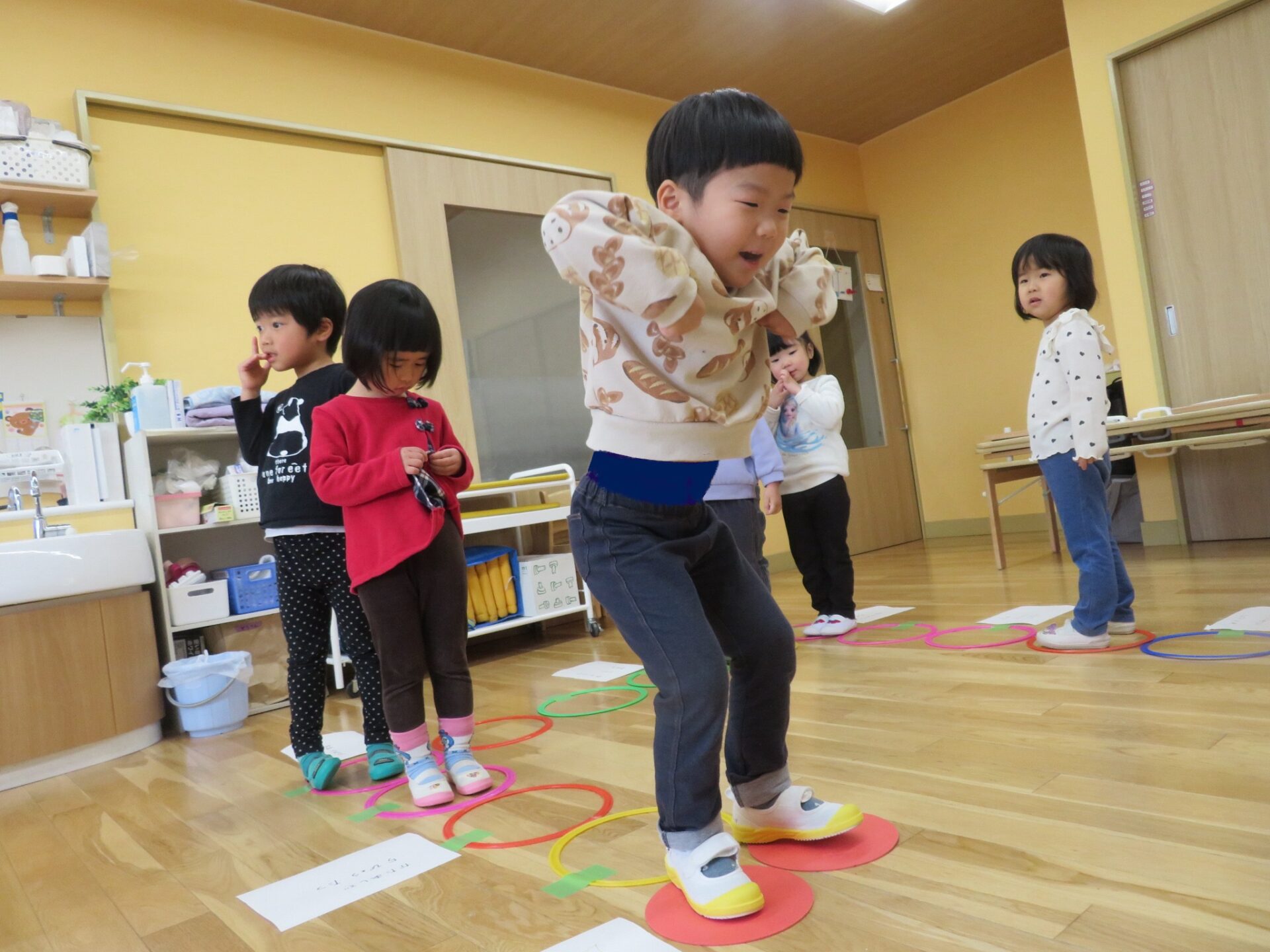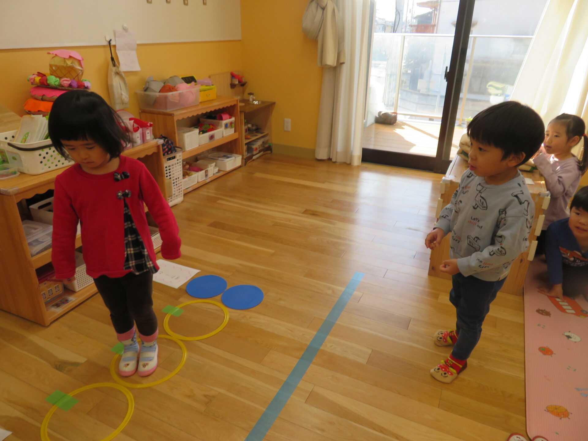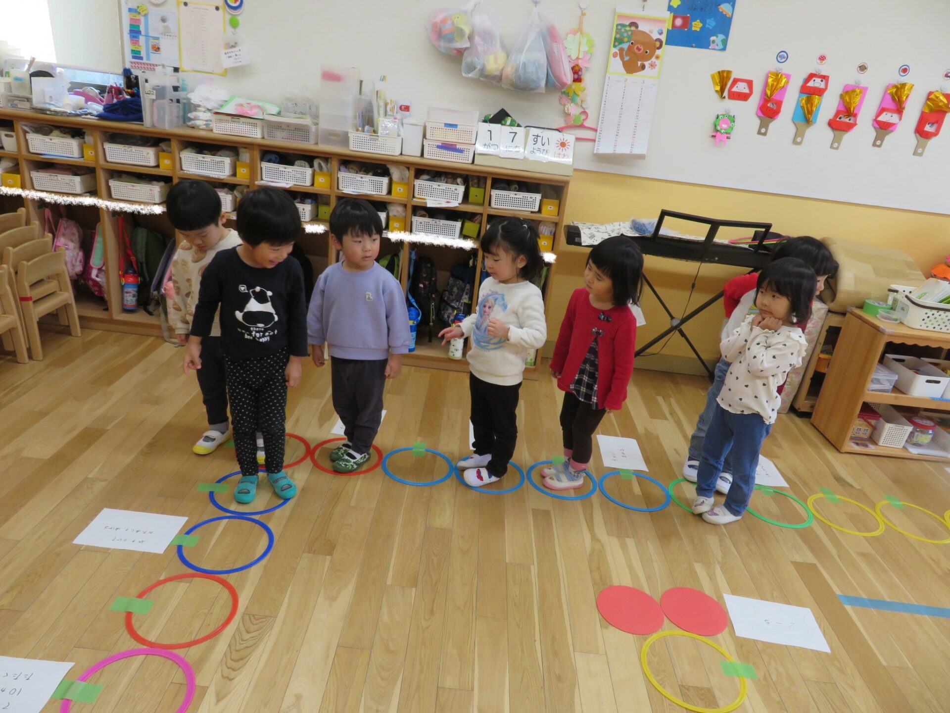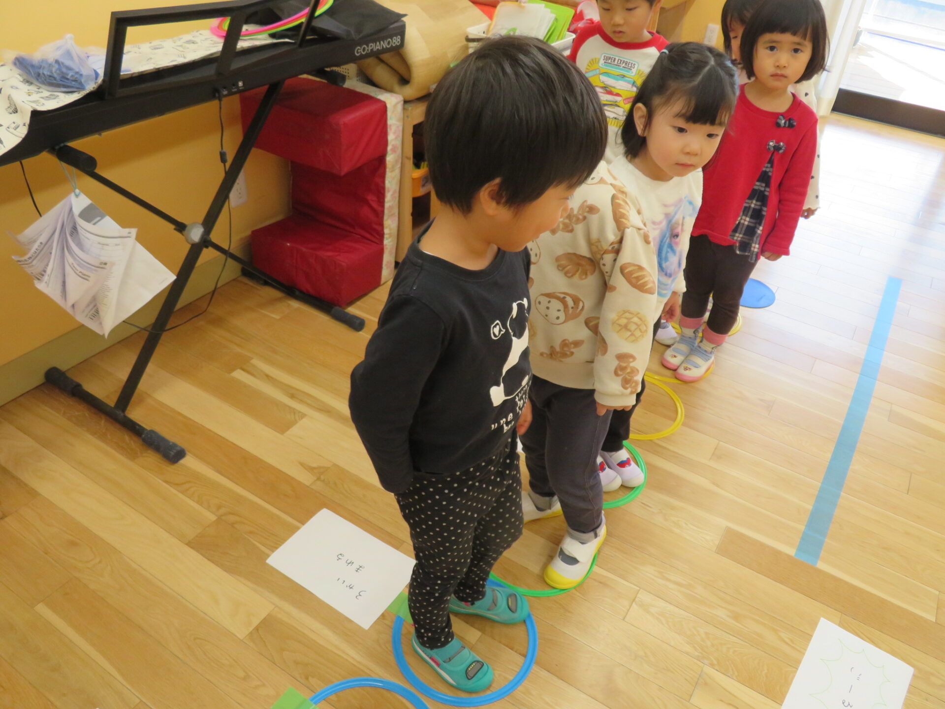 『3回まわる』という指示では、「い〜ち、に〜、さ〜ん」と周りのお友だちが一緒に数を数えていました。