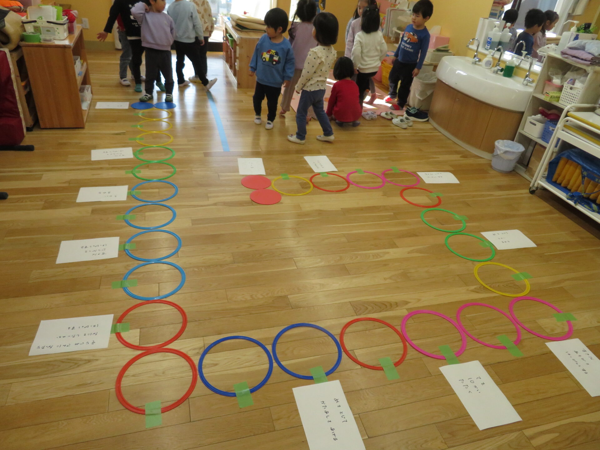 今回の双六遊びはボード状で行うものではなく、子ども達自身がコマになって動くという内容で遊びました。