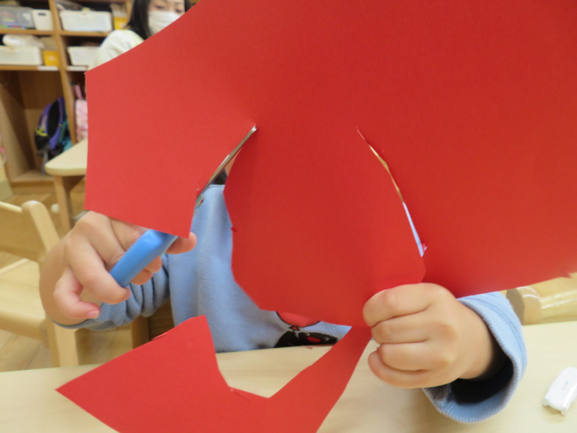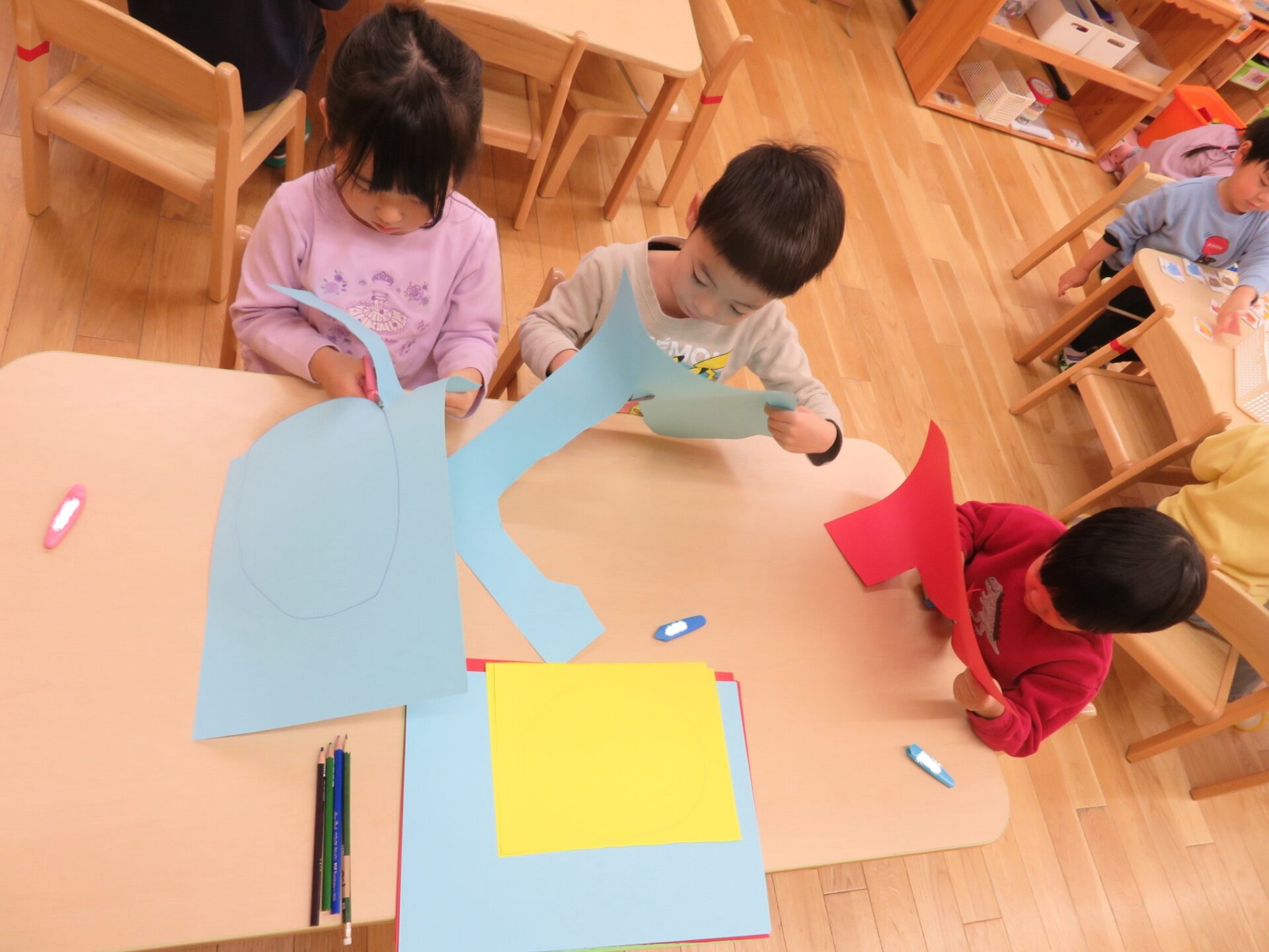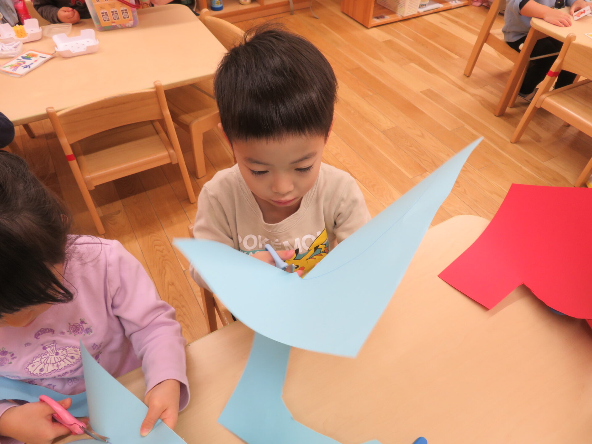 秋の製作から、ハサミを使って大きい形を切る取り組みを始めました。