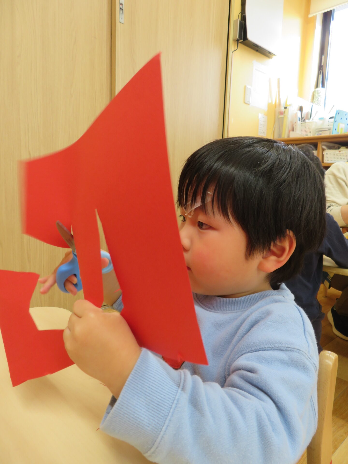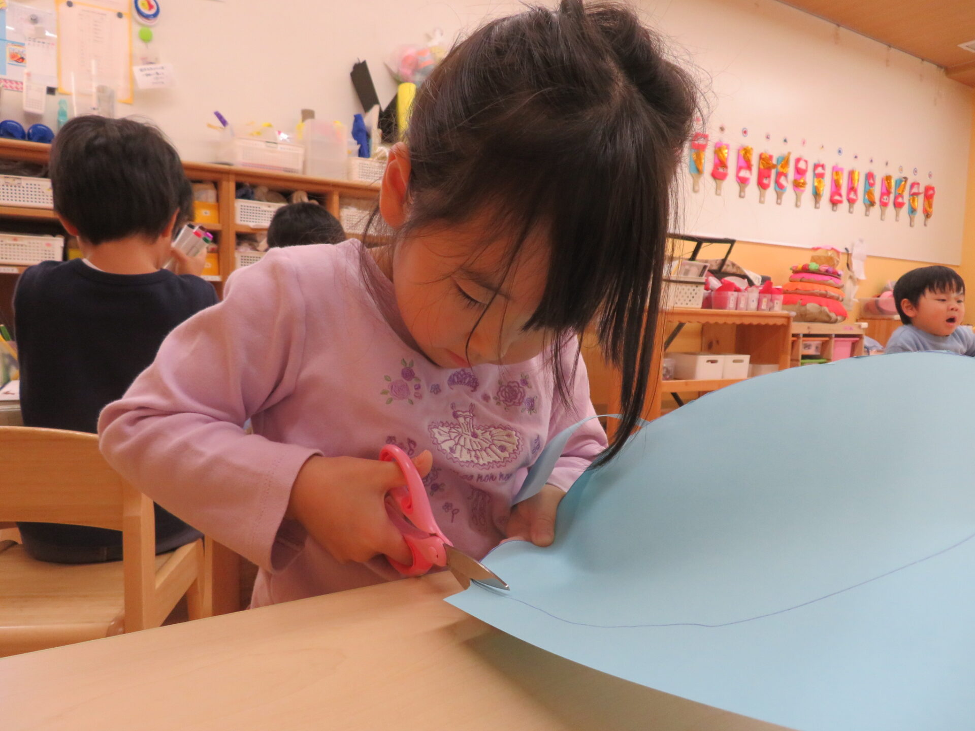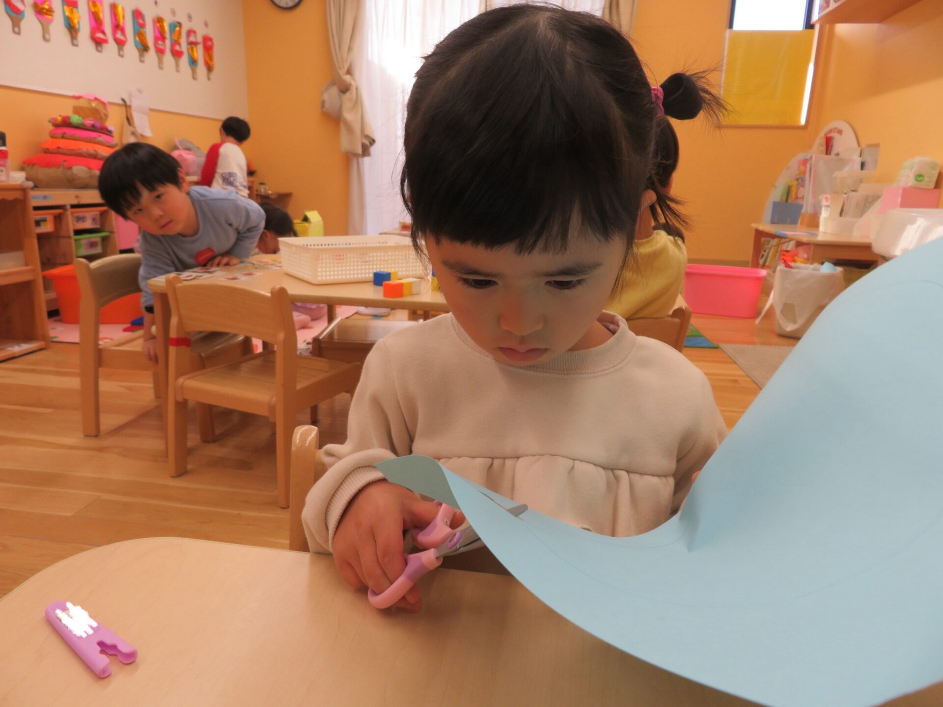 ハサミは難しい‥、でも頑張っています!(3歳児)