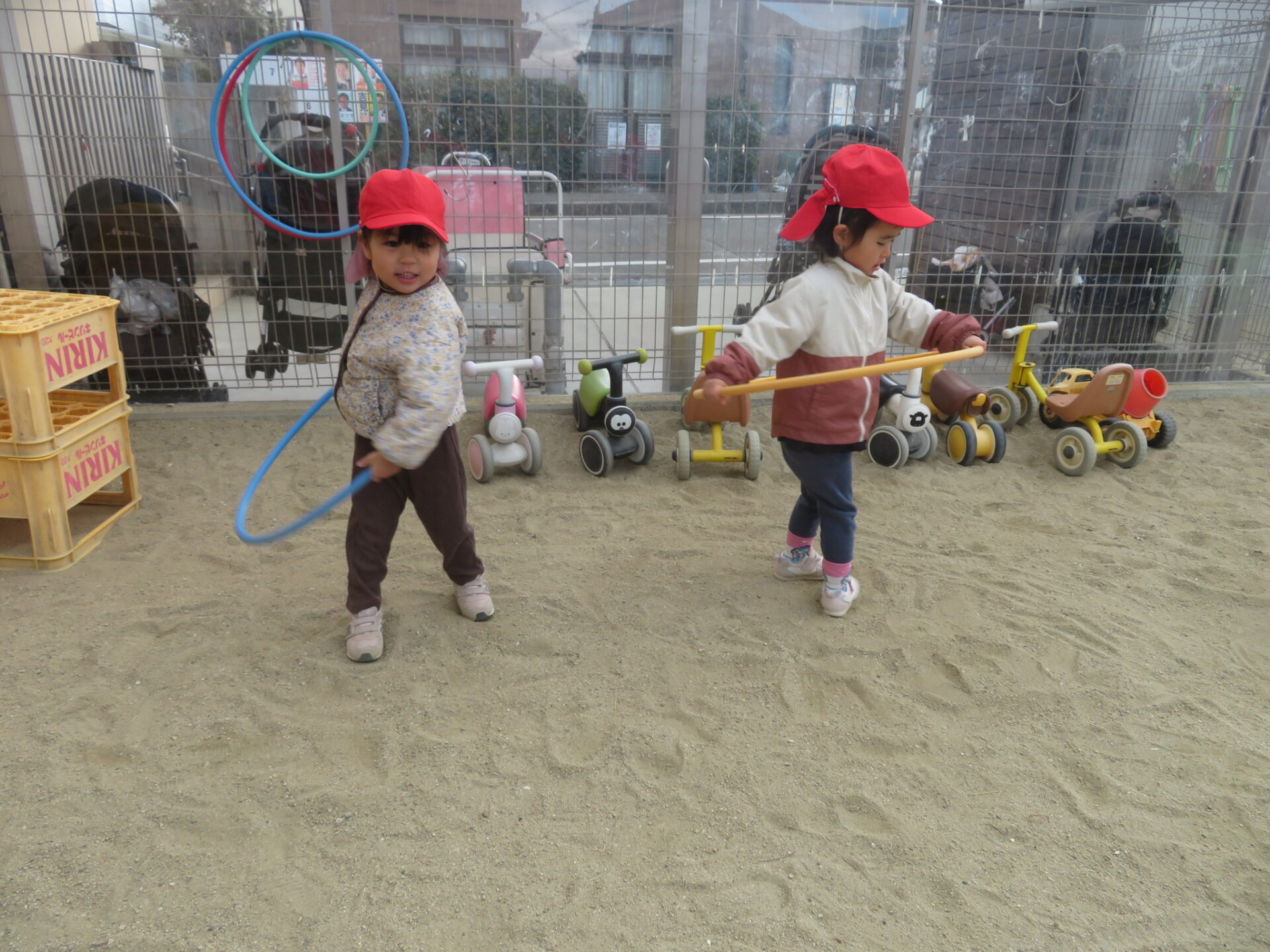 秋頃はフラフープを転がして楽しんでいた子ども達ですが、今では数秒間腰で回せるように成長しました。