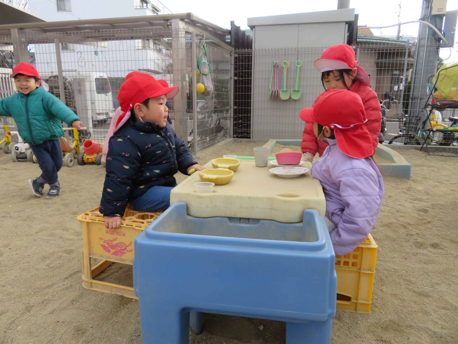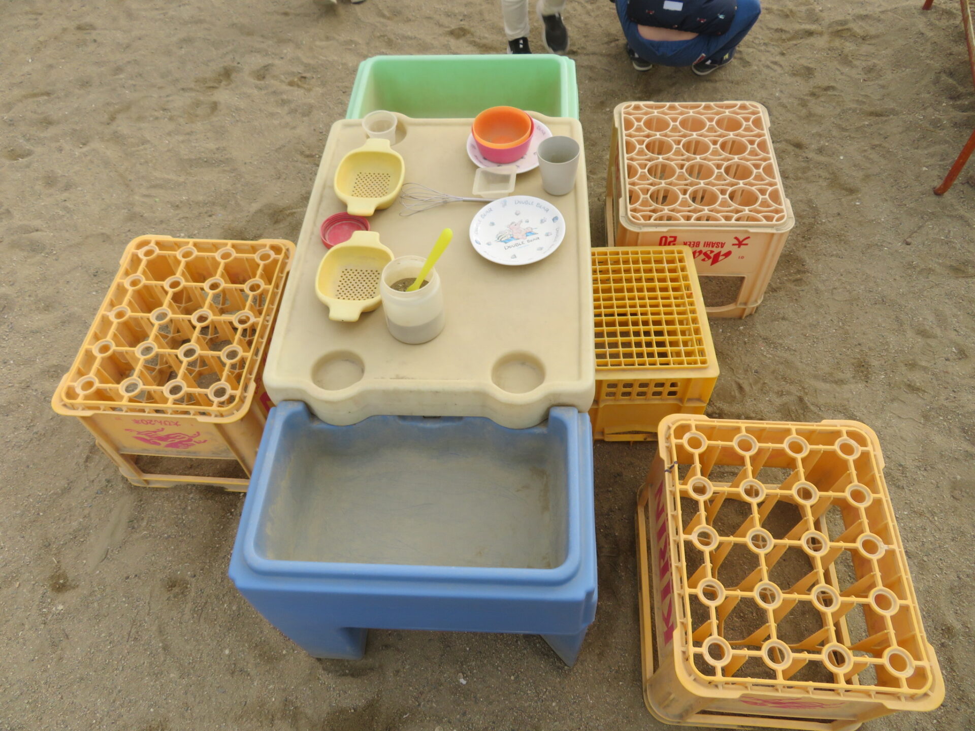 瓶ケースを運び、砂場のスペースへお引越しです。