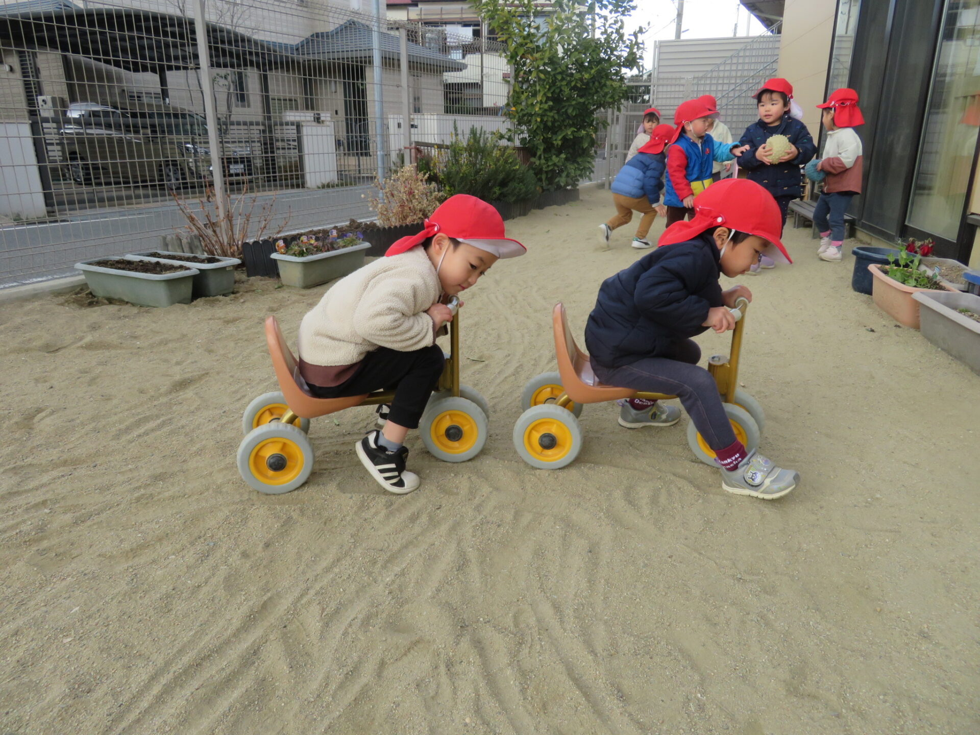 「もっと、早く行けるんじゃない?!」「よ〜し、負けないぞ〜!」と三輪車競争も始まりました。
