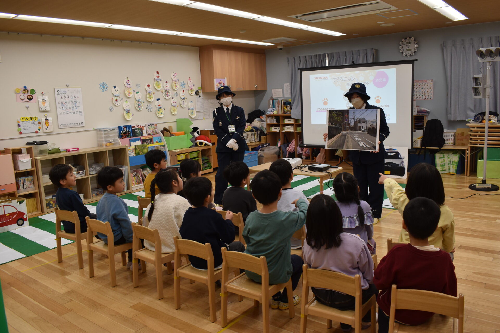 ビデオのあとは、市役所の方がみんなの目の前で横断歩道を使って正しい渡り方を実演してくれました。渡る時の約束事を聞かれると、しっかり答えることができている子ども達です!