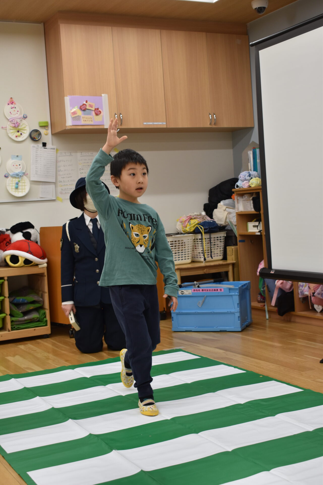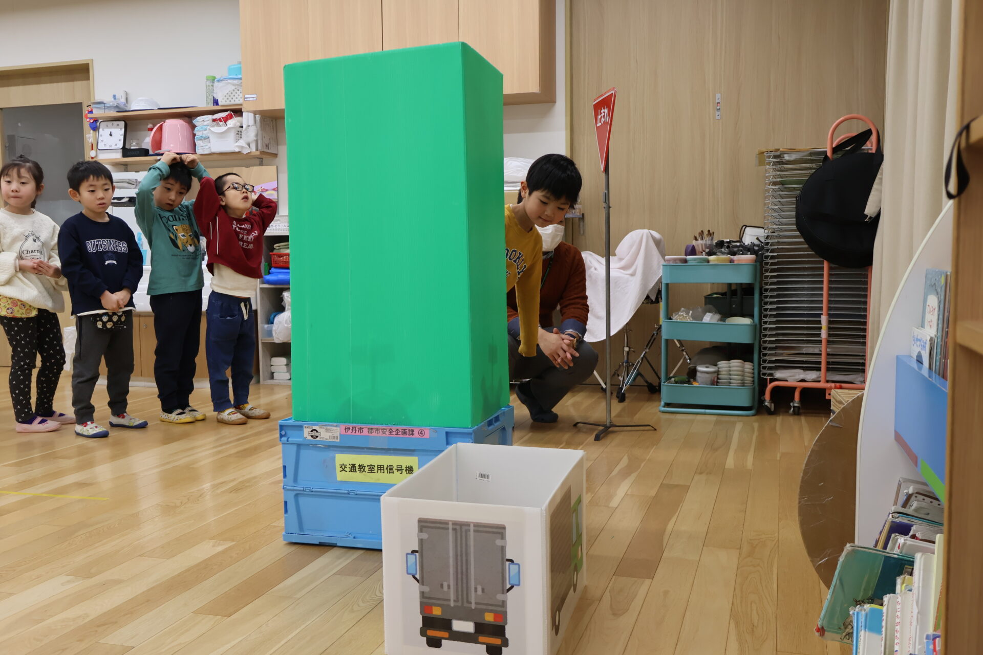 保育室に横断歩道や信号機が少しずつ設置されているのを見ると、「え、本物みたい?!」と興味津々👀