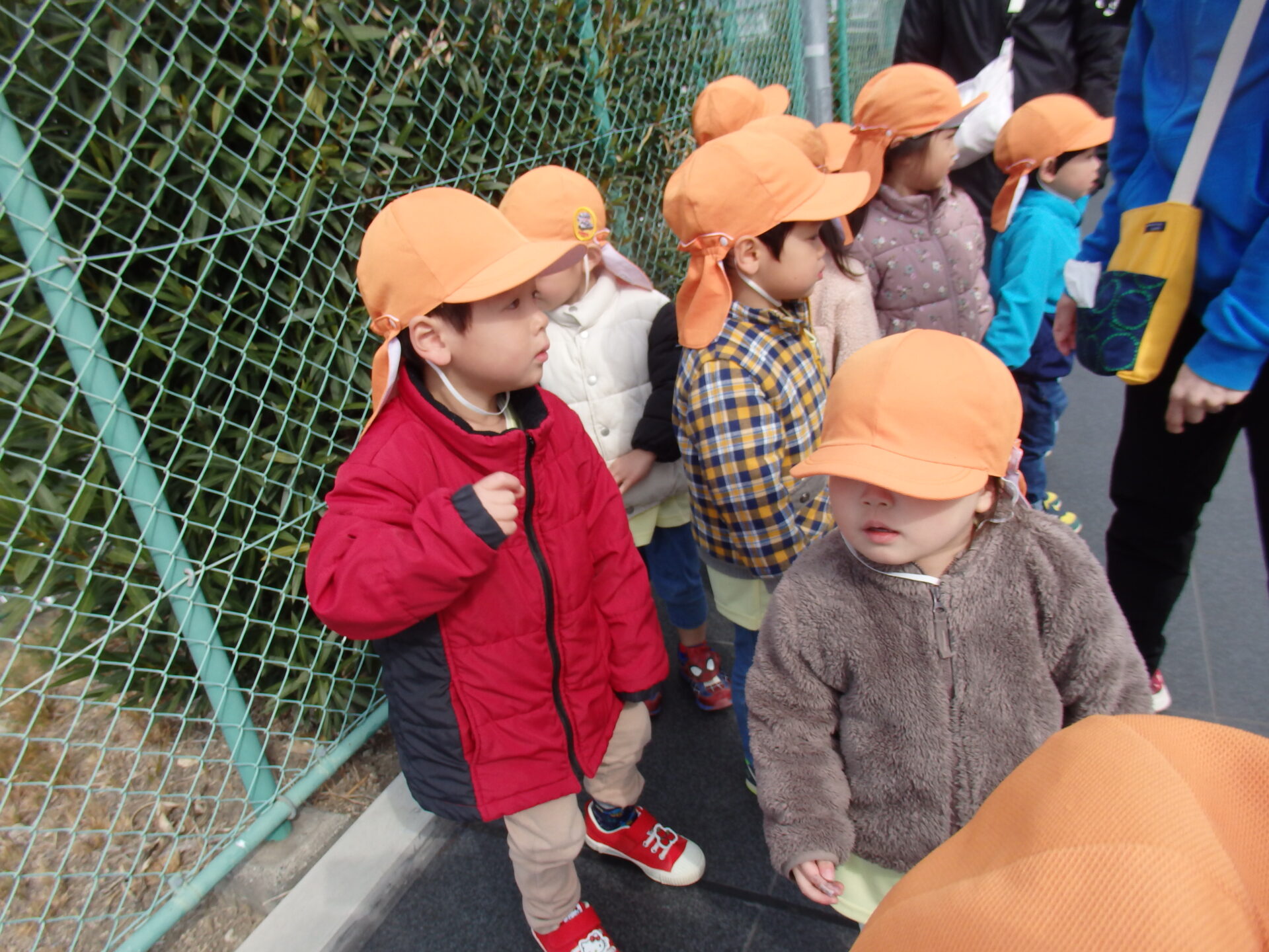 まずは、園を出る前に、電車に乗る時や公園での過ごし方のお約束事をみんなで確認しました。「電車の中ではどうしたらいいと思う?」と聞くと、「静かにする!」と一斉に返事がありました👏