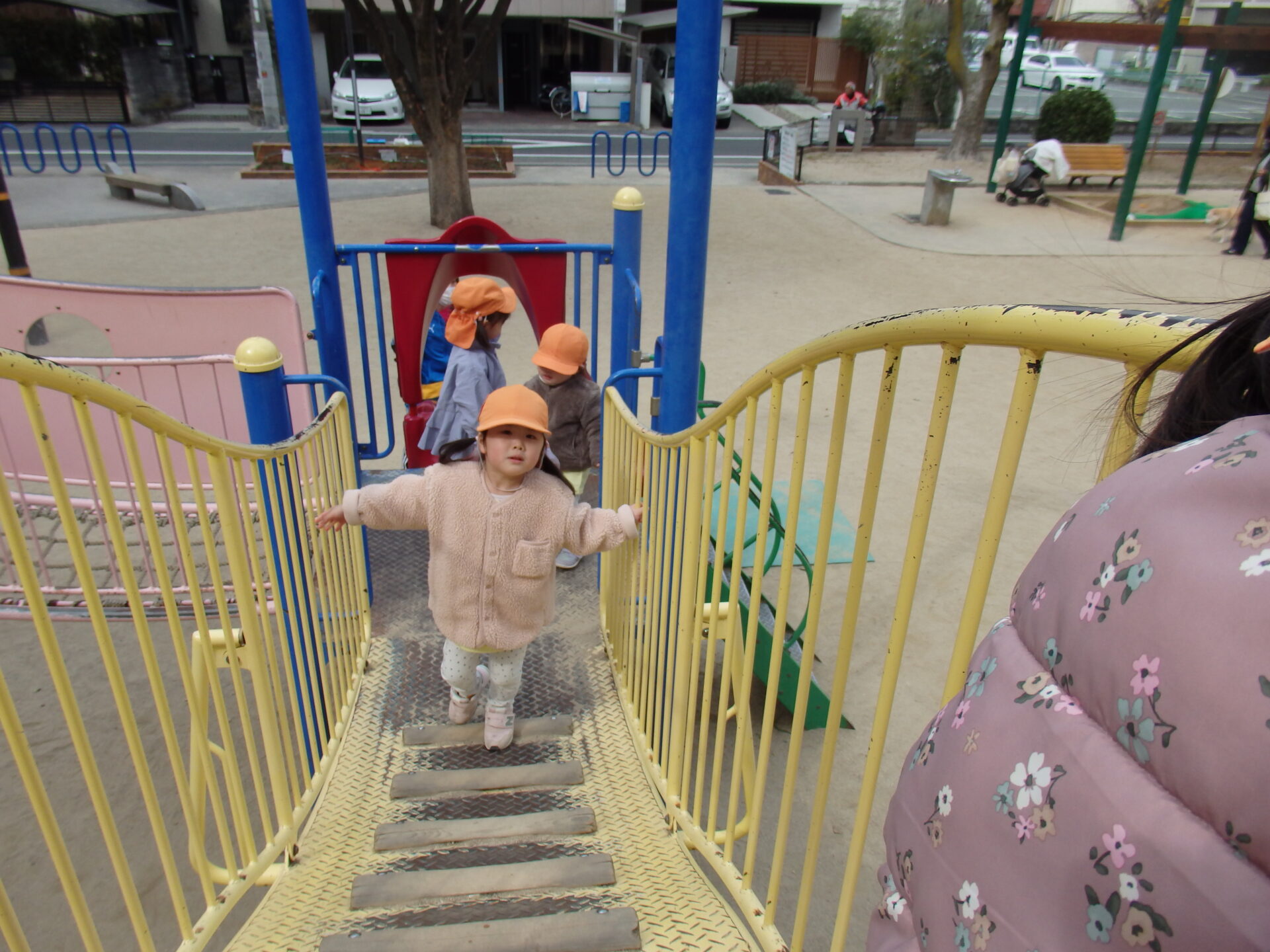 無事に伊丹駅に到着して、公園に向けて出発しました。「公園遠い?」「もうすぐ?」などと話しているうちに、目的地の梅園公園に着きました。大きな遊具を前にして、目をキラキラさせていました✨