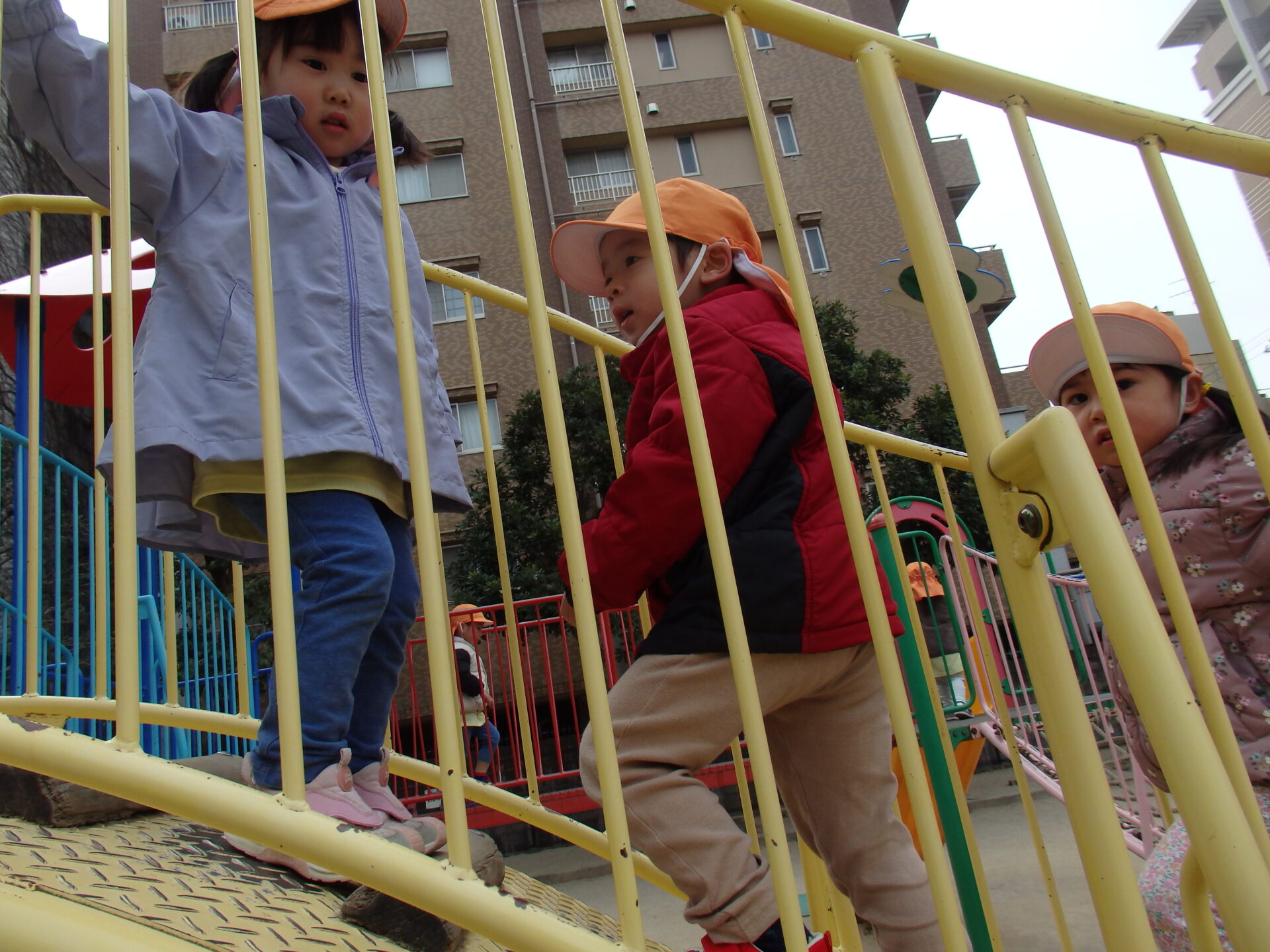 大きな遊具には、滑り台や橋などがあり、最初は不安そうな子も、友だちがチャレンジしているのを見て、「落ちないから大丈夫!先に行ってみるよ!」と友だちに励まされて挑戦していました。