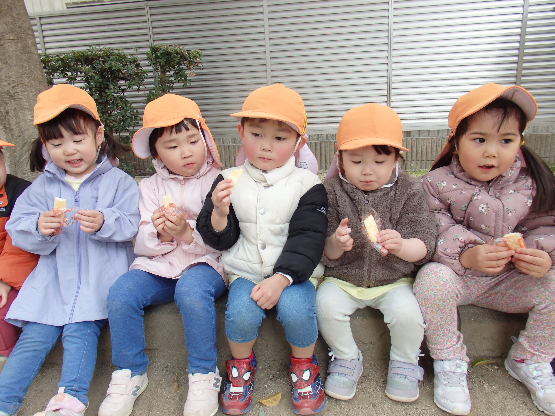 ラムネとおせんべいを食べました。みんなで外で食べるおやつは最高✨な気分になるようで、「また食べにいこうね。」と話していました。