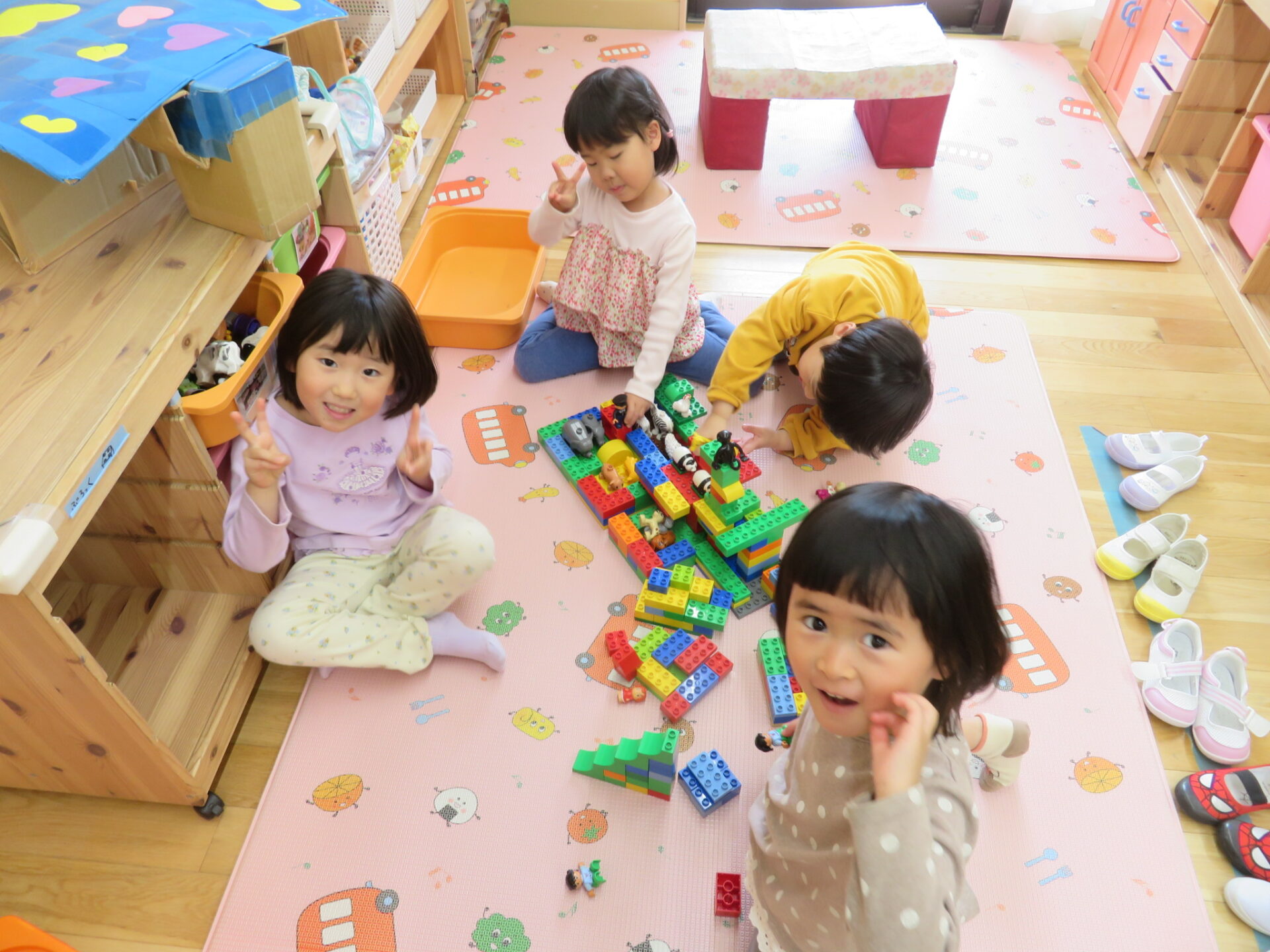 遠足の余韻を遊びの中で楽しんでいる3歳児の子ども達です。