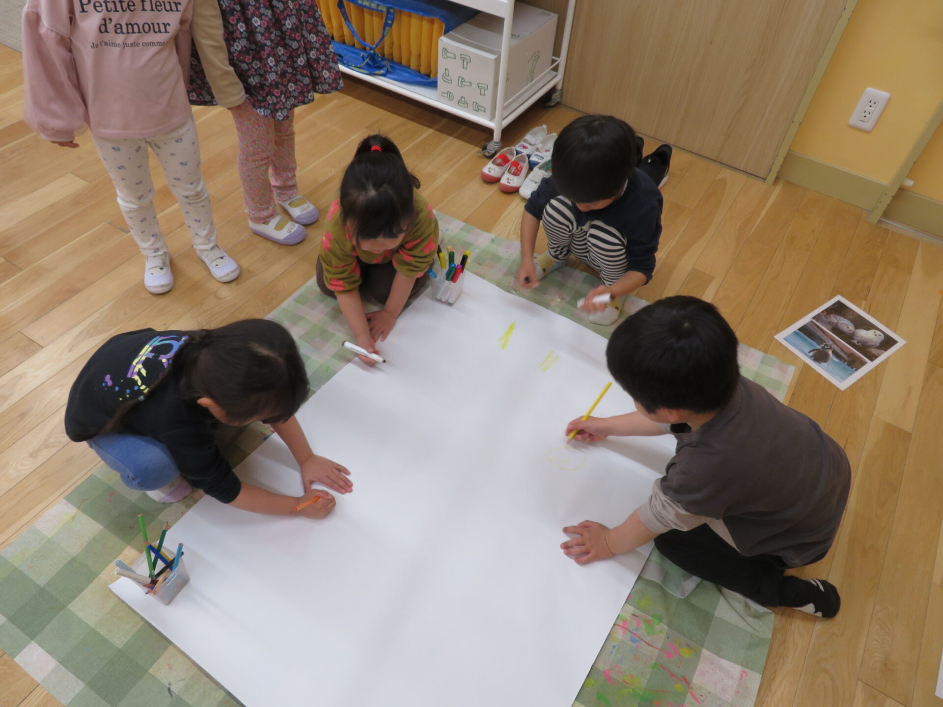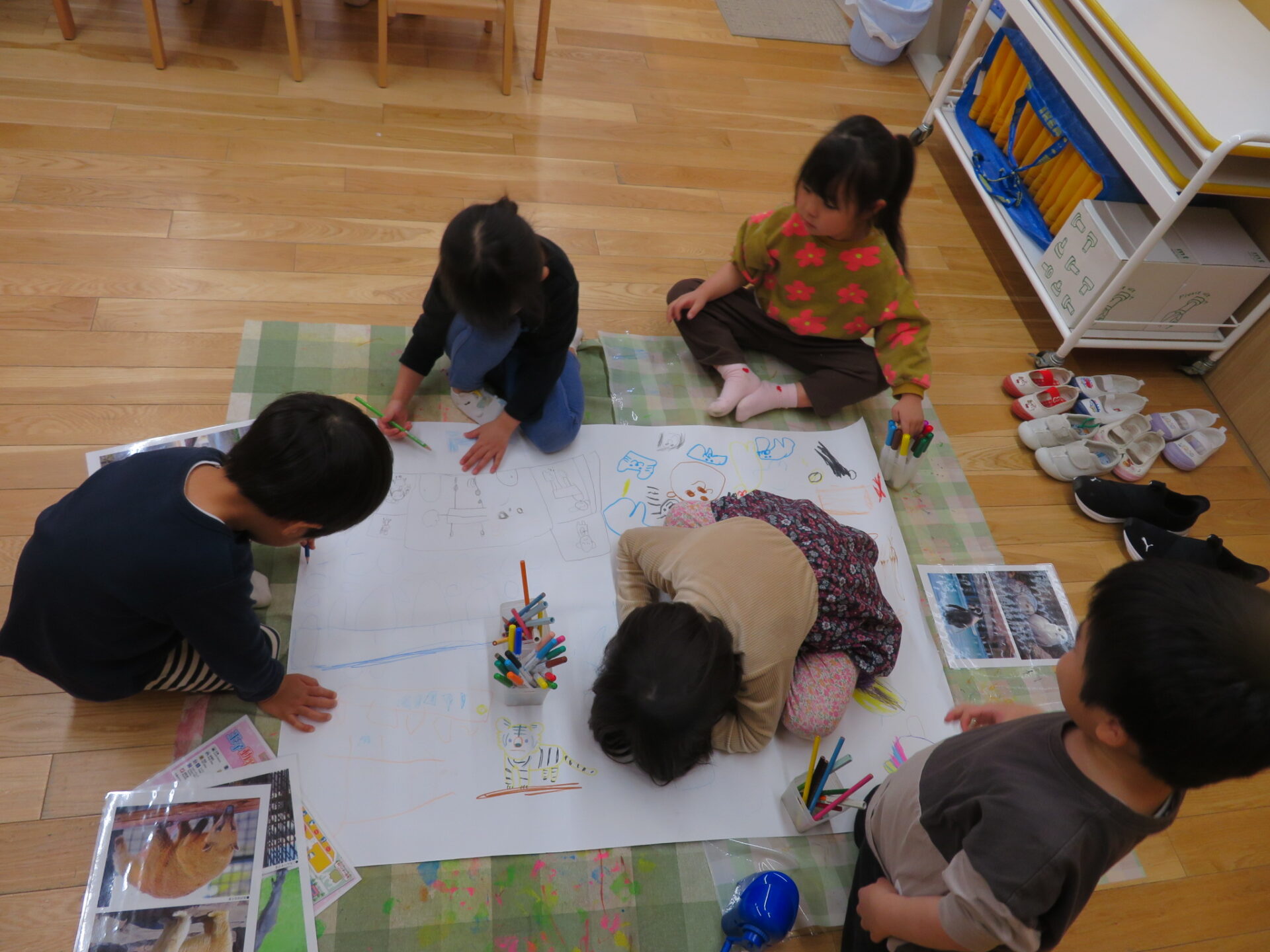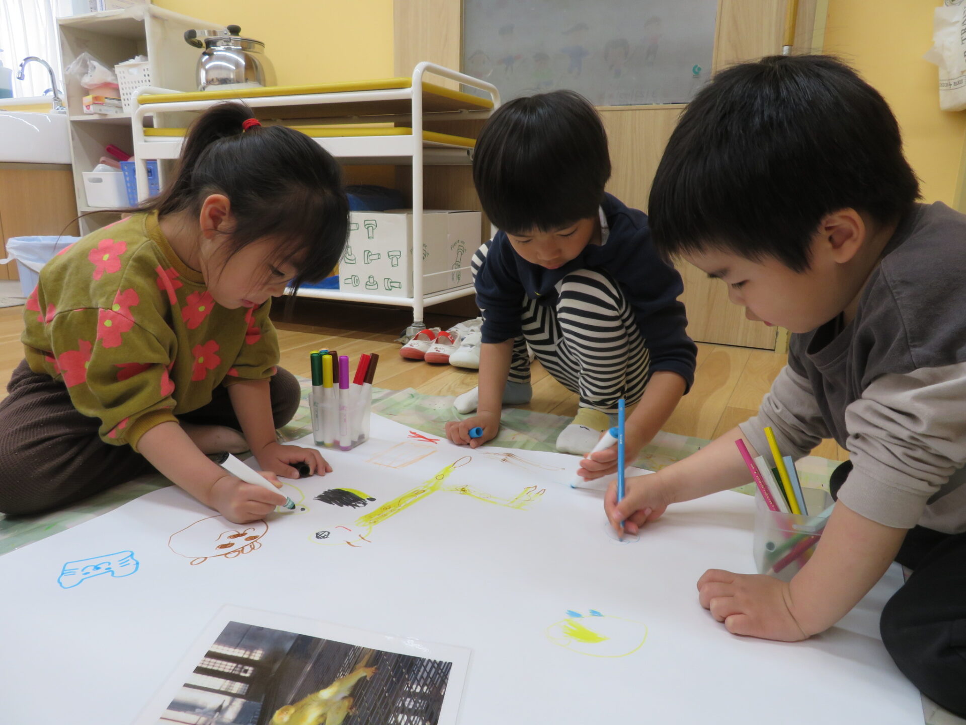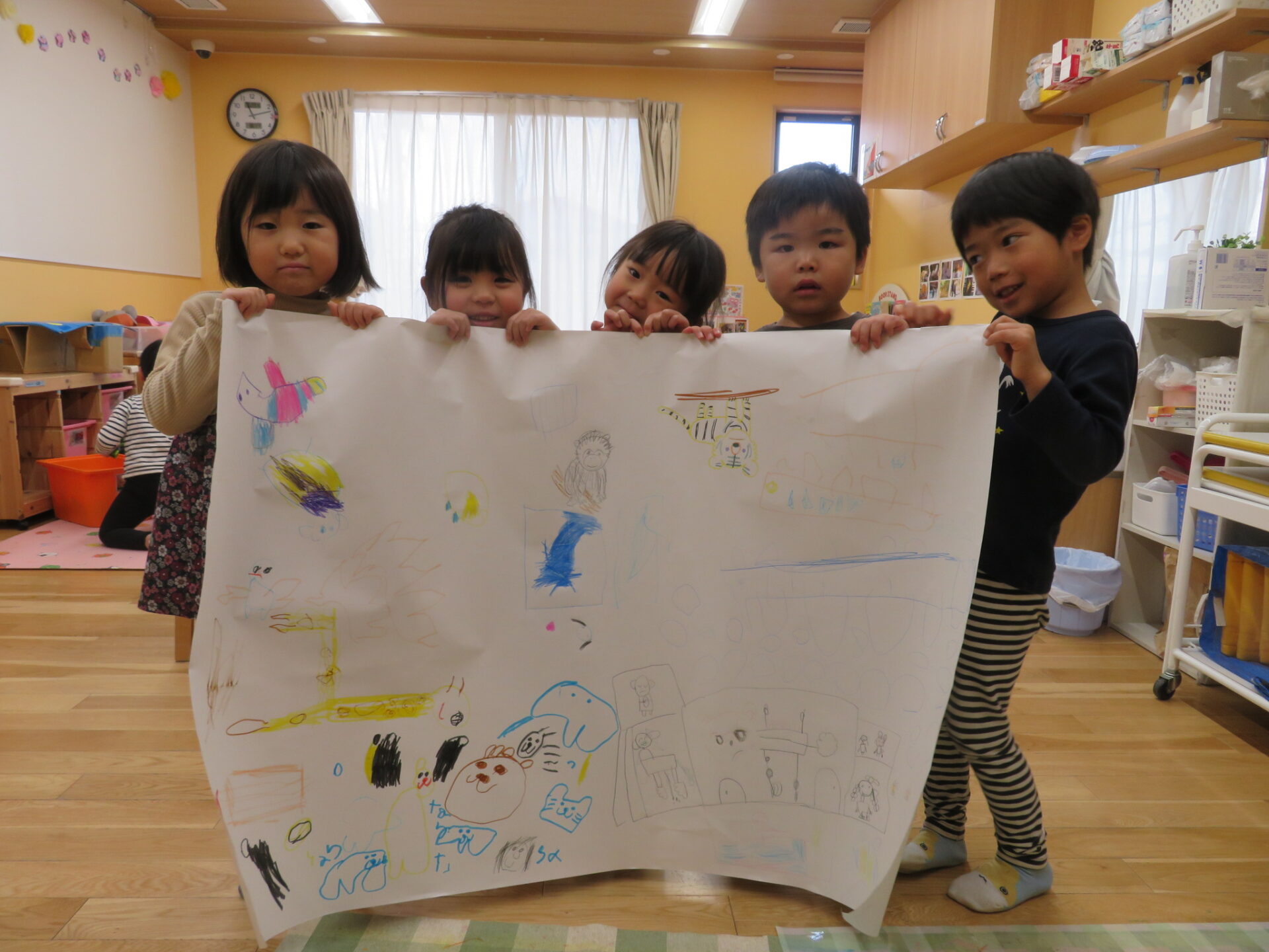 「阪急電車に乗ったの楽しかったね」「ぼくが電車描くよ」と、話して描いて、あっという間に真っ白だった模造紙は素敵な絵でいっぱいになりました。