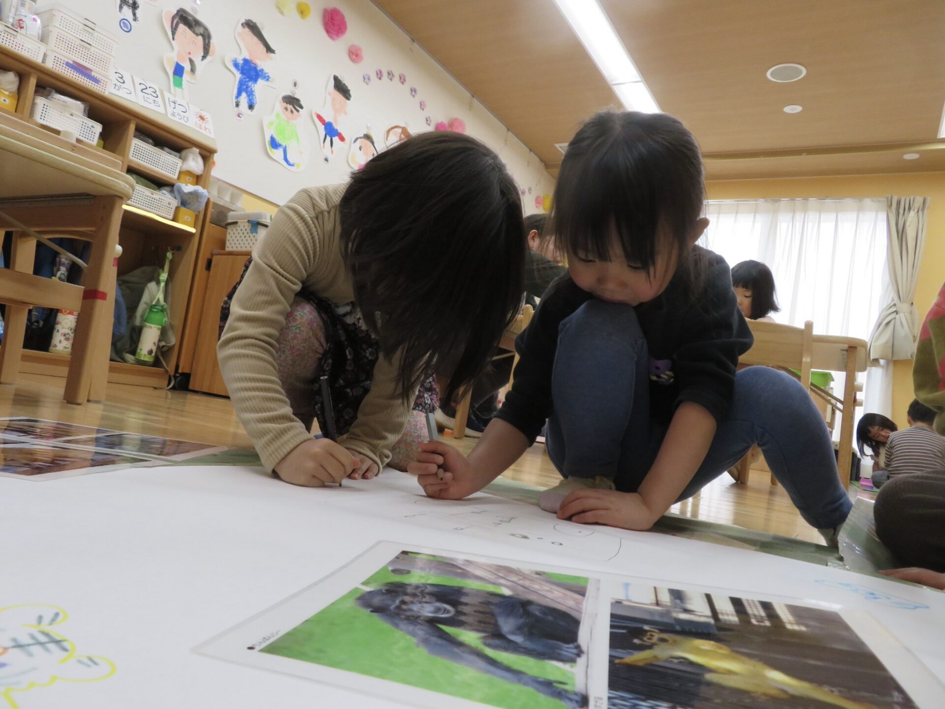 「キリン描きたい!」「じゃあ、私はトラにしよ〜」と、思い思いにペンを走らせ始めたお友だちの様子を遠くから少しずつ距離をつめ、見つめる2つの影‥。