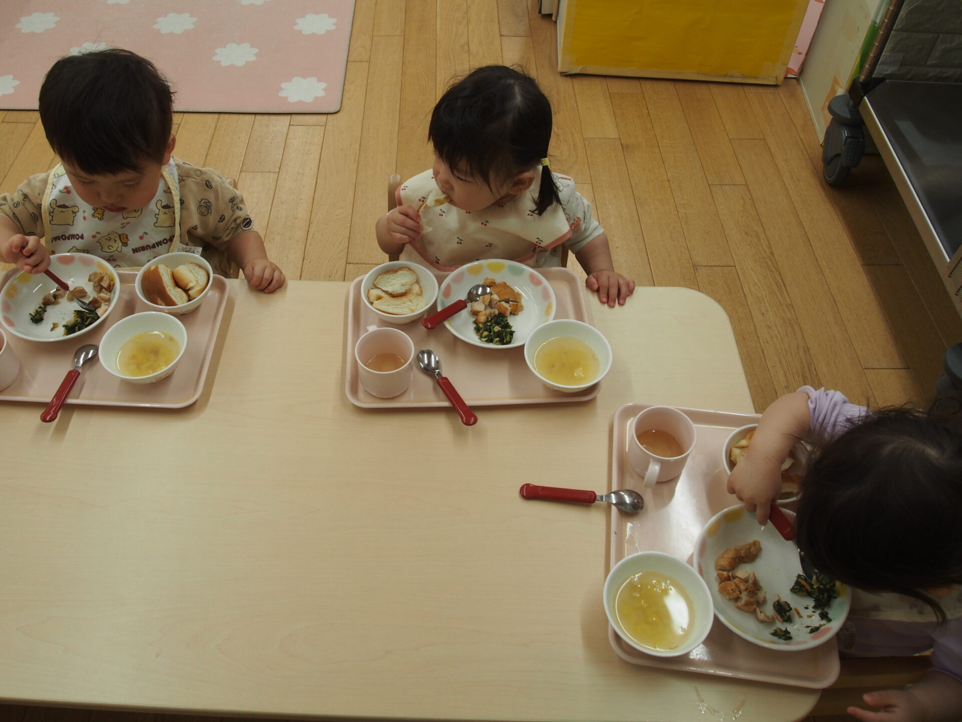 スプーンを握ってお皿に手を添えて、ひとりで完食できることも増えてきました。(ミルクを飲んでいた頃が懐かしいですね☺️)