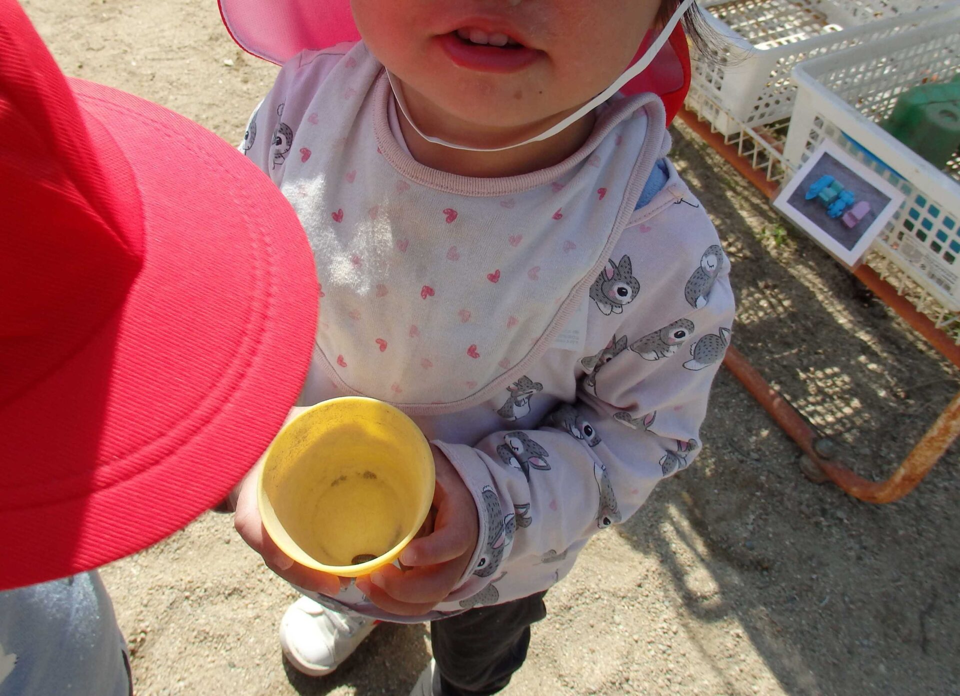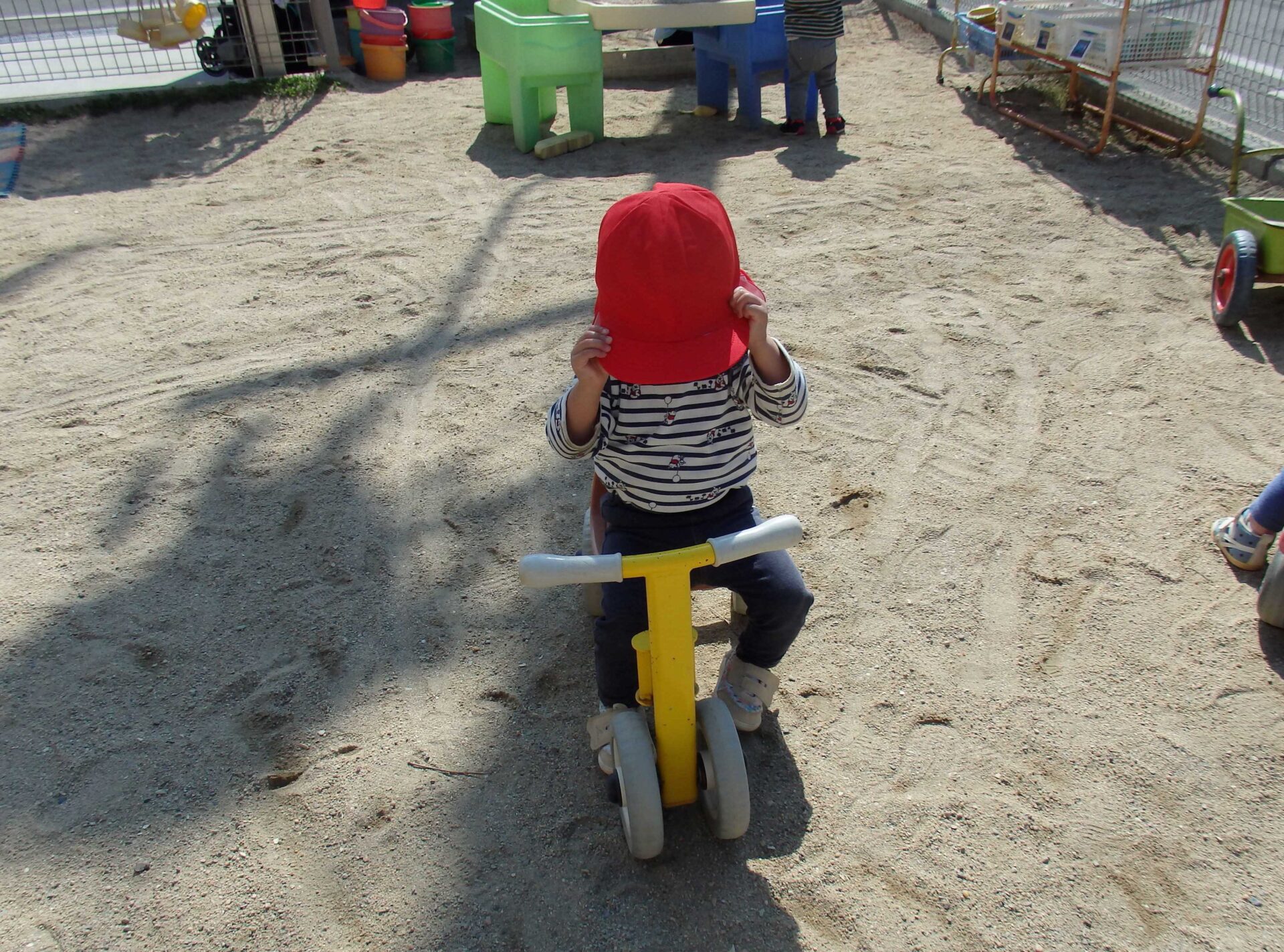 ふと辺りを見渡すと、なにやら帽子で隠れたまま保育士の方を見つめる子が。