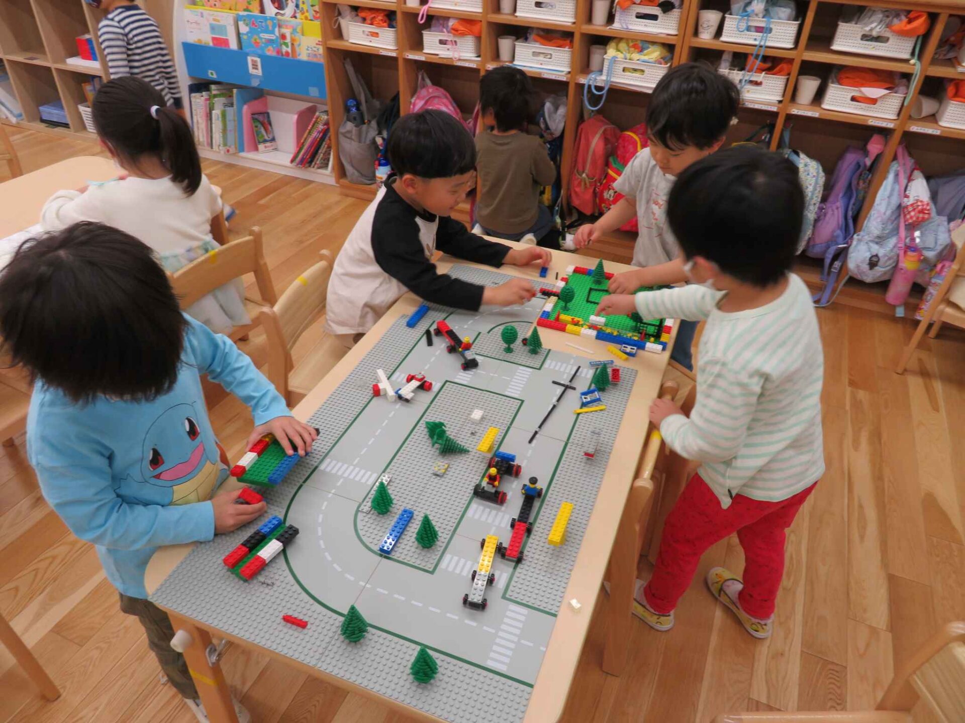 ミニブロックを使い、街を表現すると車を走らせ楽しんでいます。