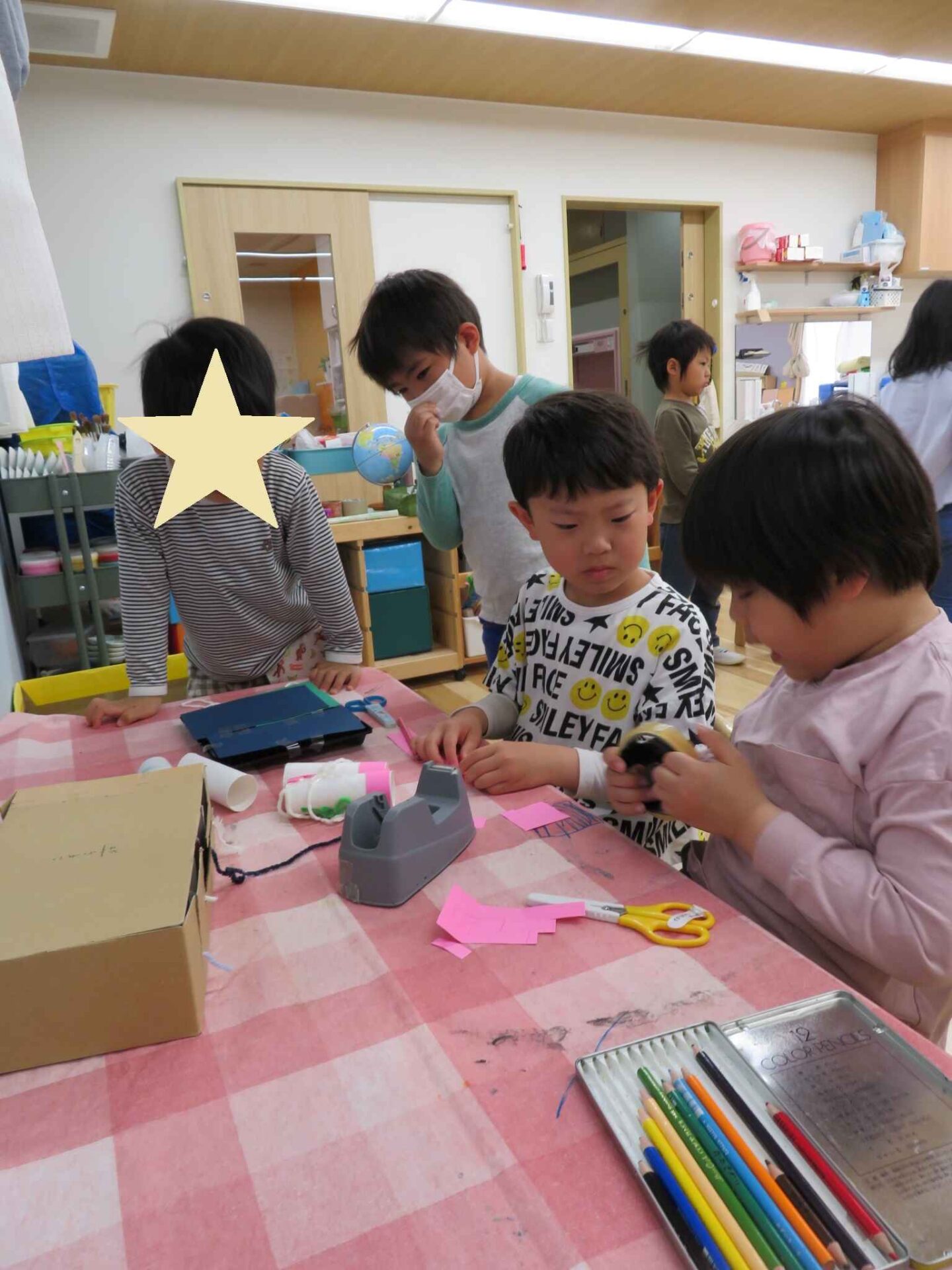 製作遊びでは、様々な廃材を使い自分がイメージした形を表現します。