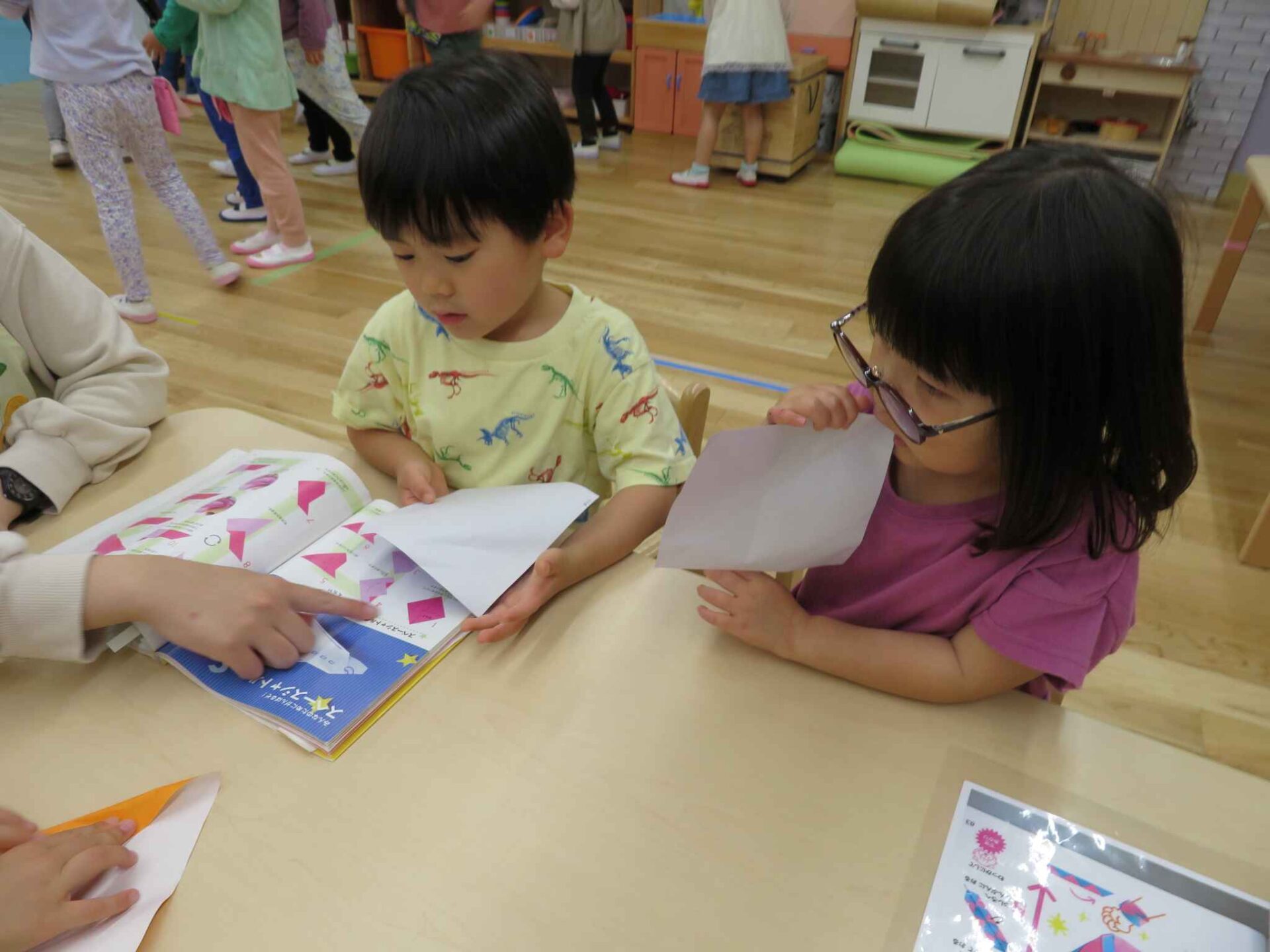 折り紙に興味がある4・5歳児の子ども達は、折り紙絵本を見て