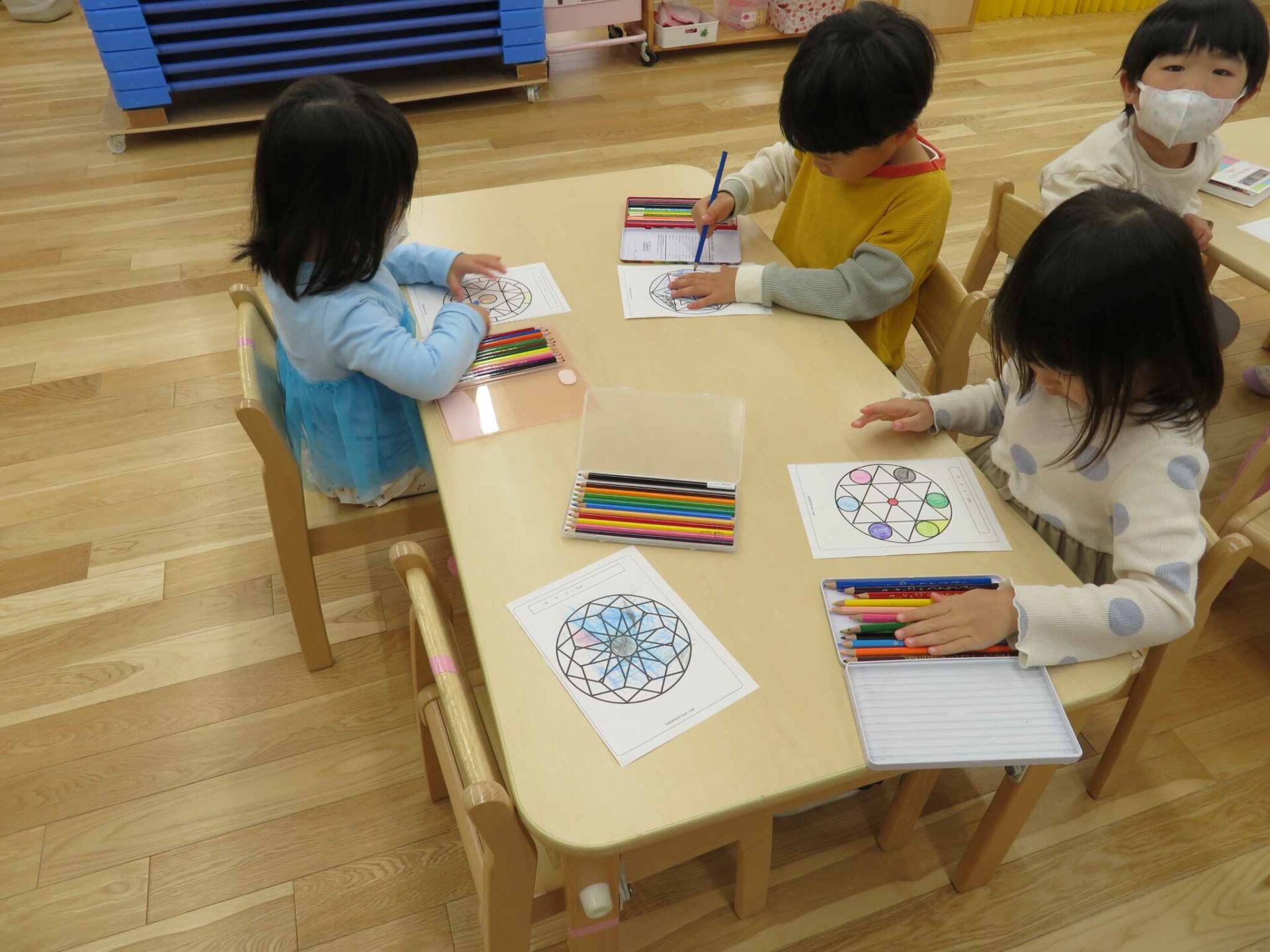 そら組の子ども達は、園庭に飾る大きなこいのぼりのうろこを作る為に幾何学模様の塗り絵に挑戦しました。