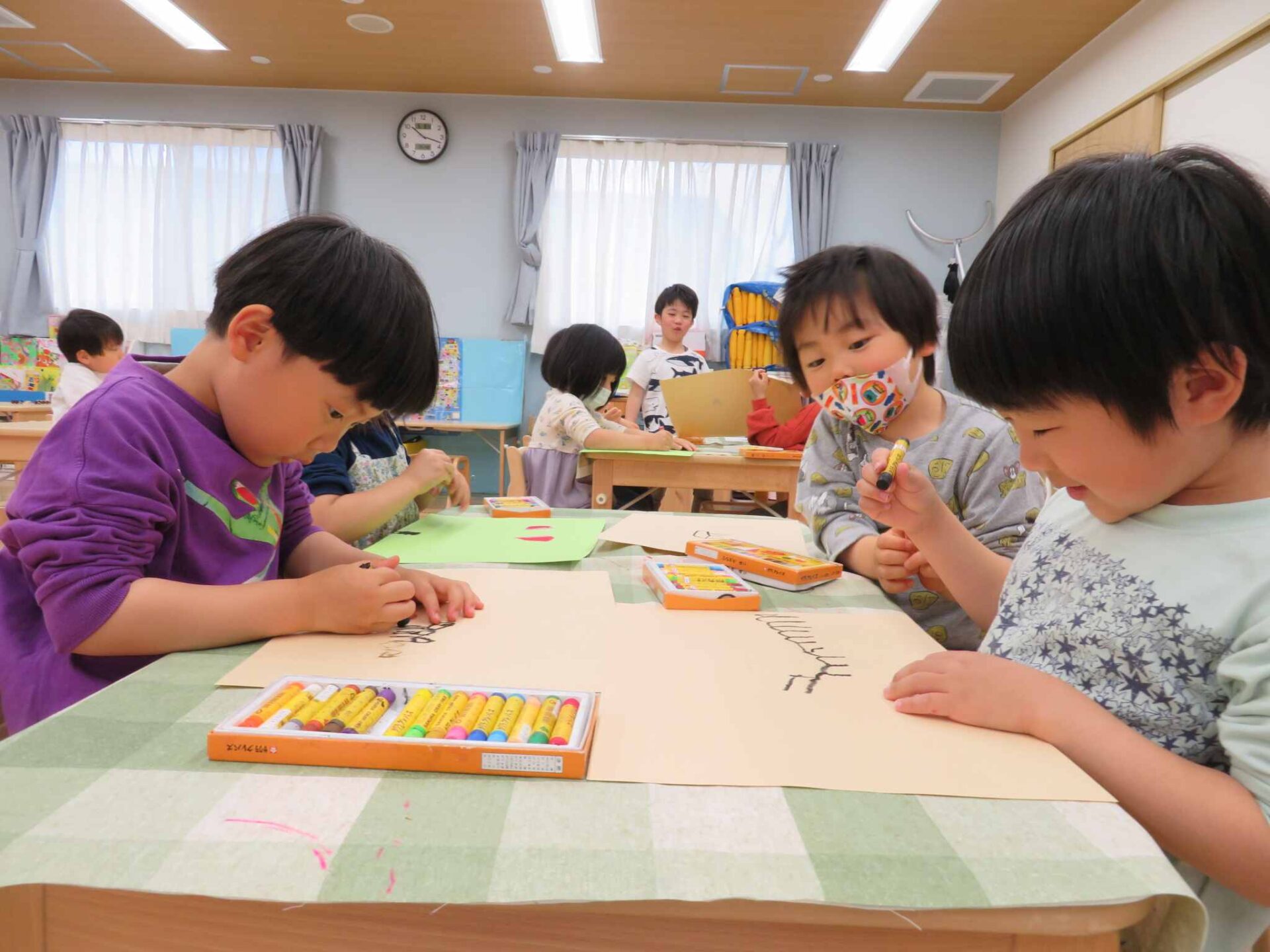 思い出した後には、2色の中から好きな色の画用紙を選びクレパスでお絵かきがスタート♪