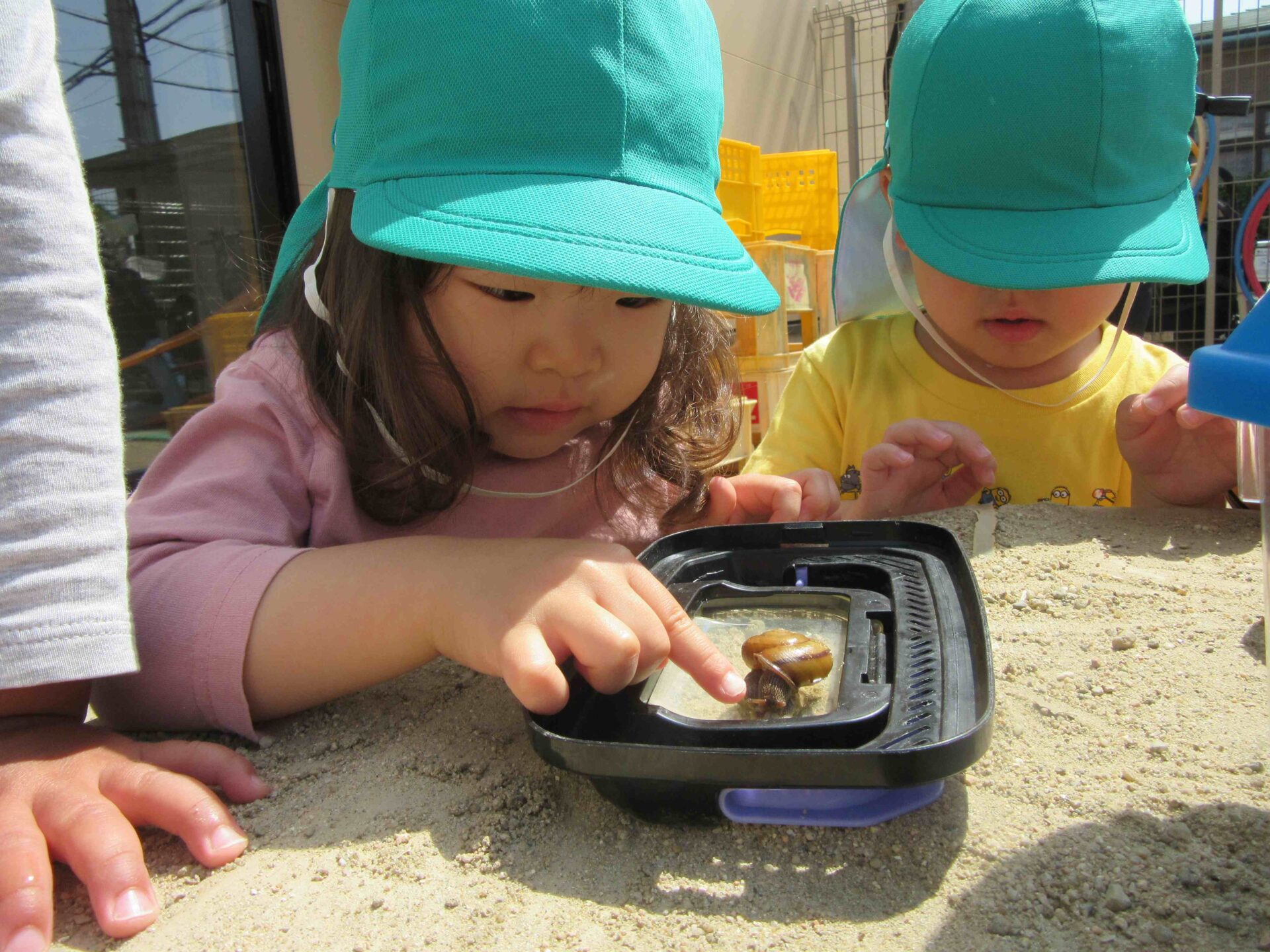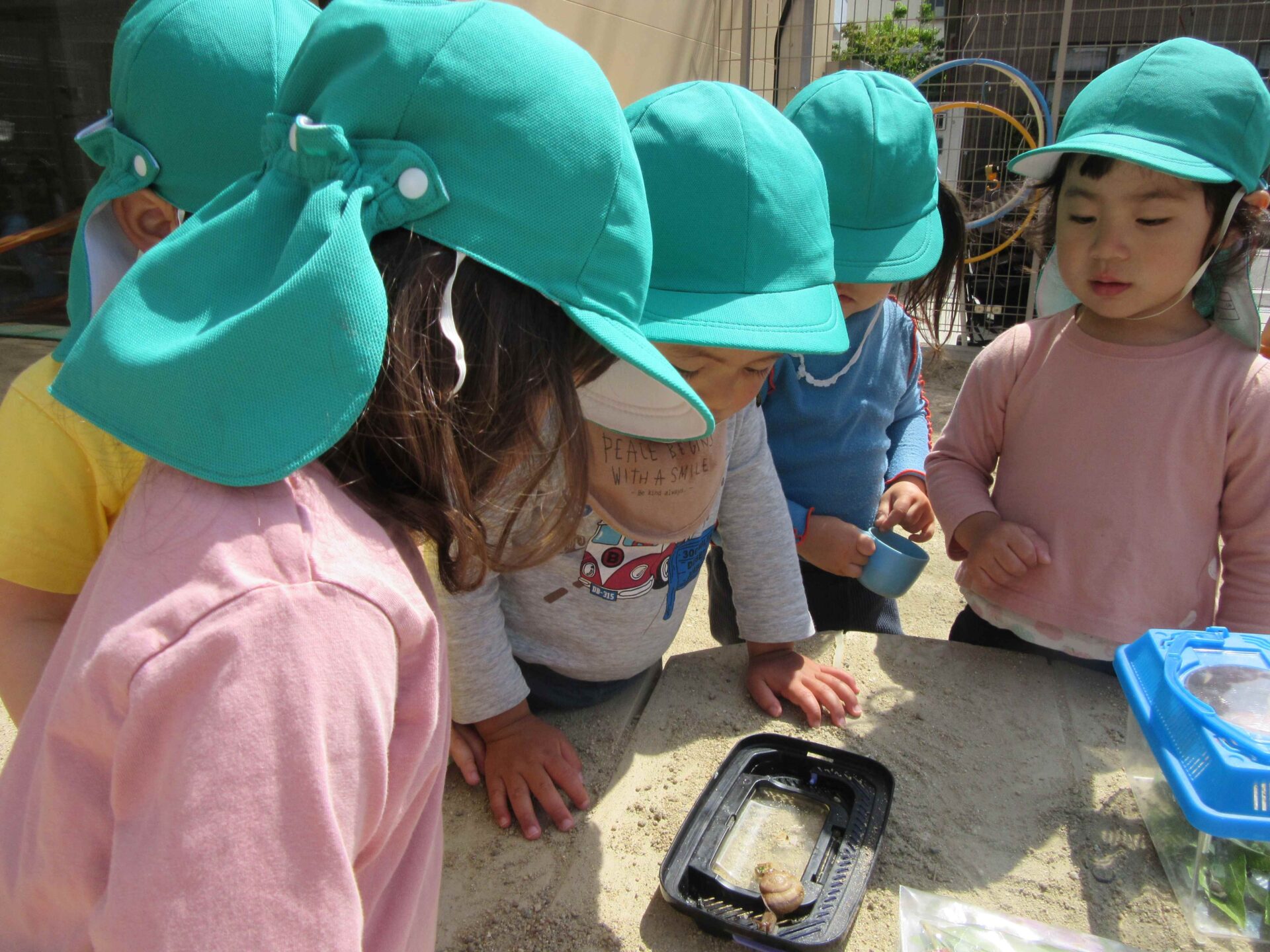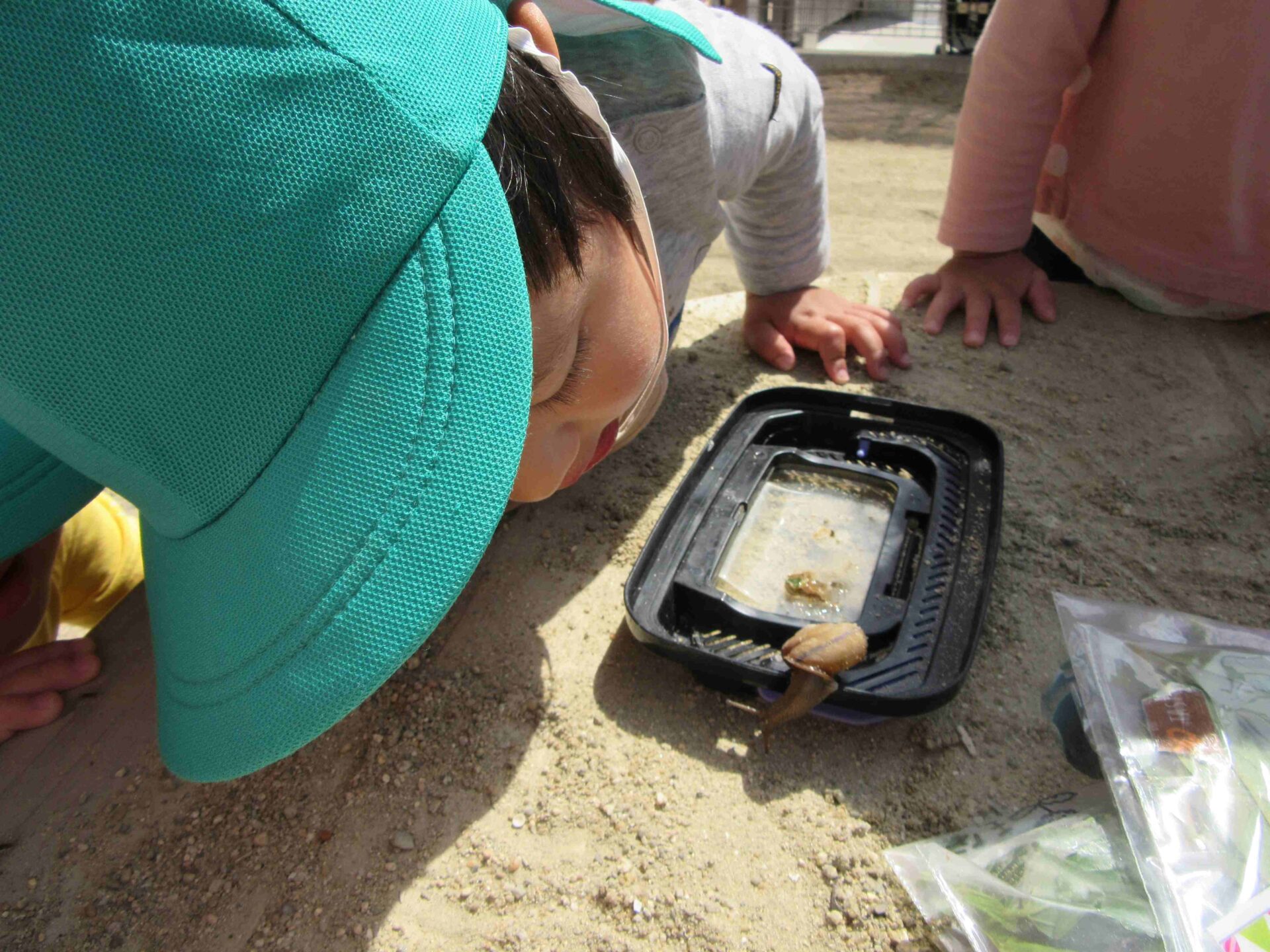 そして飼育ケースからカタツムリを出すと「待ってました!」と言わんばかりにニョロニョロと動き出し、子ども達はカタツムリの動きに釘付けでした!