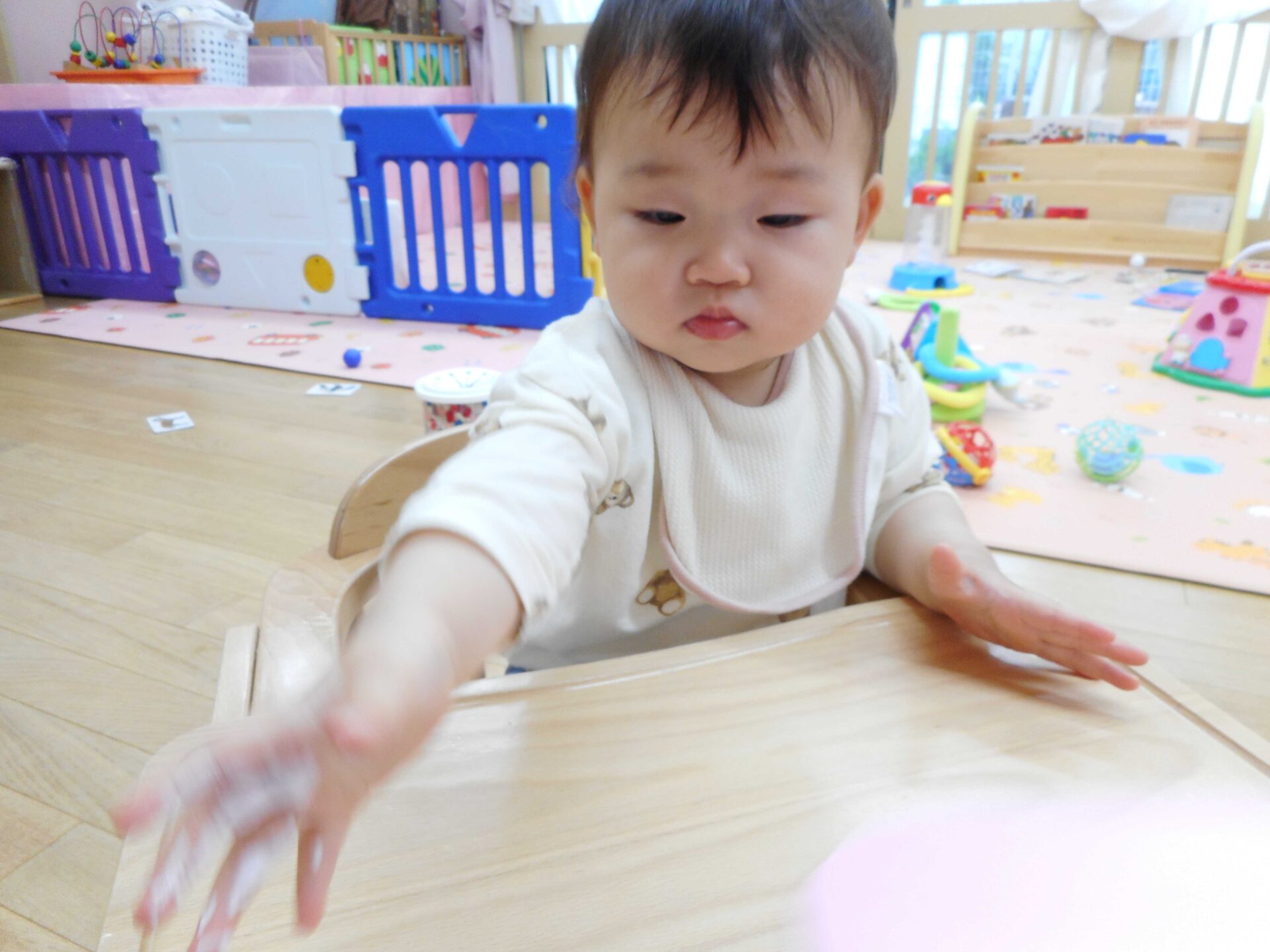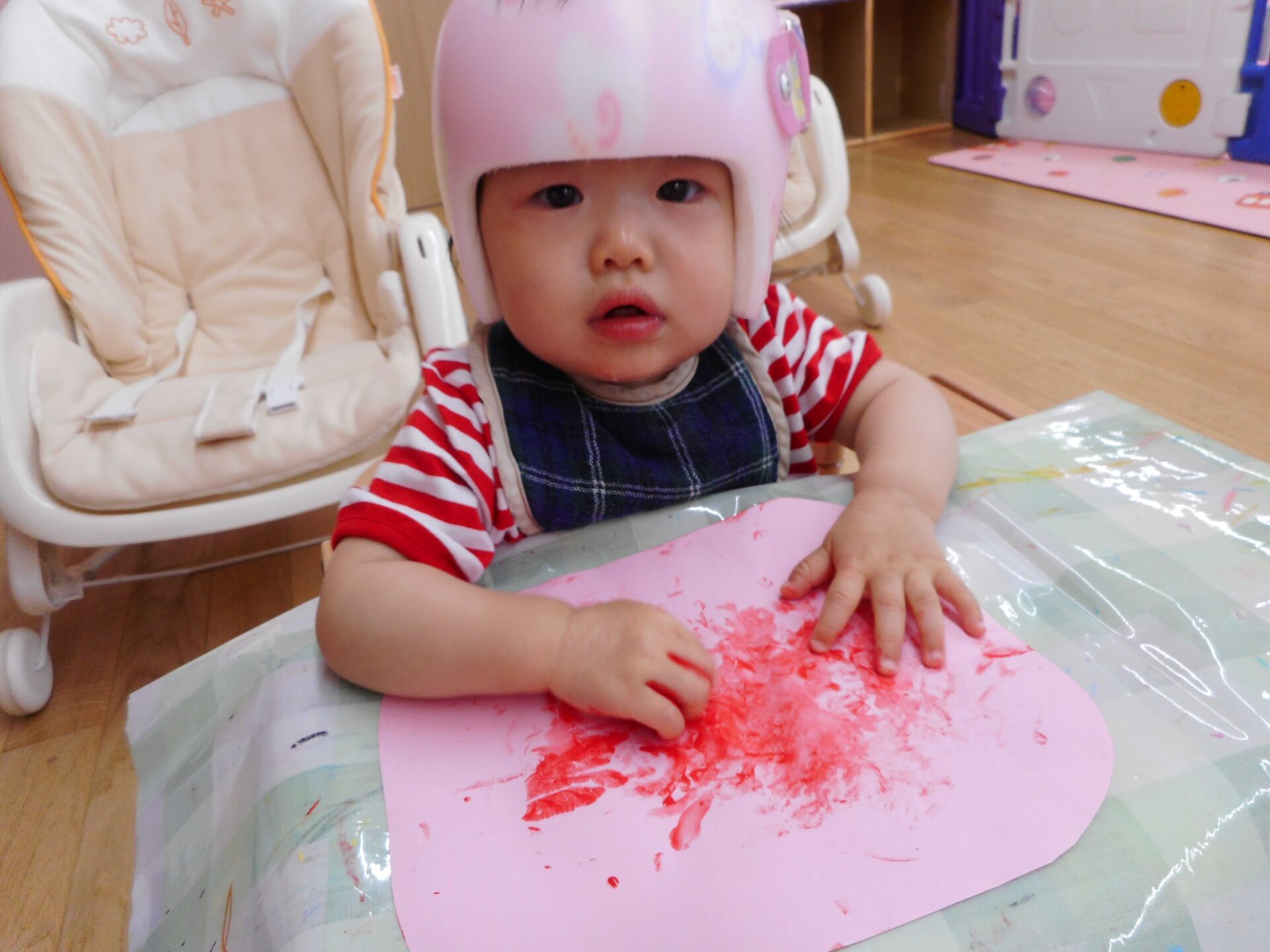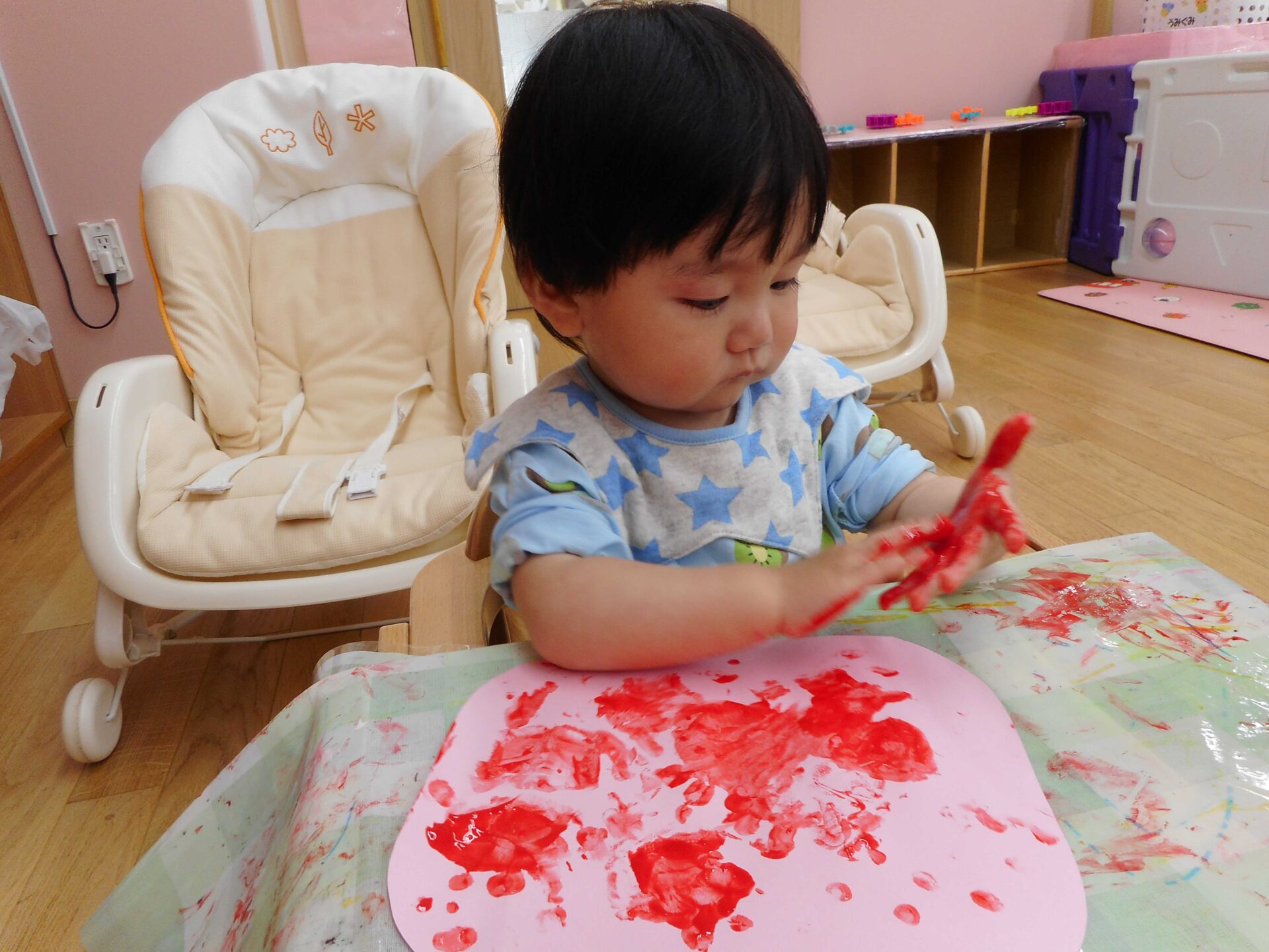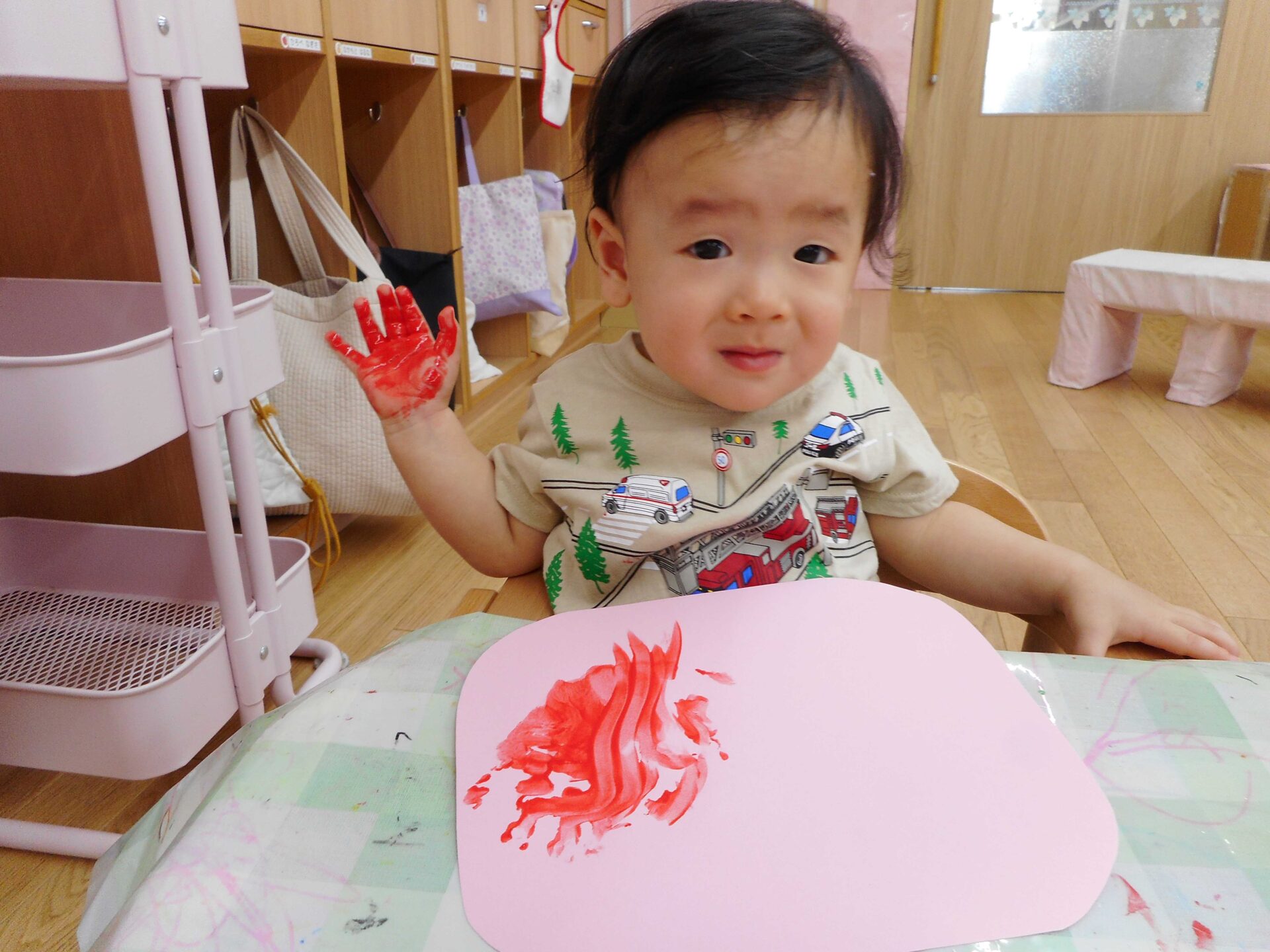 画用紙に絵の具が付く度に、保育者の顔を見て「できたよ!」と得意気な顔になっていました。