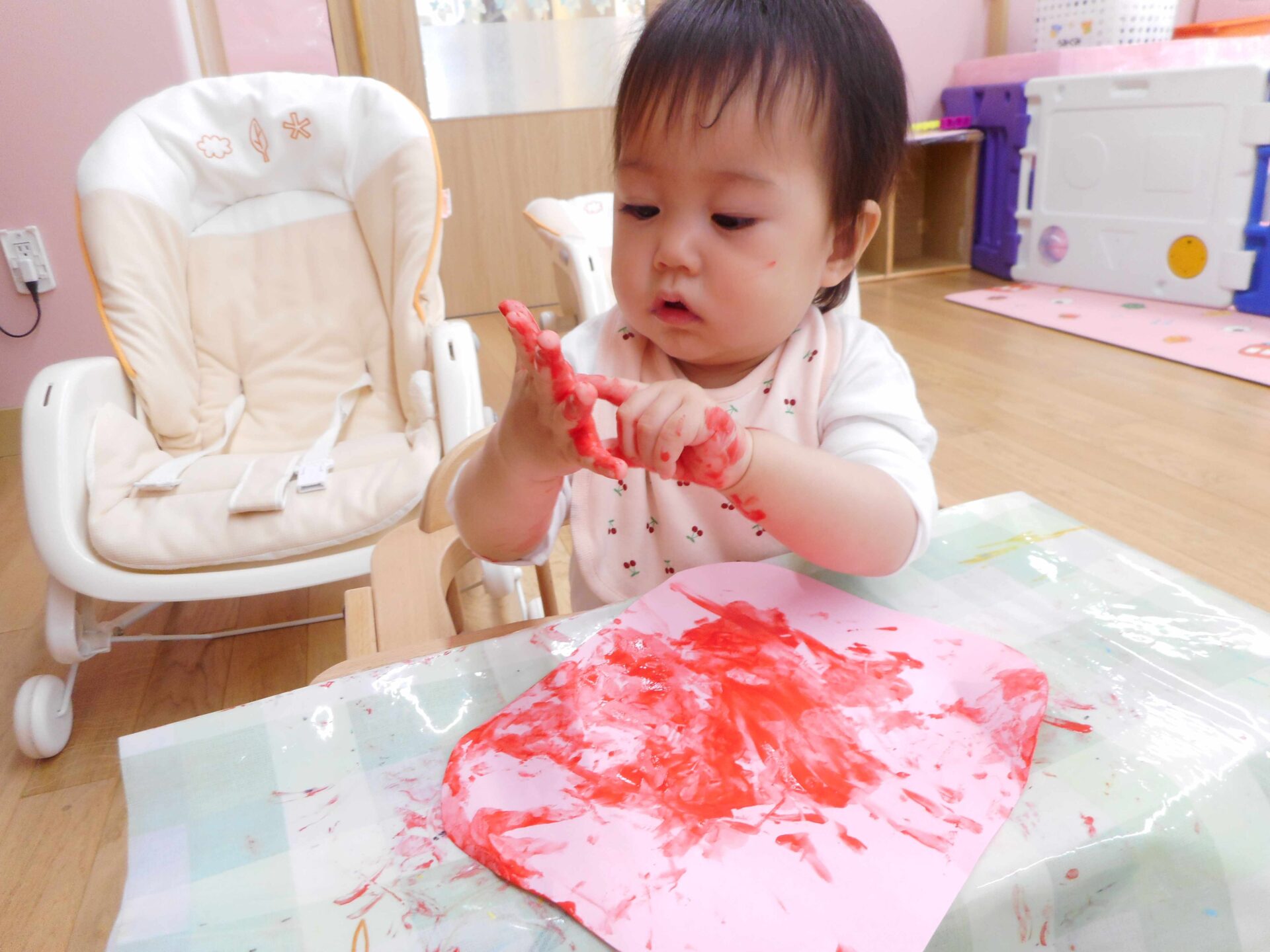 絵具を使ってイチゴミルクを作ったよ!(0歳児)