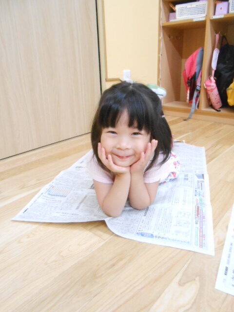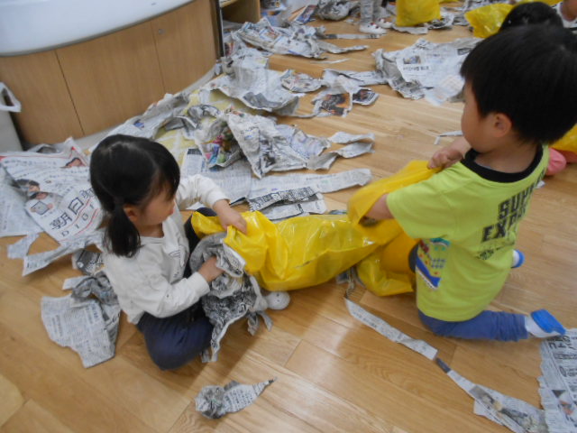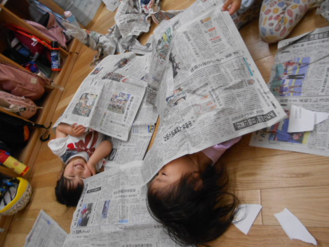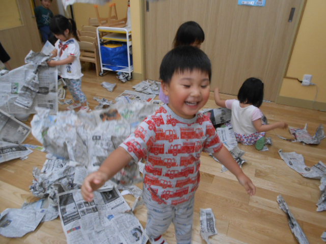 お友だちと新聞の雨をかけあって大笑いの子ども達です。