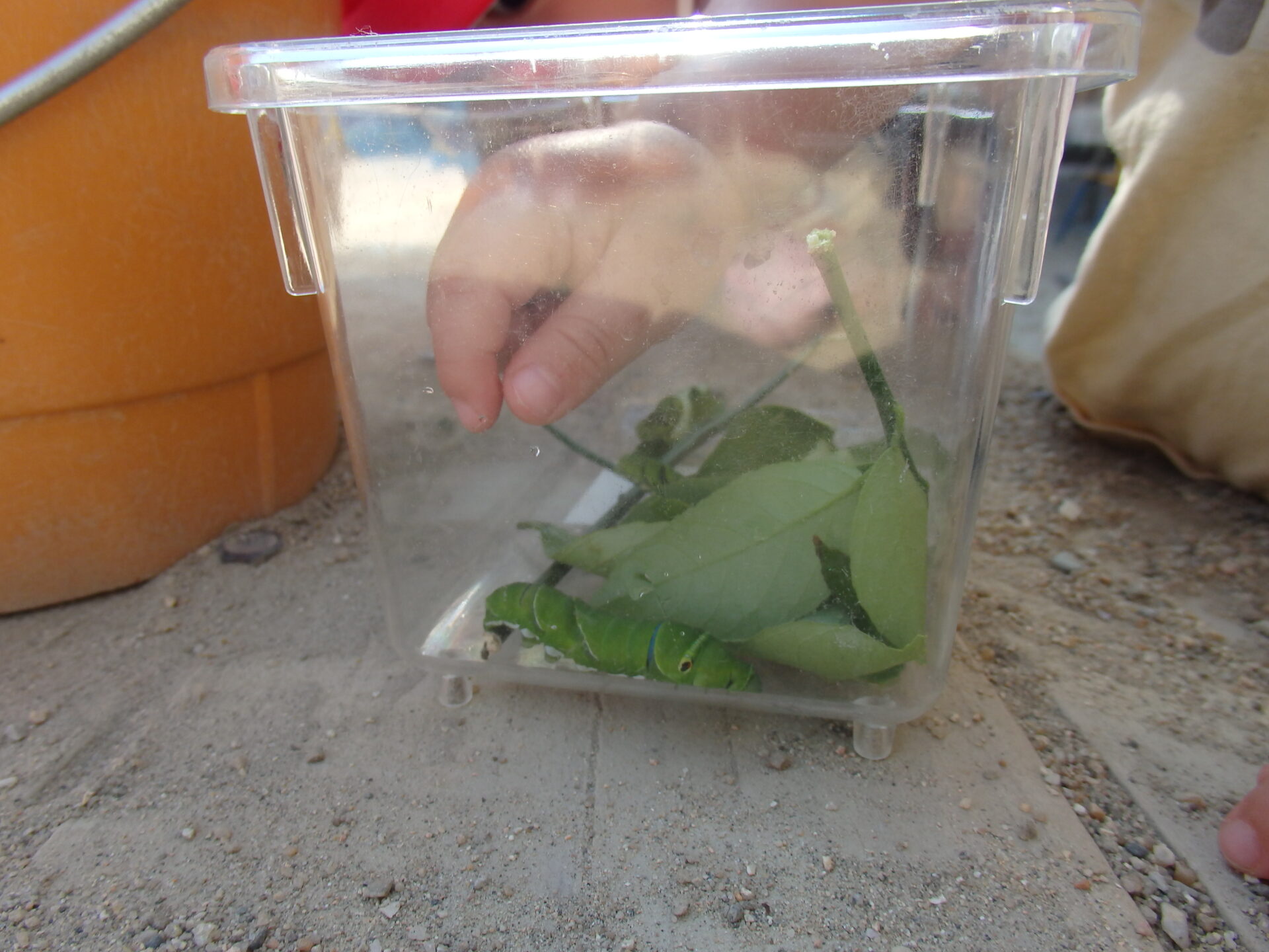 始めの頃の小さい青虫は撮れませんでしたが、毎日園庭に出るたび新鮮なレモンの葉っぱをあげていた子ども達♪
