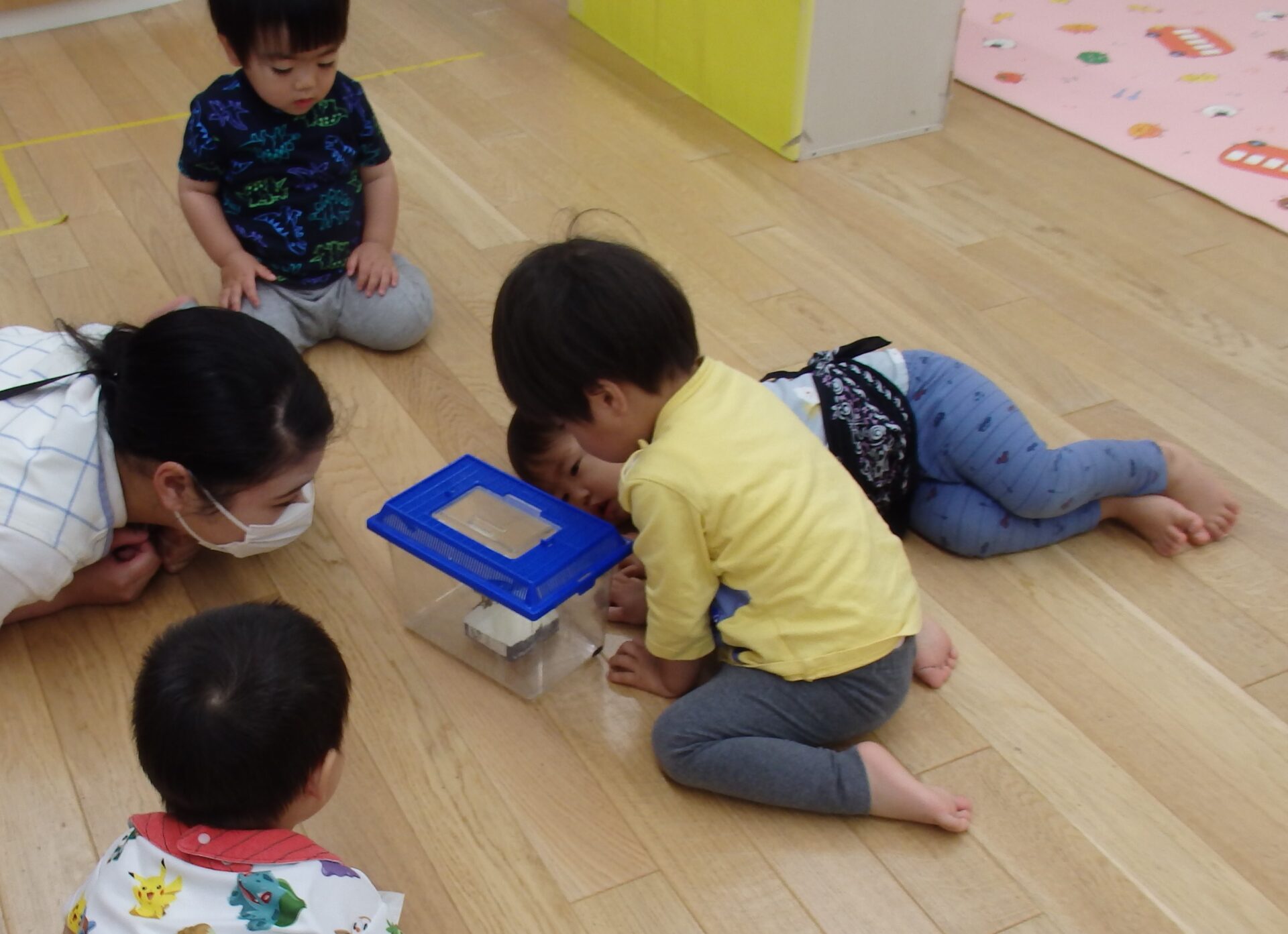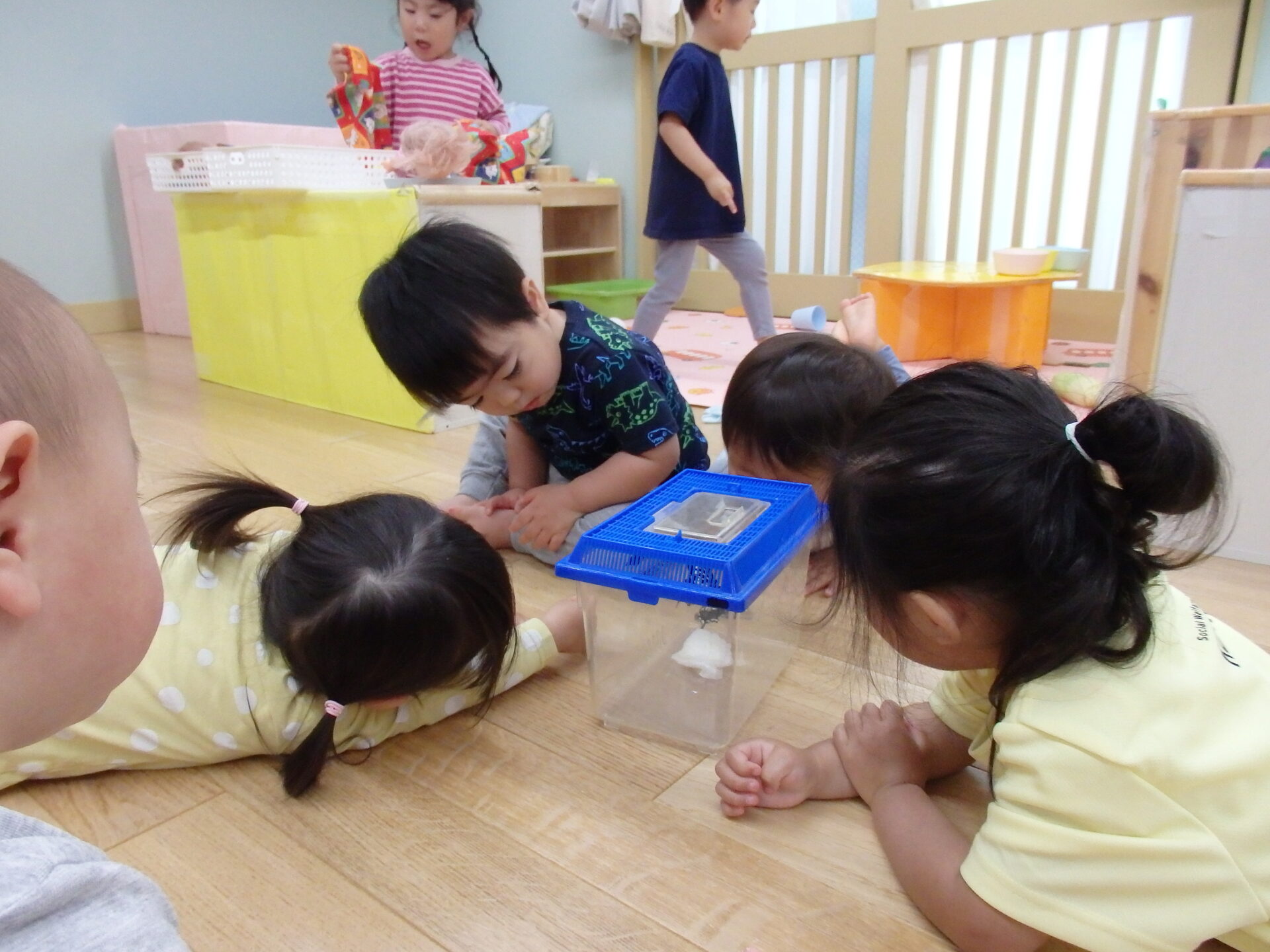 元気よく動く青虫に興味津々な様子だったので、保育士が手に取って子ども達の目の前まで連れてくると嬉しそうに触ろうとする姿や、中には一歩引いて見守る姿もありました・・。