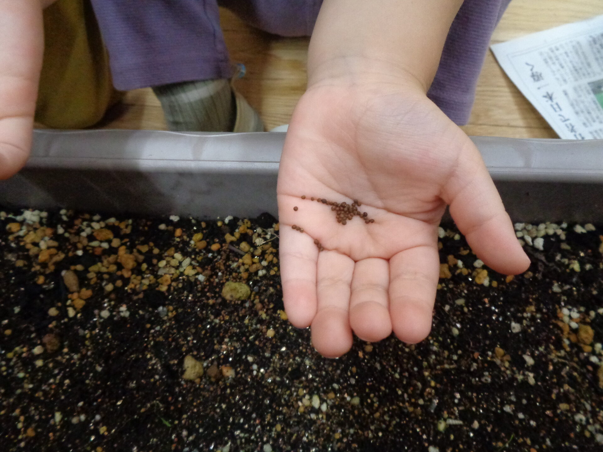 「大葉の種は小さいから、手でお皿を作って大事に持ってね」と伝えるとみんな上手に手でお皿を作ります。種を見て「小さいね~!」「つぶつぶ!」と友だち同士で話していました。