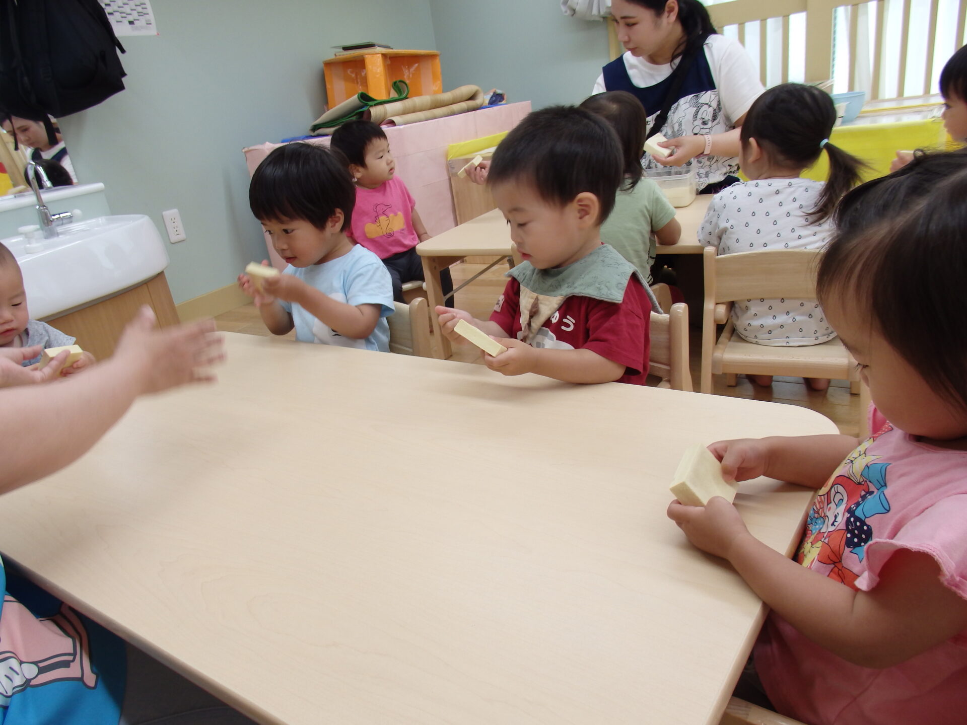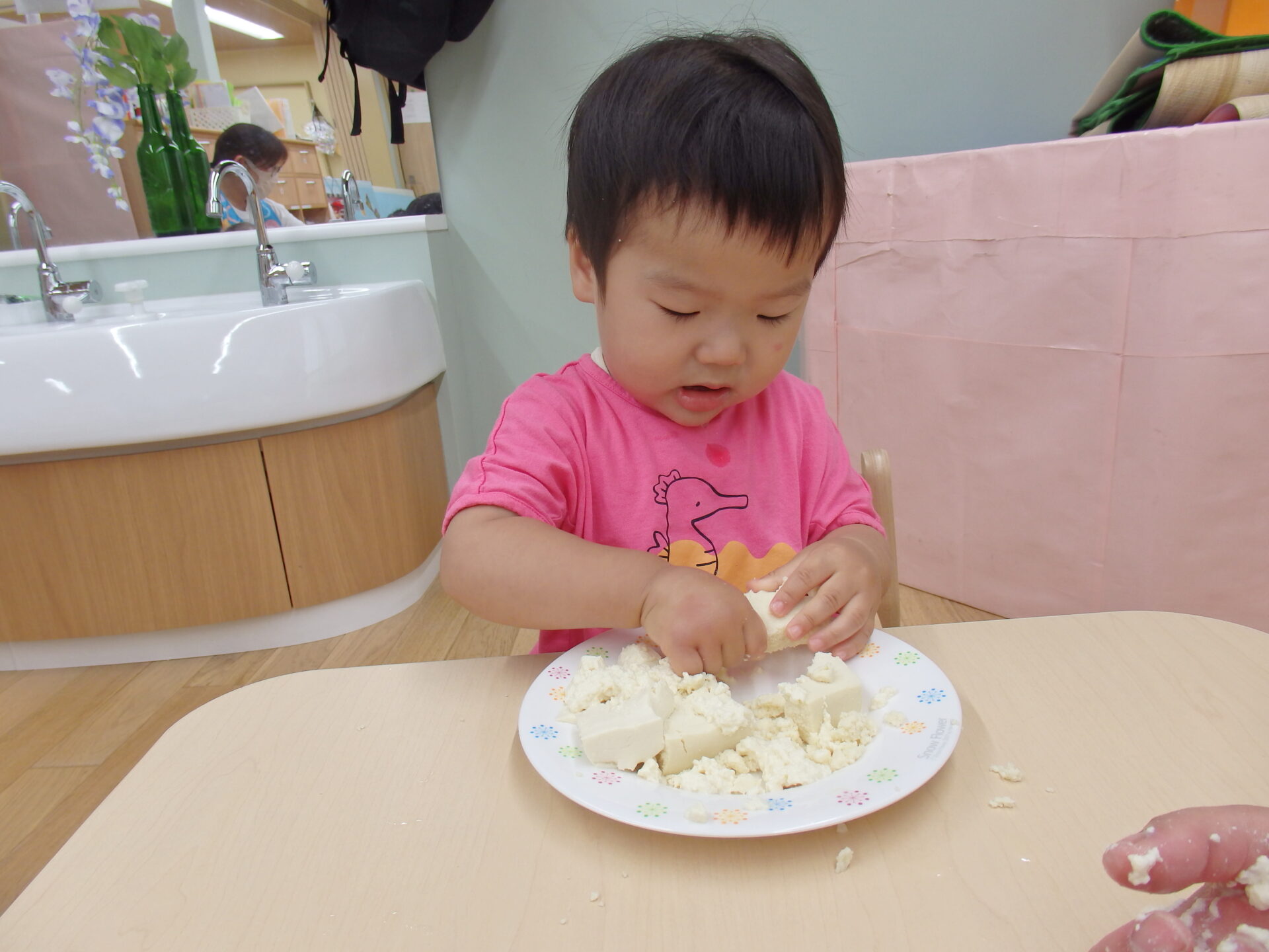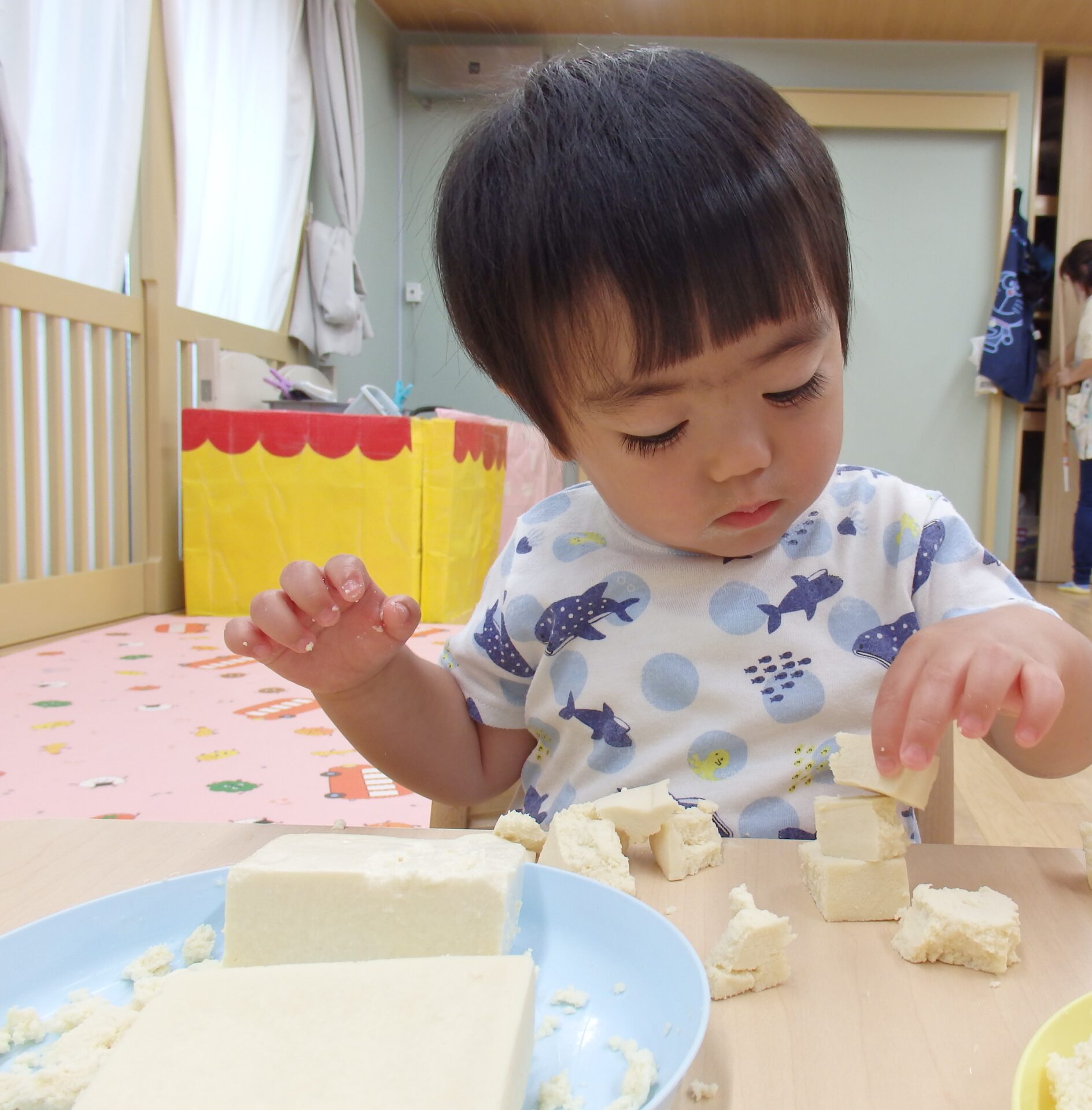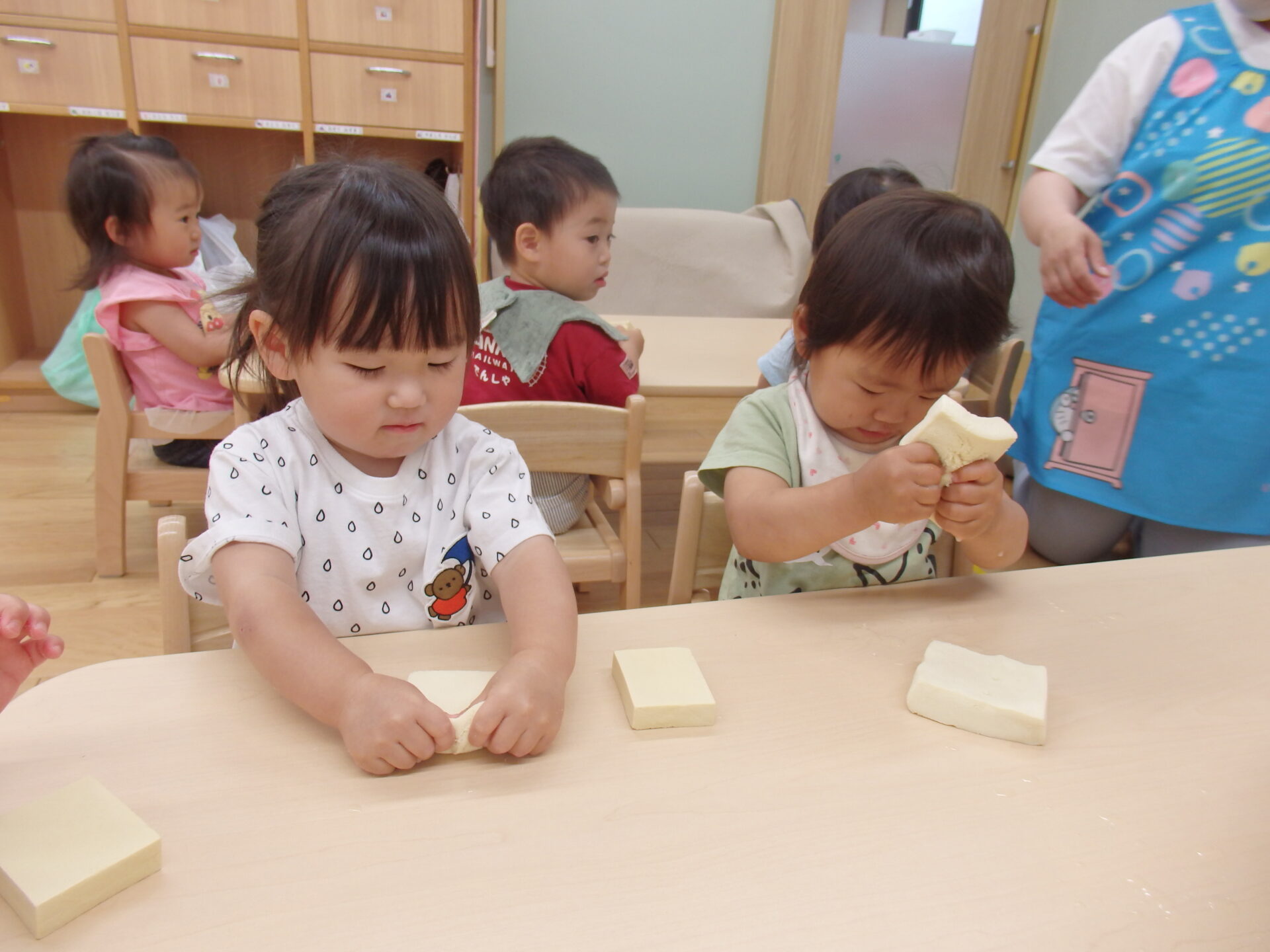 イメージを膨らませながら、どんなものにも興味津々でなんでも触ってみたいだいち組の子どもたちです。高野豆腐や小麦粉粘土のほかにもいろいろなものに触れて、感触をたのしみながら手指の感覚や五感を育てていきたいと思います☺