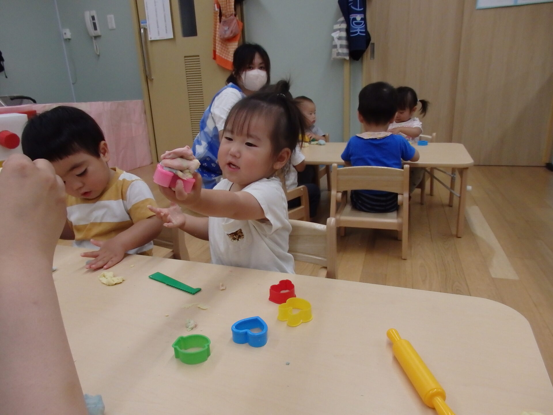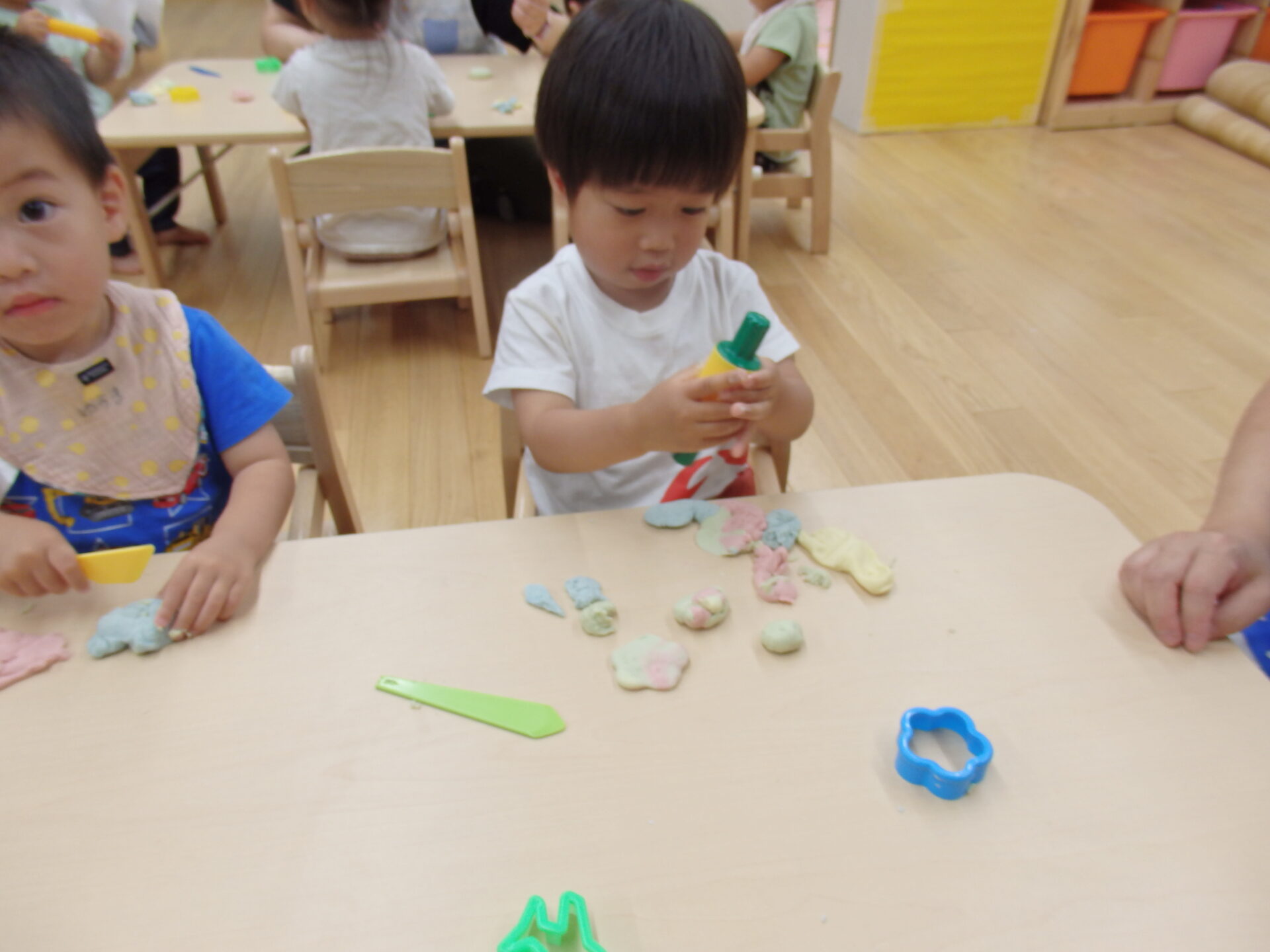 いろんな色の粘土を混ぜて、粘土用のめん棒や型抜きを使って遊んでいます。