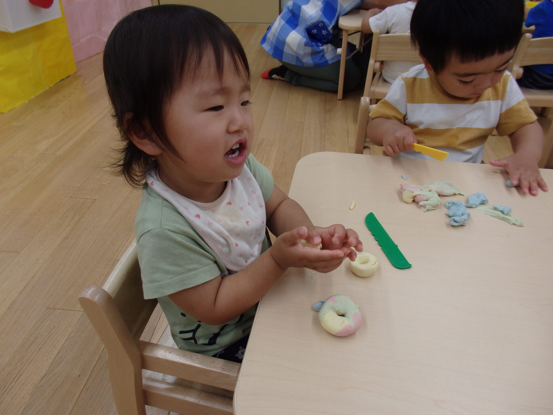保育士に「ドーナツ作って」とリクエスト。保育者が作ったものを見ながら同じようにドーナツづくりに挑戦中です♪