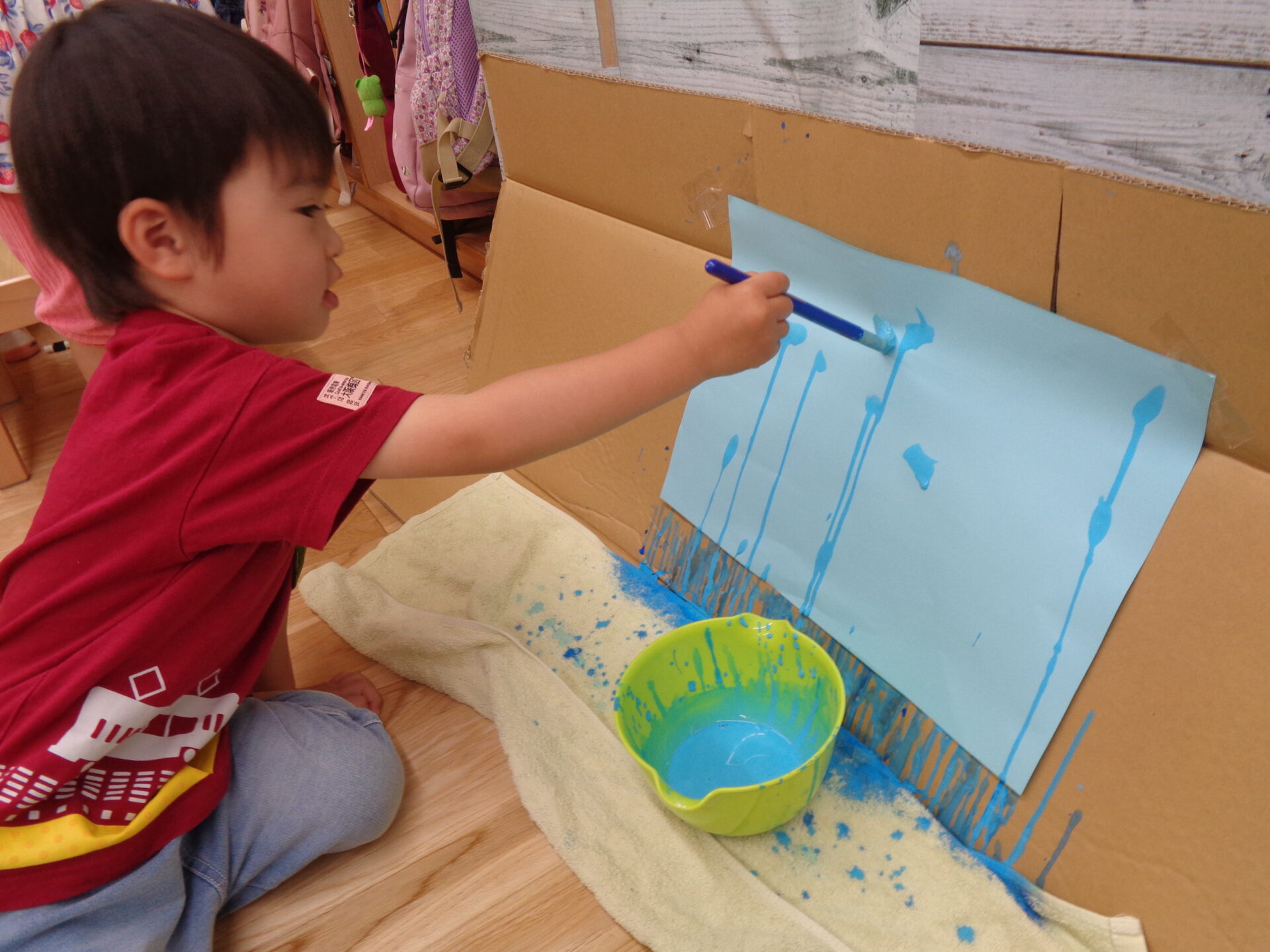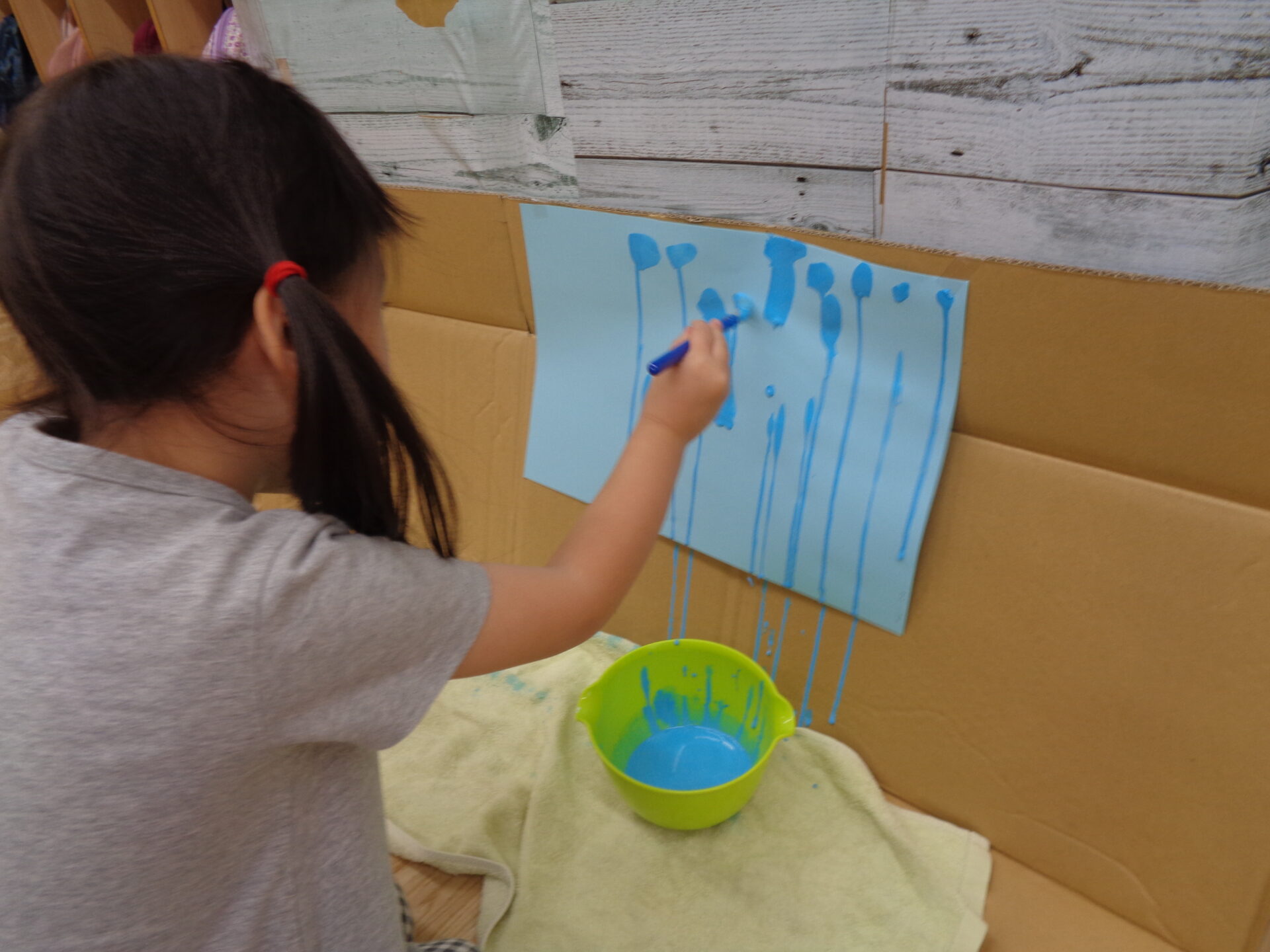 筆に水色や青の色水を含ませて、画用紙に押し付けると、色水が垂れて雨のようになっていきます。