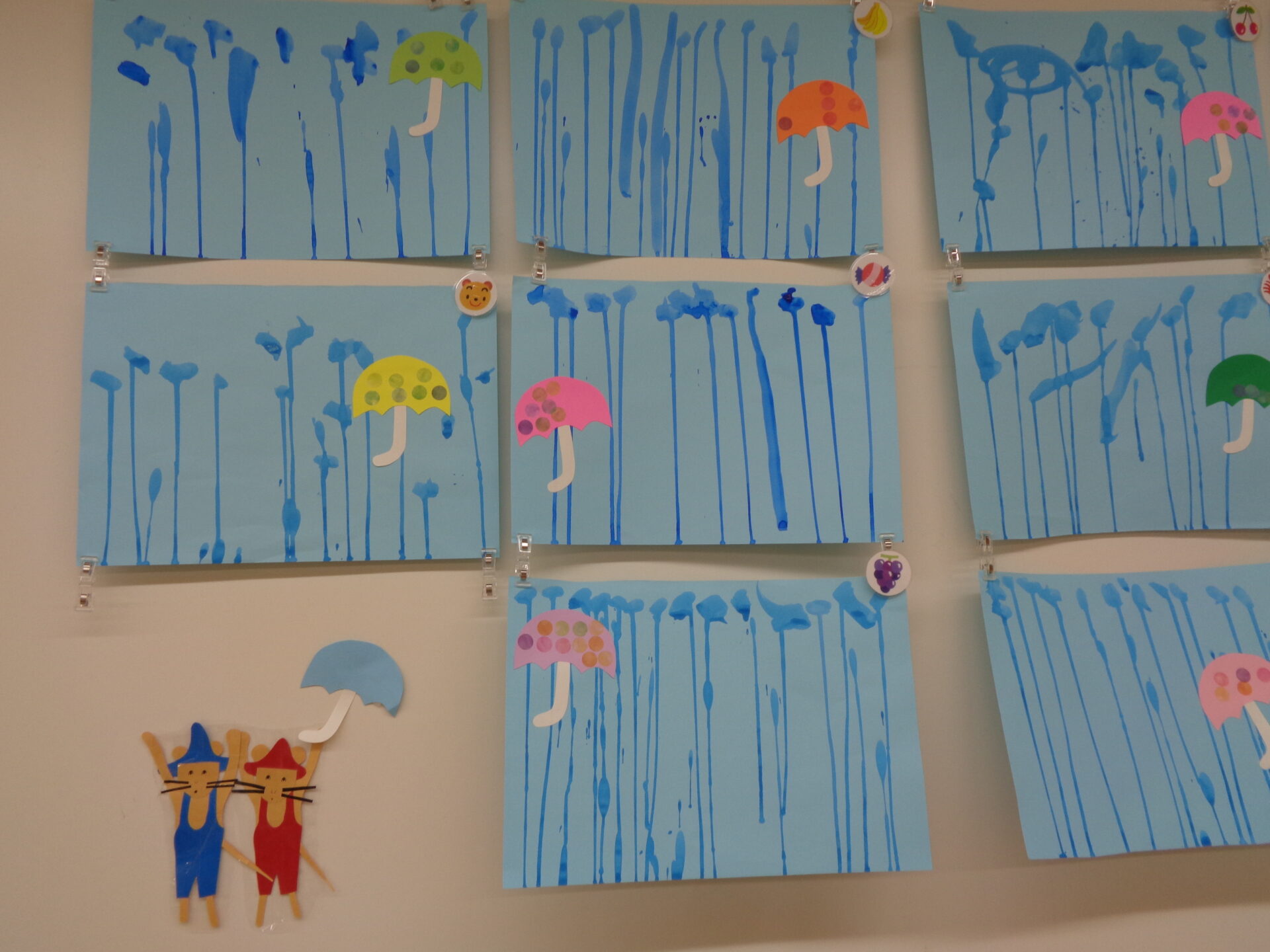 にじ組の壁が大雨になりましたが、ぐりとぐらも傘をさして嬉しそうです!