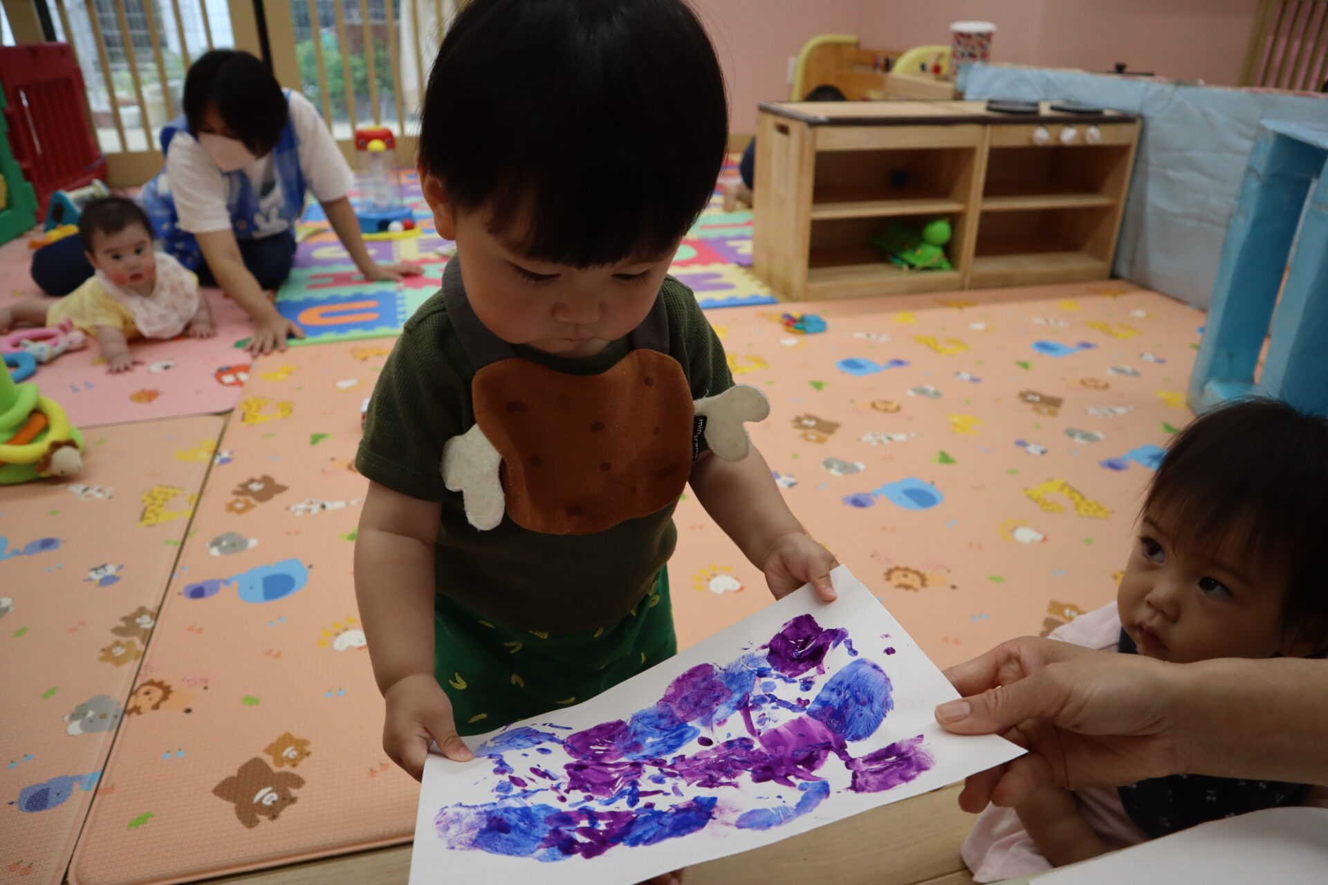 青と紫の絵の具を使って、自由に手の平の絵の具を画用紙に色付けしていきます。