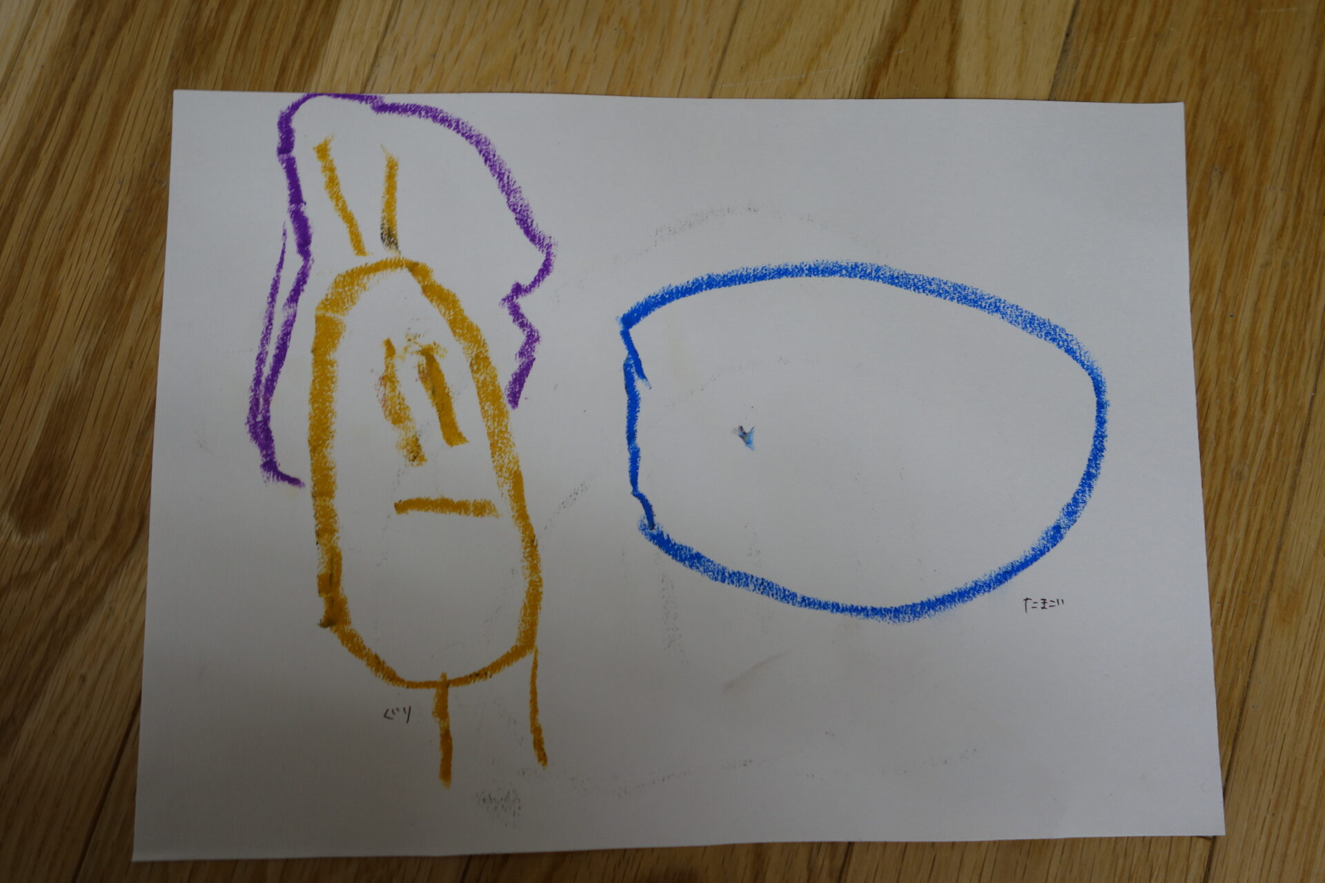 「ぐりとぐらが楽しかった!ぐりの絵描きたい。これは卵!大きな卵を見つけたの。」