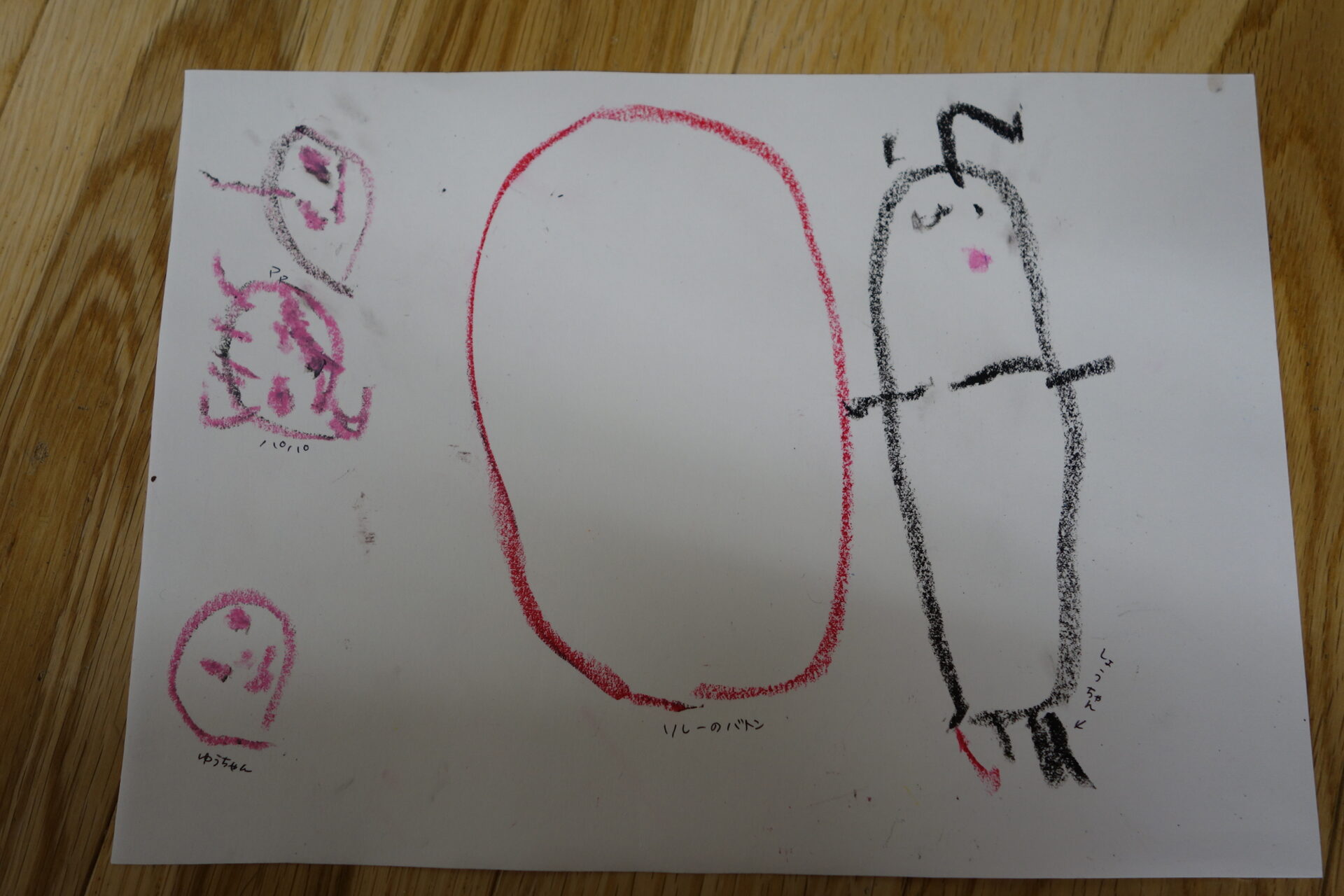 「リレーとぐりとぐら楽しかった!どっちを描こうかな!リレーにする!赤いバトン持って走った!ママとパパと弟が見てくれたよ。」