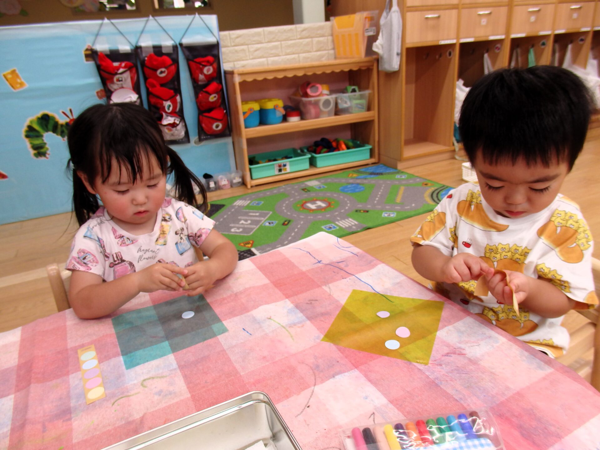 折り紙を渡すと透けるのが不思議だったようで、顔に当てて視界の色が変わるのを楽しむ可愛い姿も見られました。