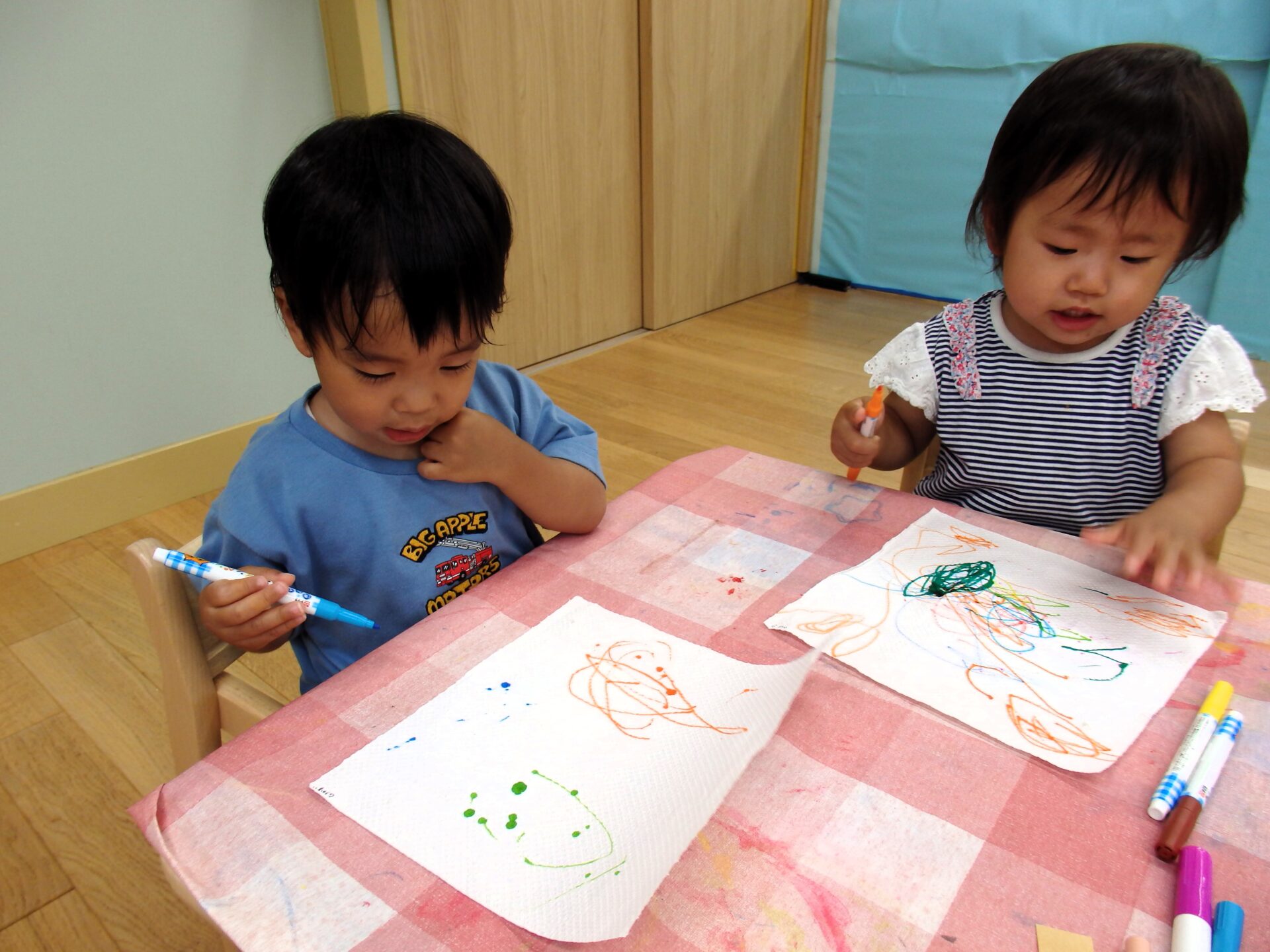 始めに「ギュって力を入れて描くと破れちゃうから気を付けようね」と話をすると、何人かは慎重に描き進めていく姿が見られました✨