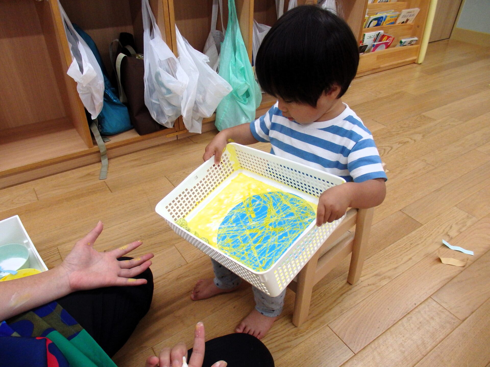 カゴの中に、絵の具をつけたビー玉と画用紙をセット!