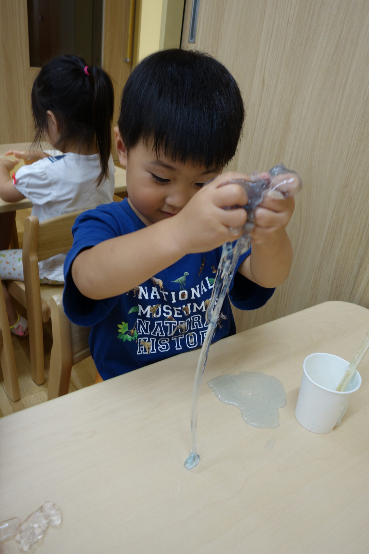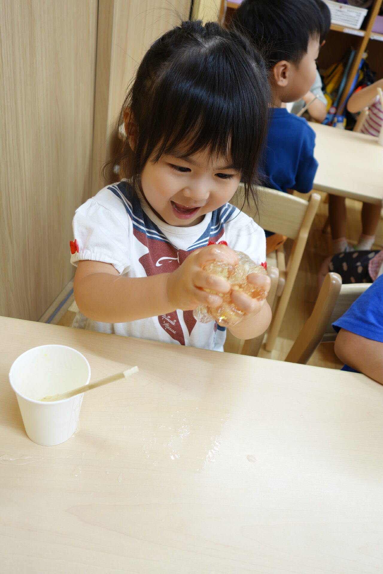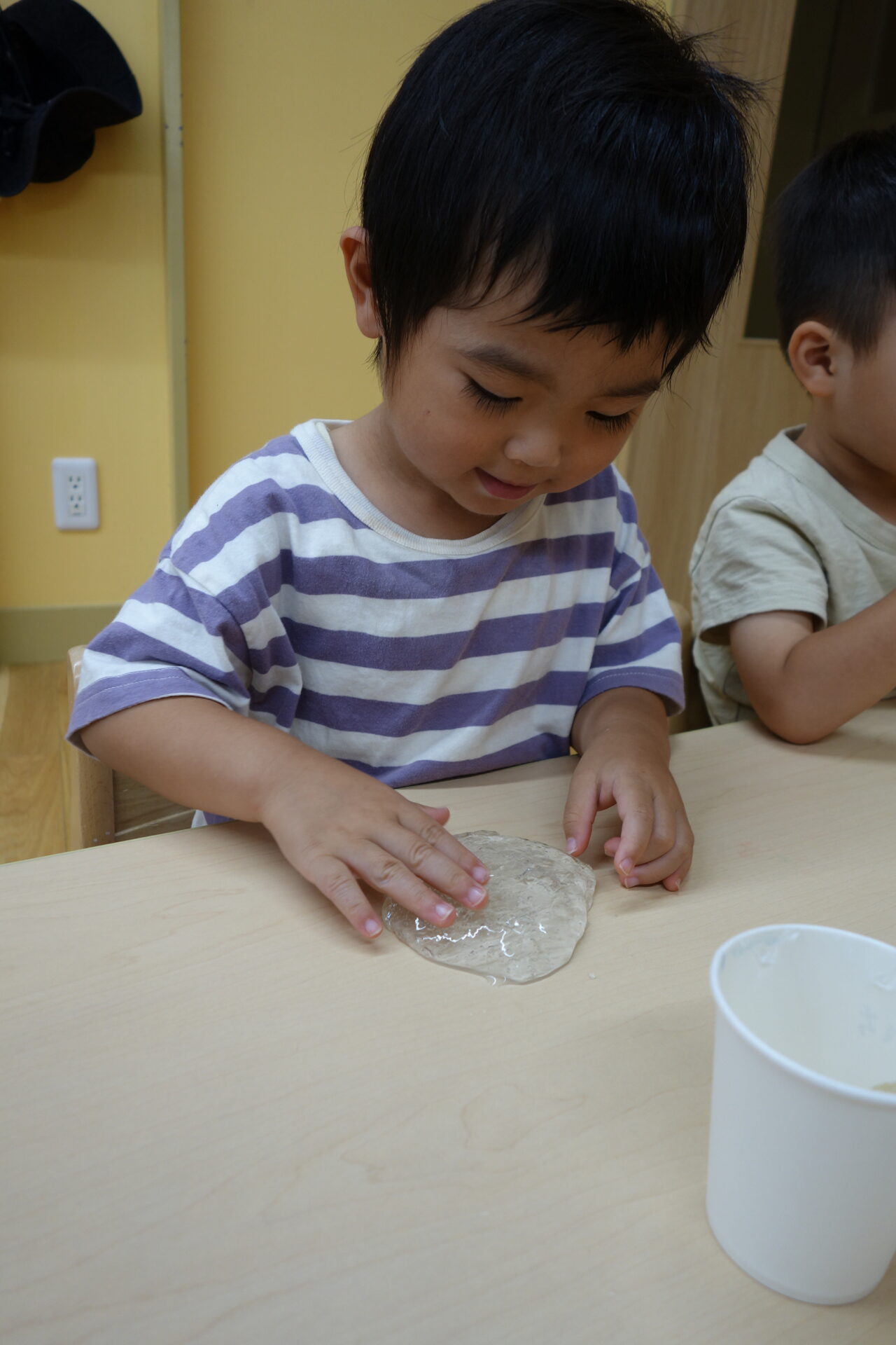 お部屋でスライム遊びをしました。作り方は簡単です!紙コップに