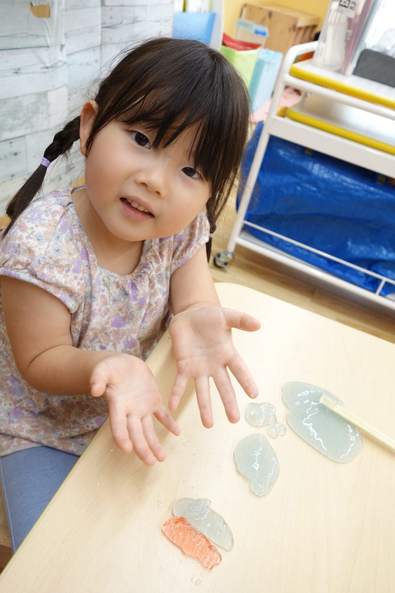 赤と青のスライムを並べて「ぐりとぐらだよ!」と見立てて遊んだり、黄色と青のスライムを混ぜたら緑になった!と新しい発見があったり、子ども達なりの面白いアイディアでどんどん遊びが広がっていきました。