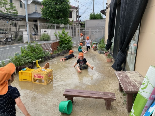 そこには、大きな水たまりの中に座ったり、寝転んだりする子ども達の姿が!